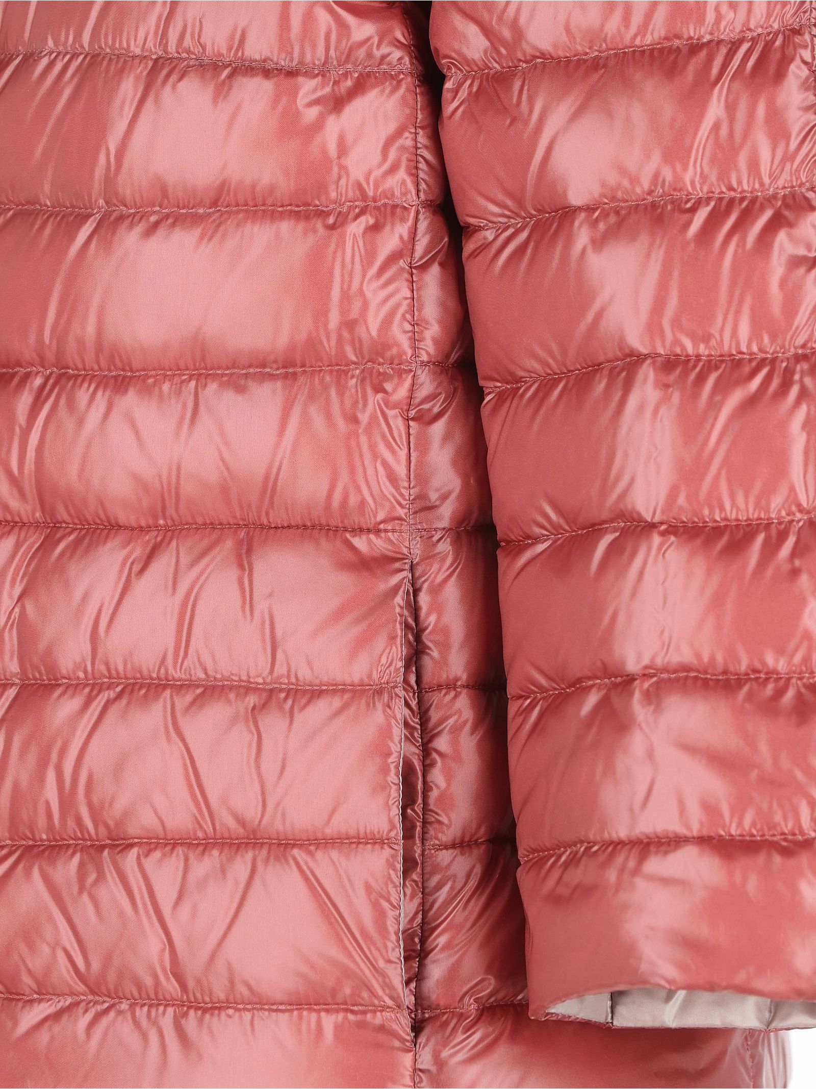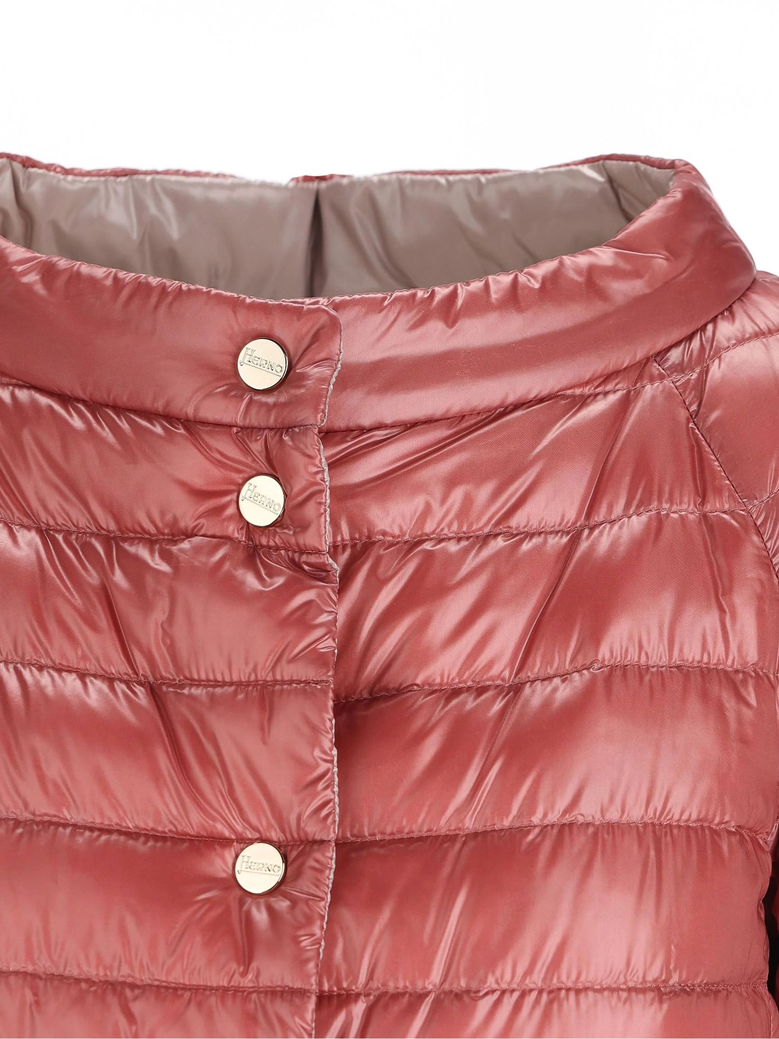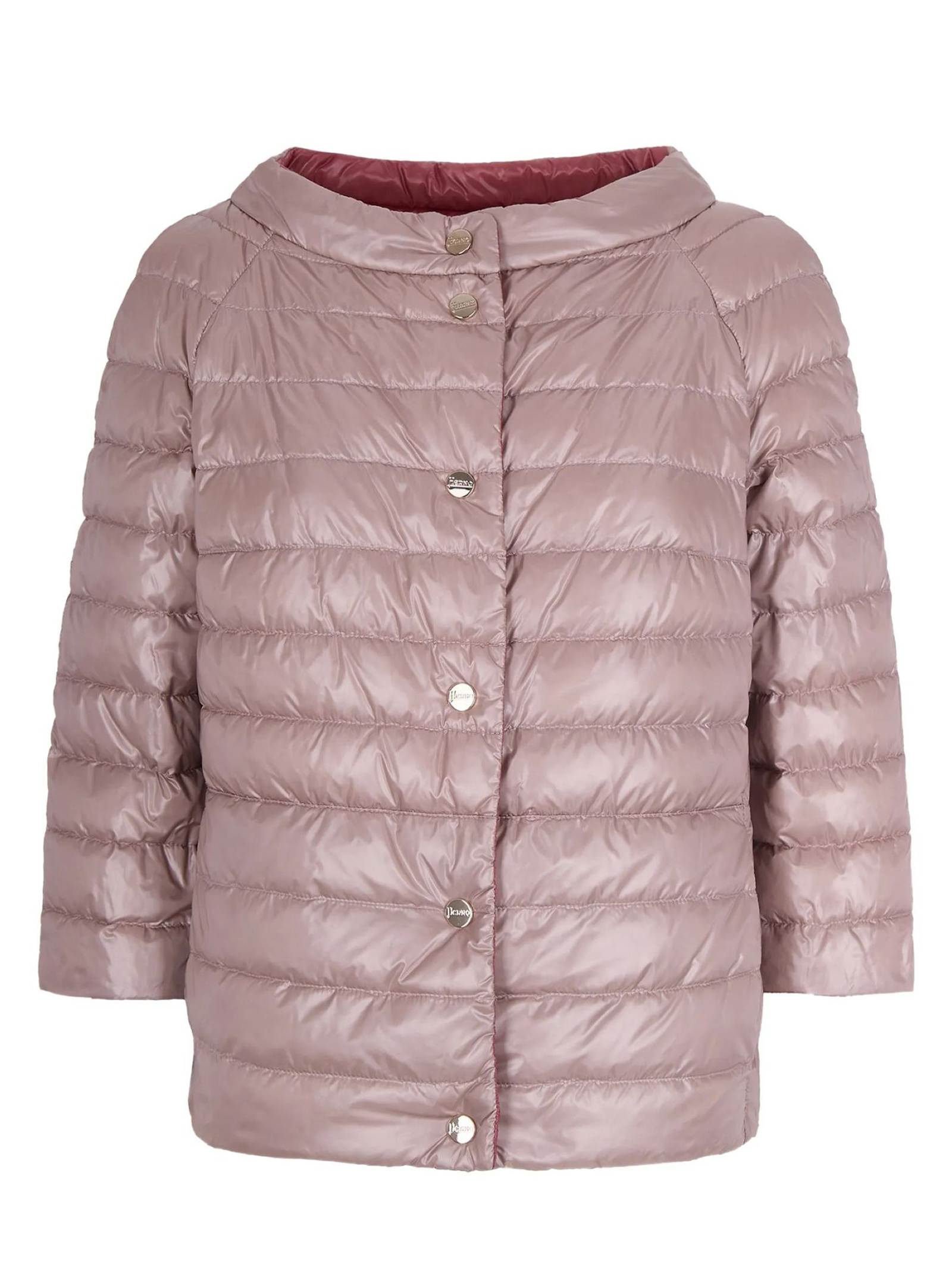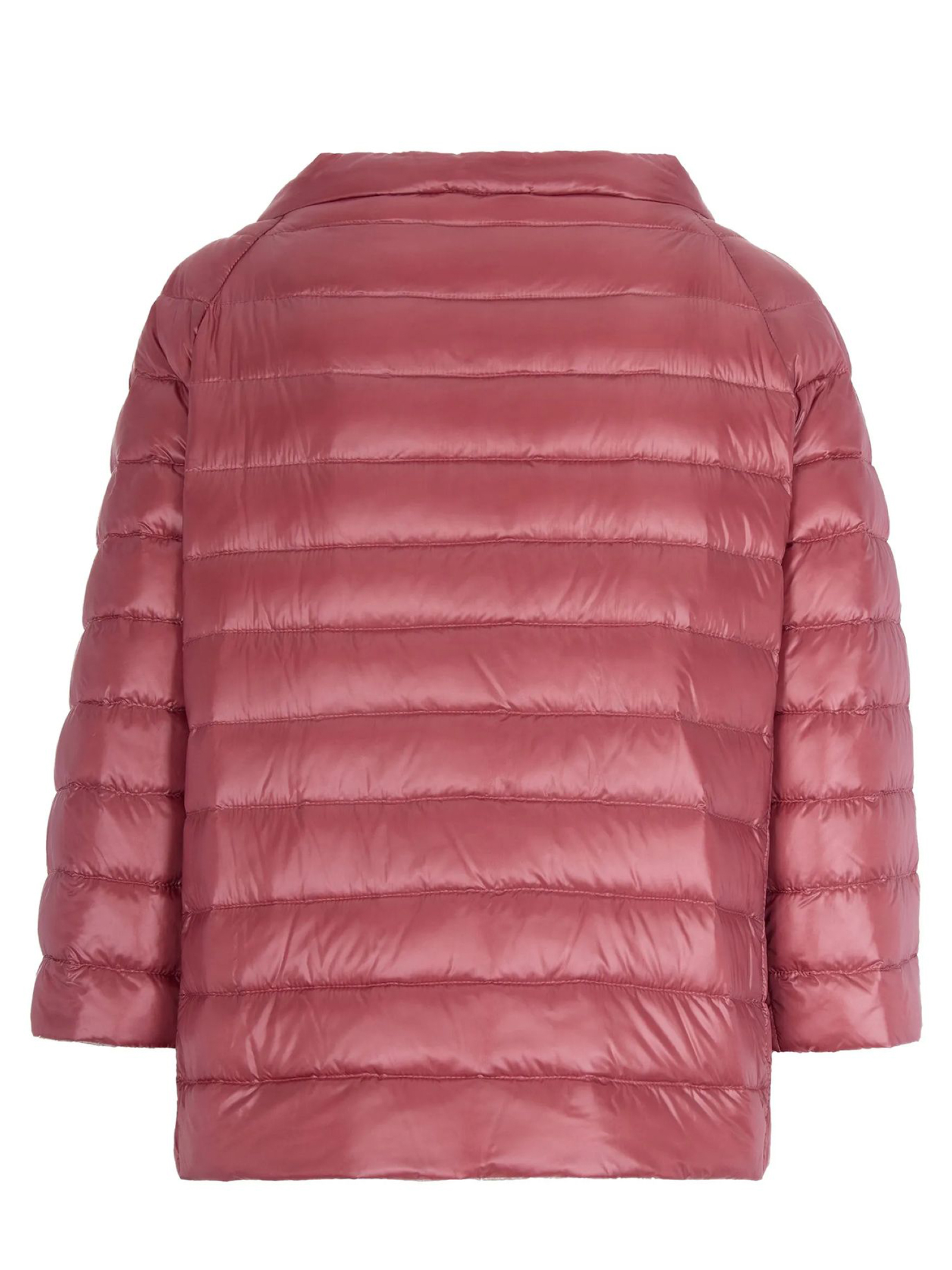 Piumino reversibile in nylon rosa, maniche 3/4, girocollo, trapuntatura a boudin, taglio a trapezio e chiusura con bottoni logati, imbottitura in piuma
