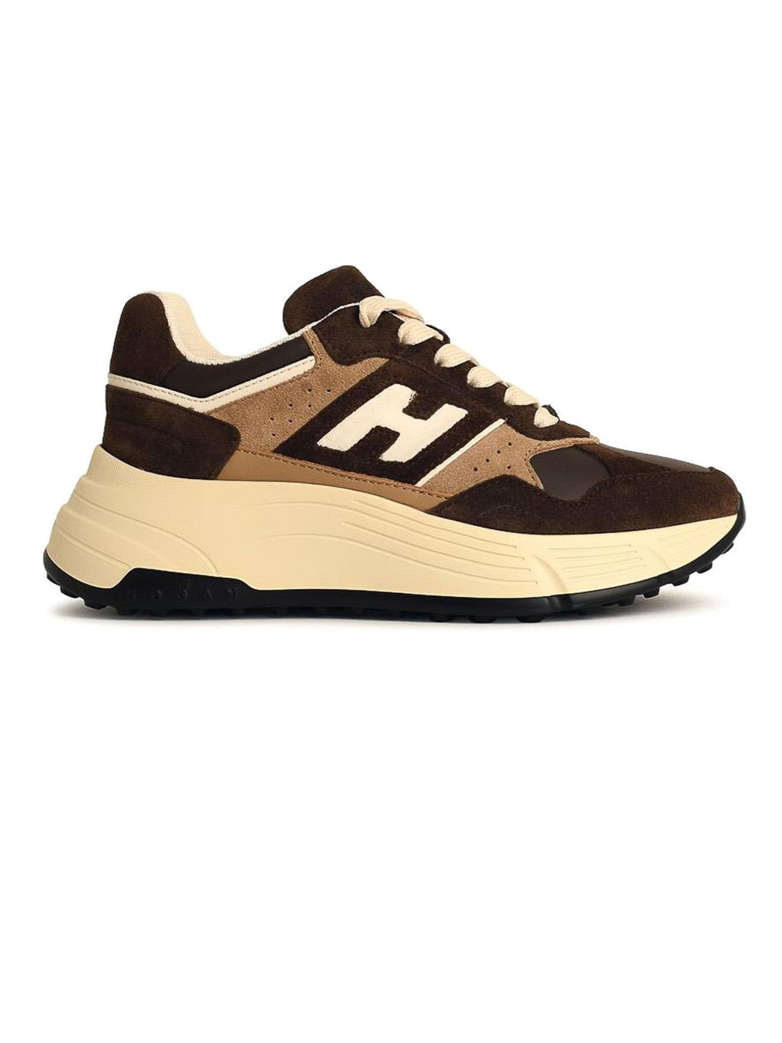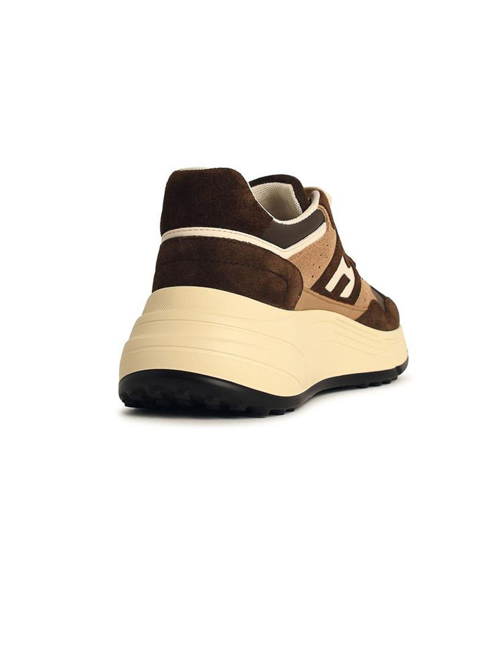 669 sneaker in pelle marrone, inserti in pelle liscia e pelle scamosciata, lacci piatti a contrasto, monogramma di contrasto