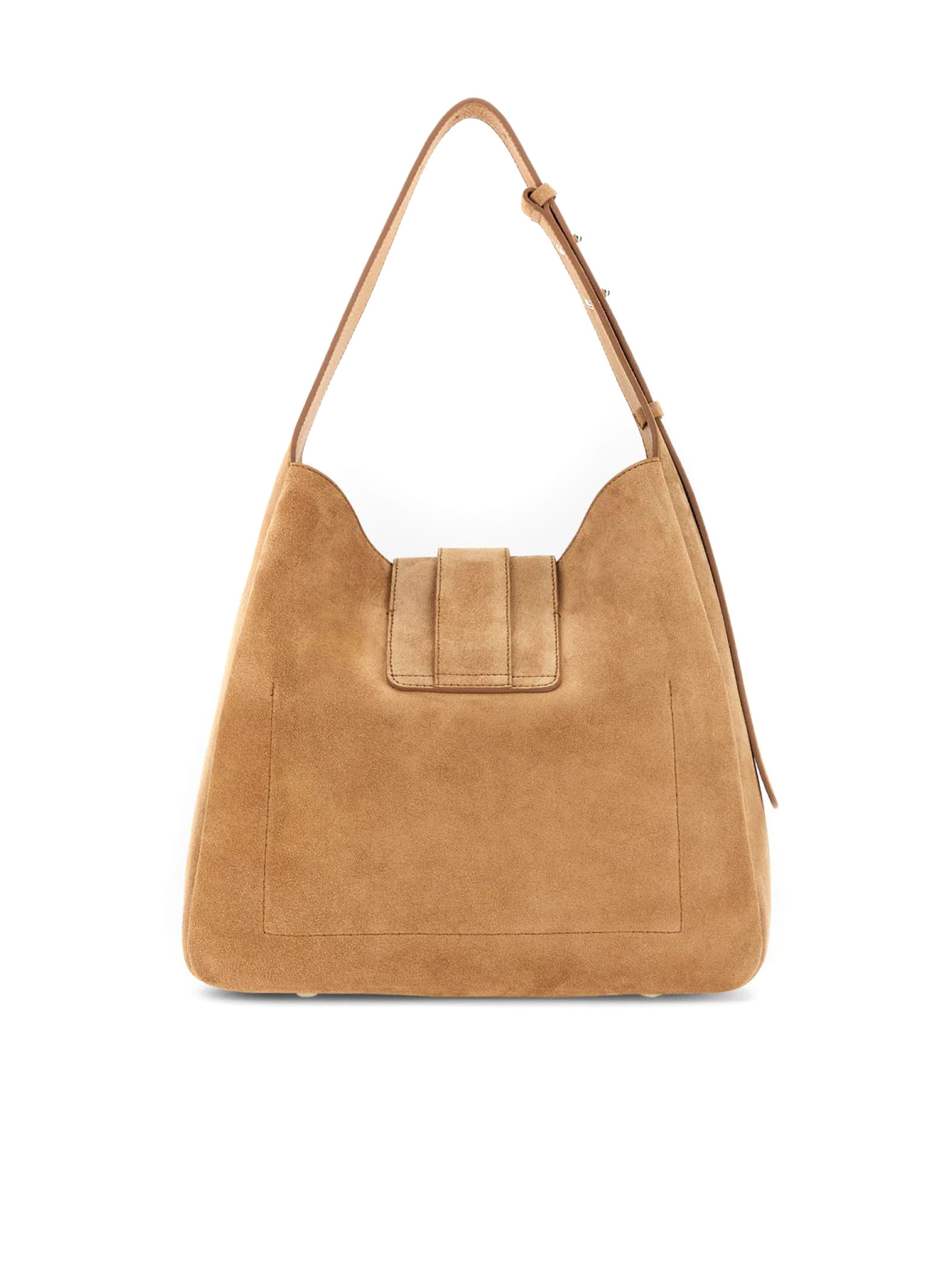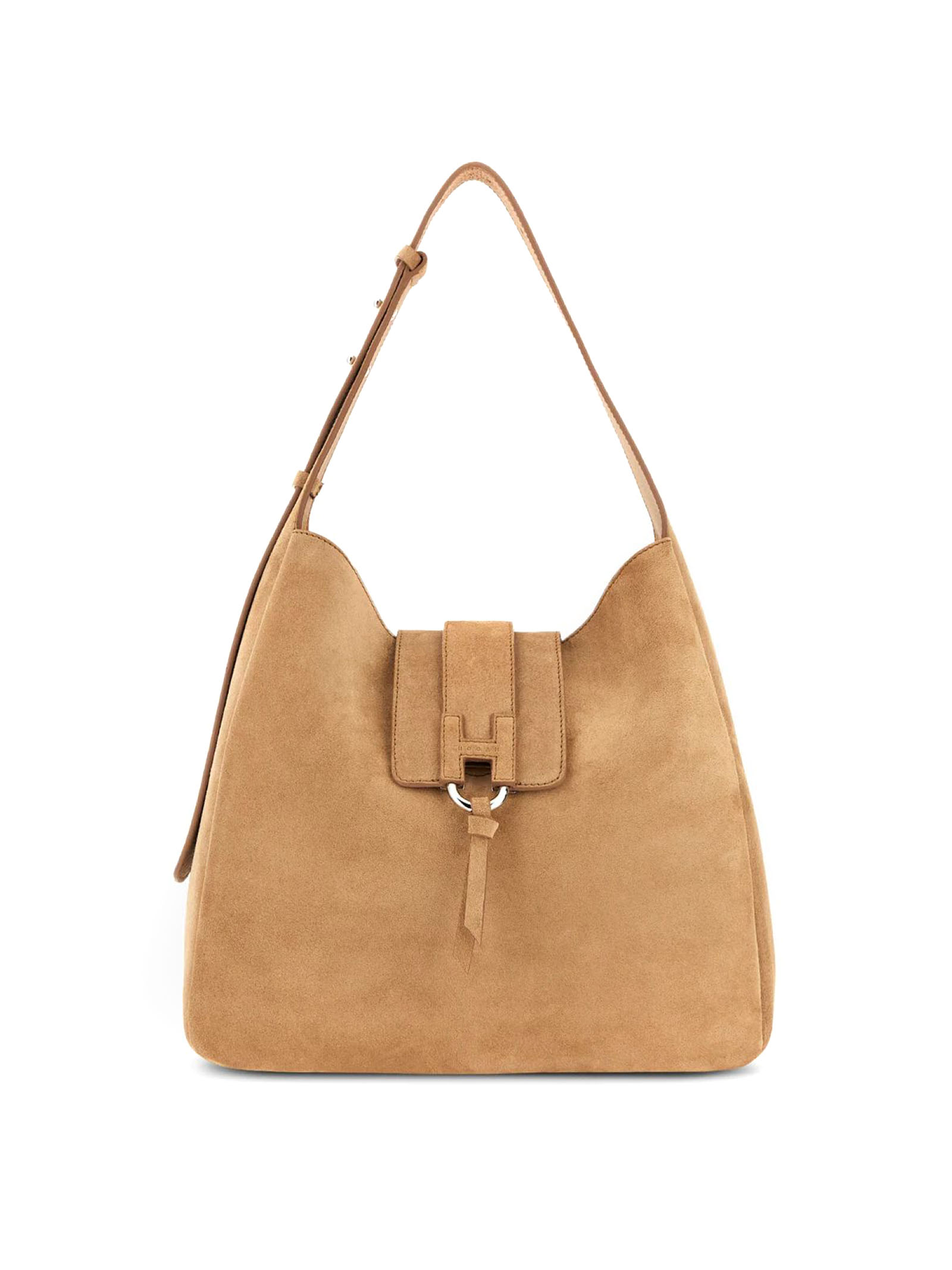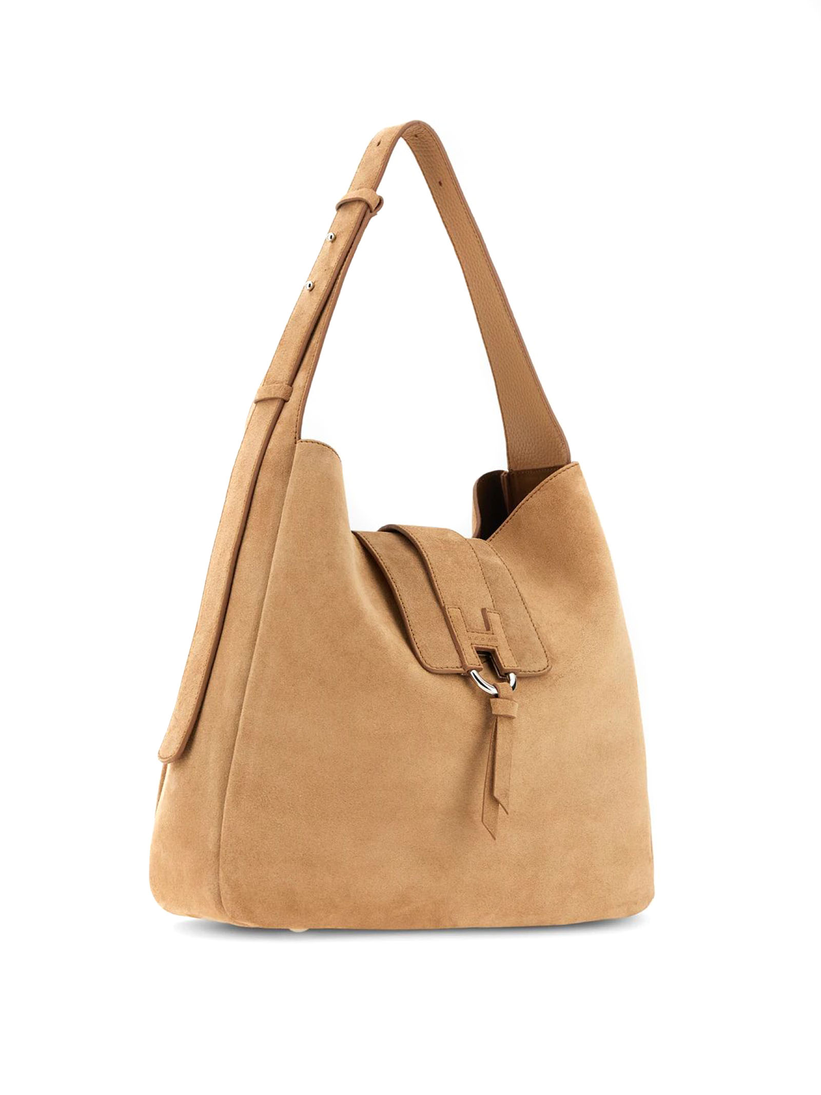 Borsa Hobo Hogan Trend Beige, pelle scamosciata, Chiusura con pattina e bottone magnetico, H a rilievo con logo Hogan impresso, Dimensioni: 28 x 29 x 9 cm, Manico regolabile, Tasca interna, Piedini in metallo