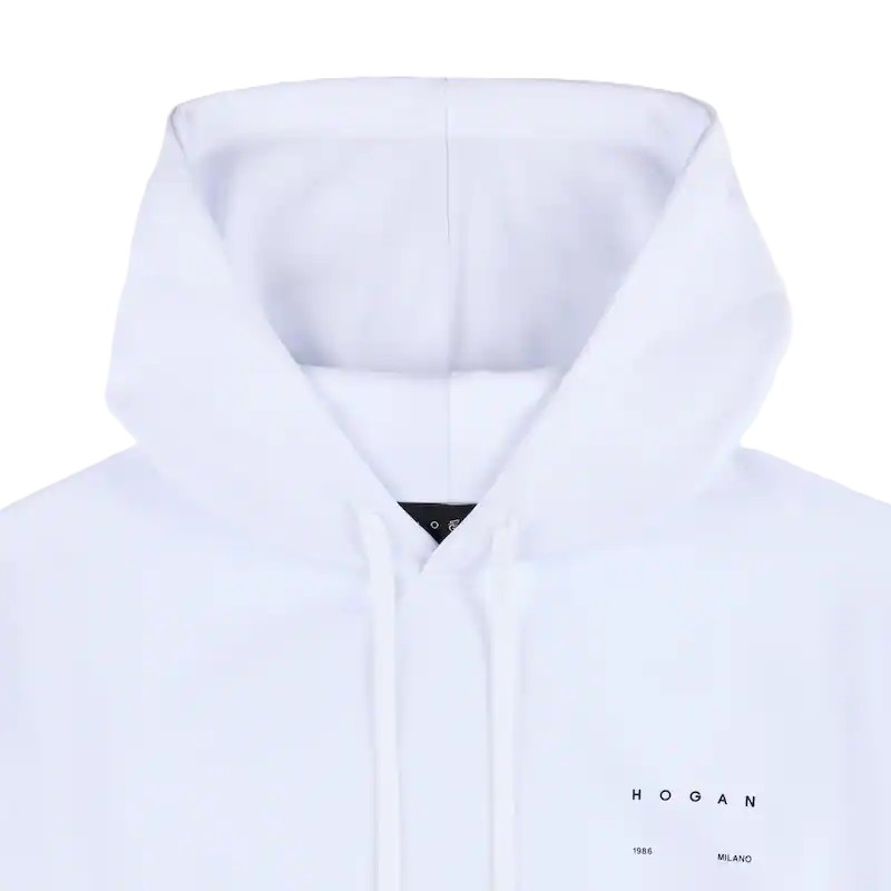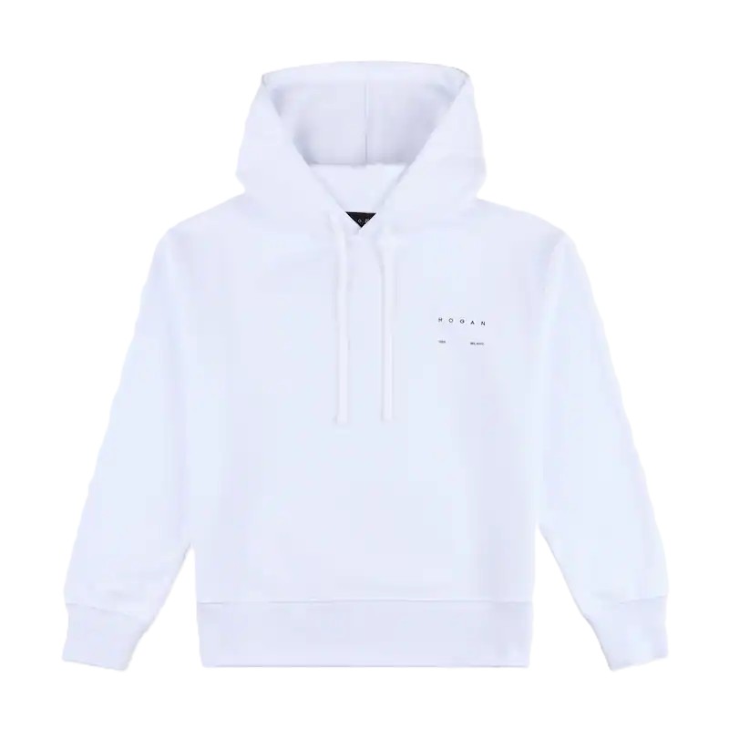 Felpa in cotone con cappuccio e coulisse. Dotata di inserti in maglia a costine sui polsini e sul fondo, presenta il logo Hogan stampato a contrasto sul petto