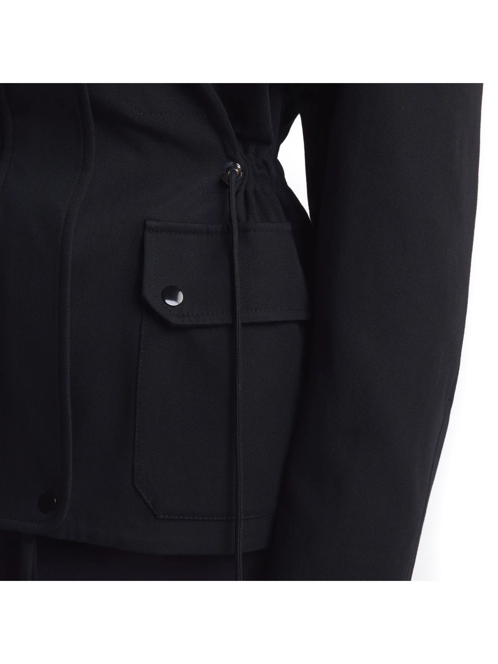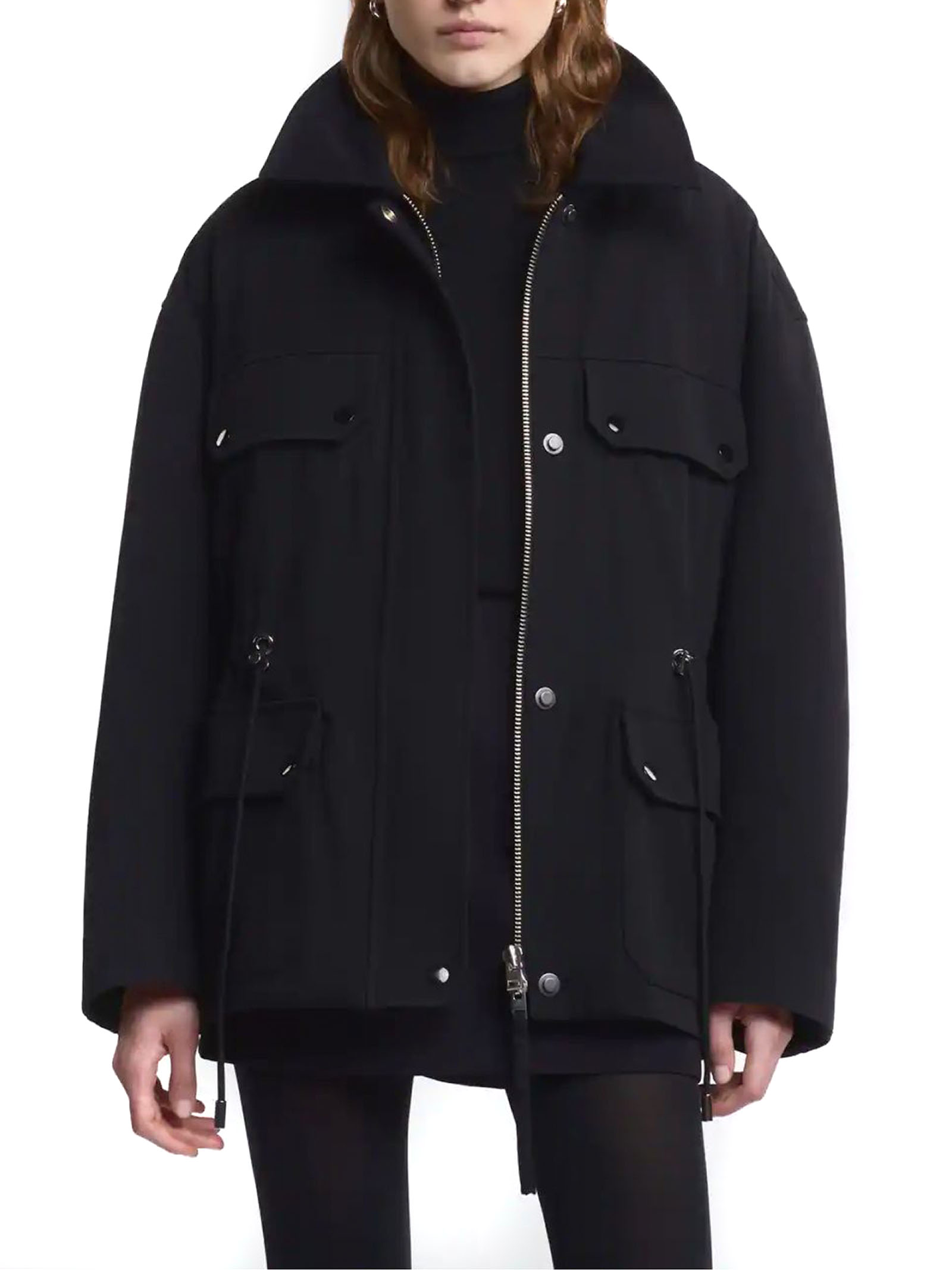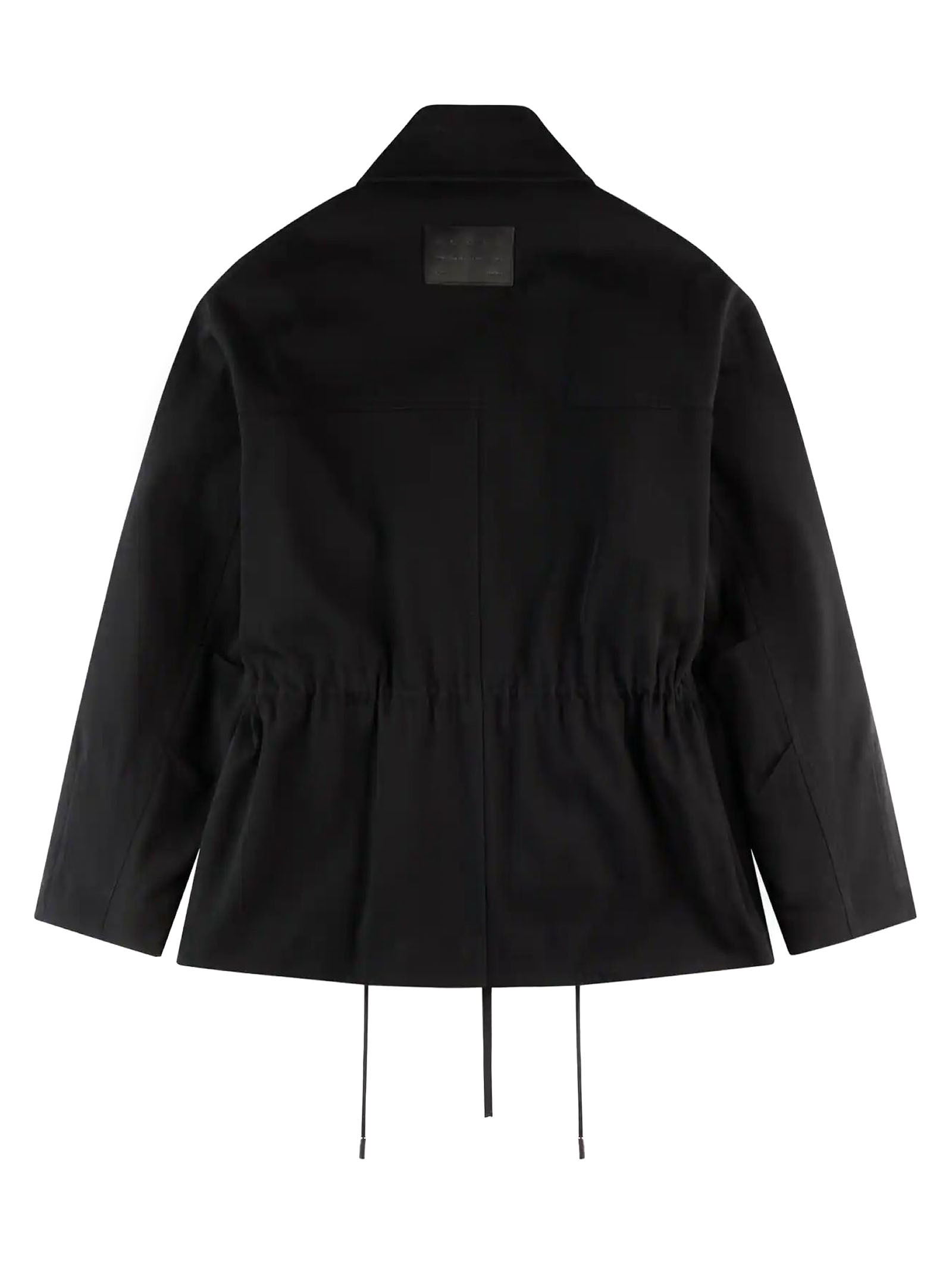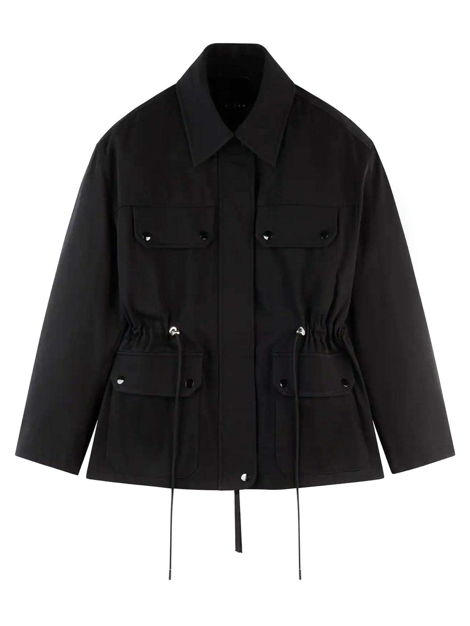 Giacca in reps di cotone italiano di alta qualità con proprietà antigoccia e imbottitura in ovatta, chiusa con cerniera e automatici nascosti. Un modello che attinge al mondo workwear, caratterizzato da tasche con pattina e bottoni a pressione. Dotata di
