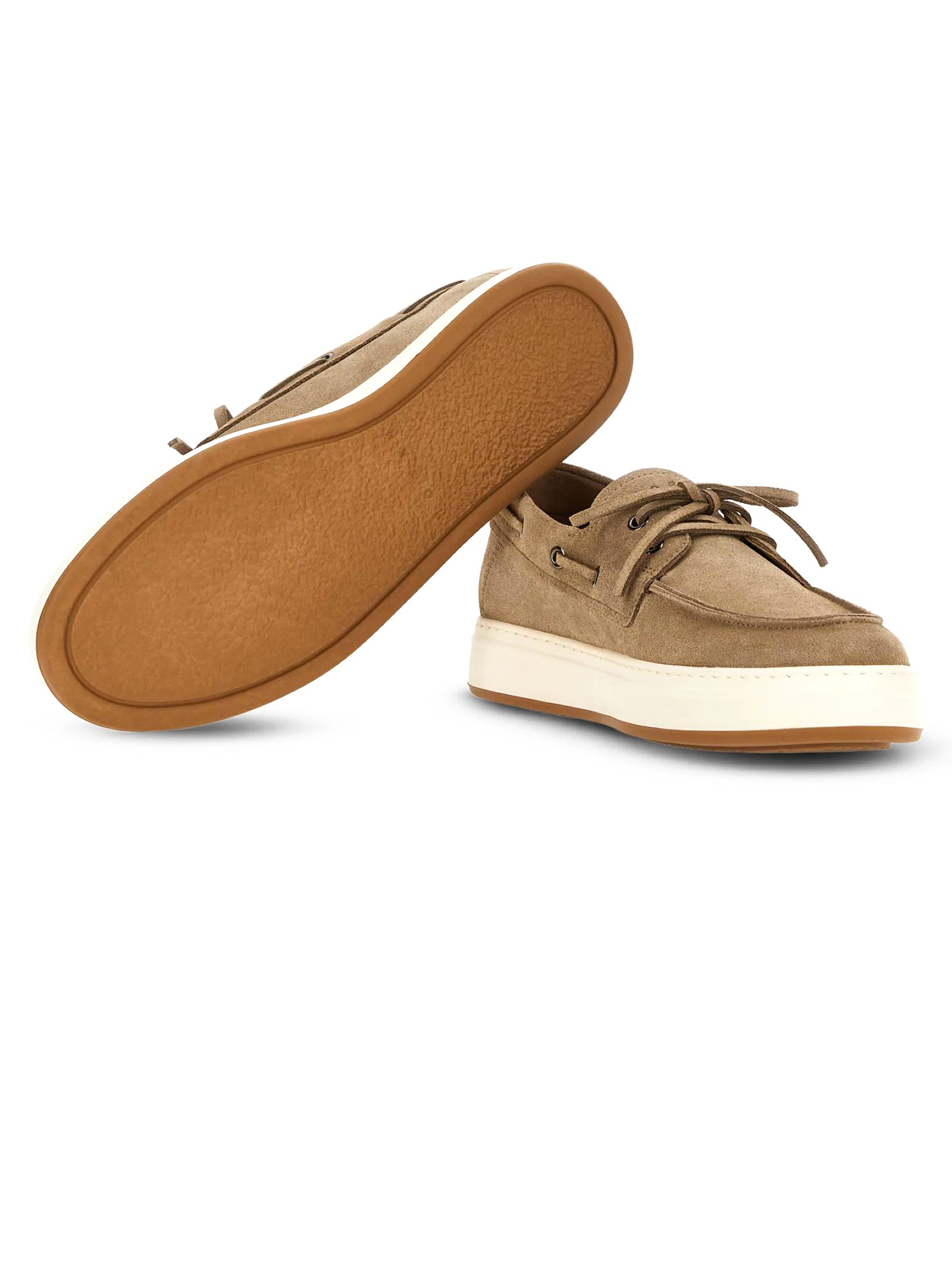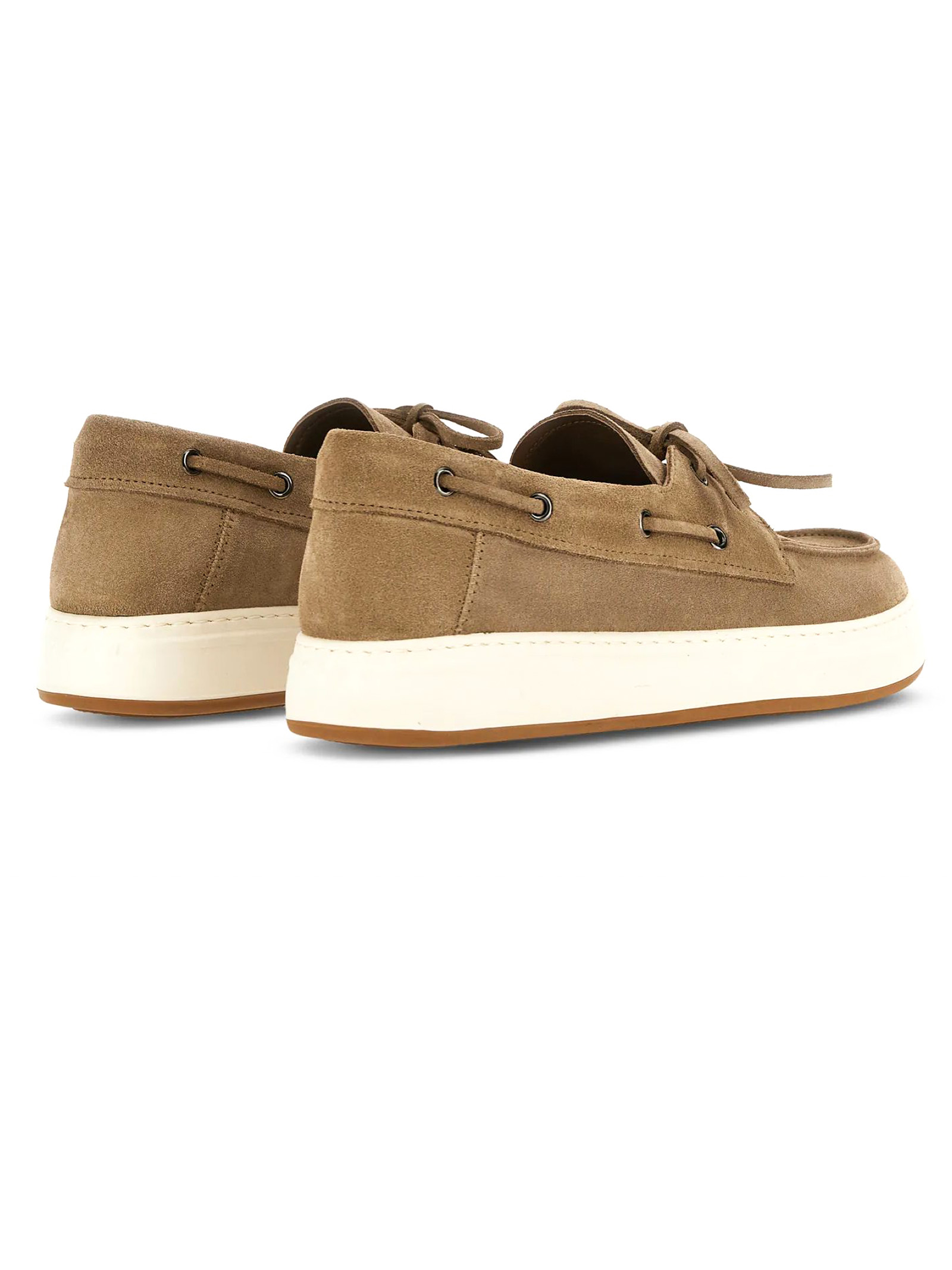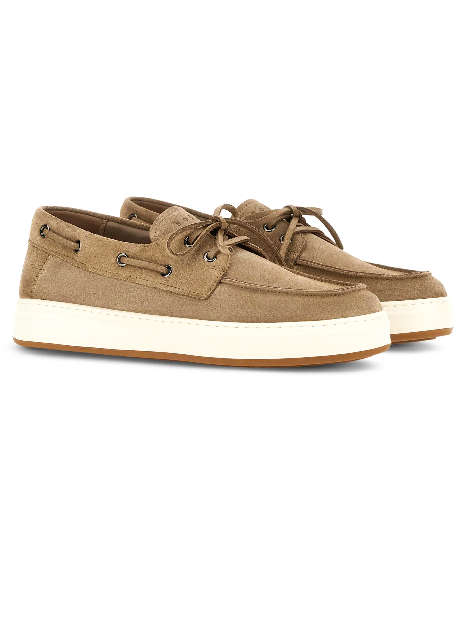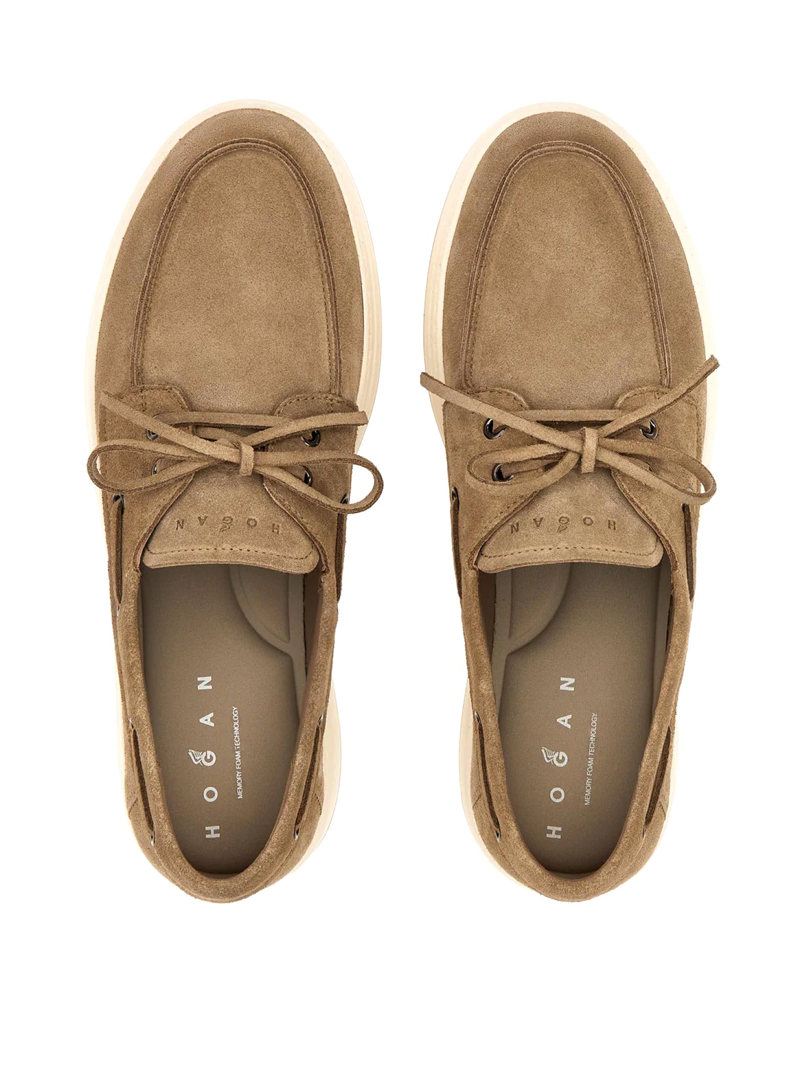 Mocassini da Barca Hogan H-TV Beige, Tomaia in pelle scamosciata, Laccetto passante, Logo Hogan impresso sulla linguetta, Soletta in memory foam 8 mm, Suola in gomma, Altezza totale 3,5 cm