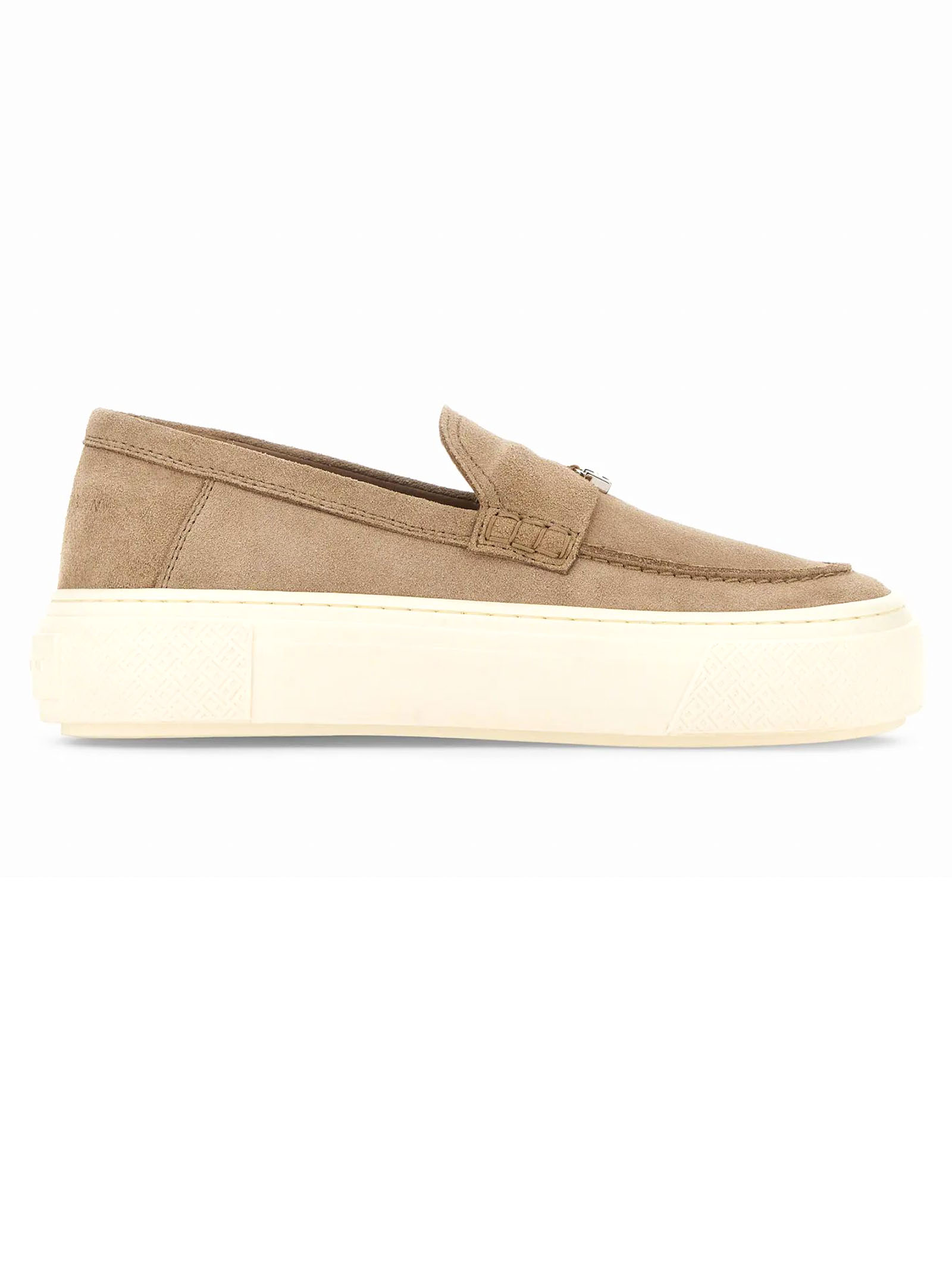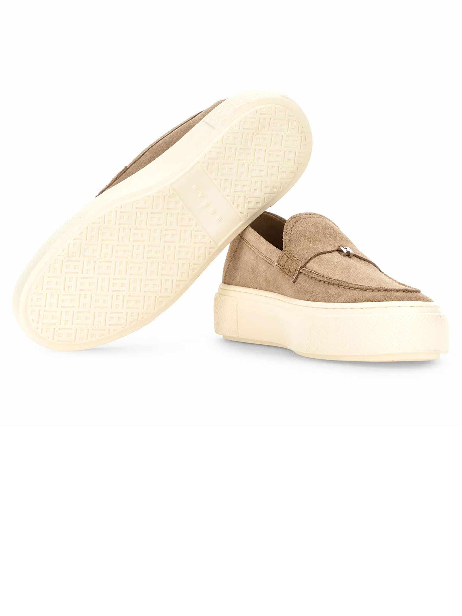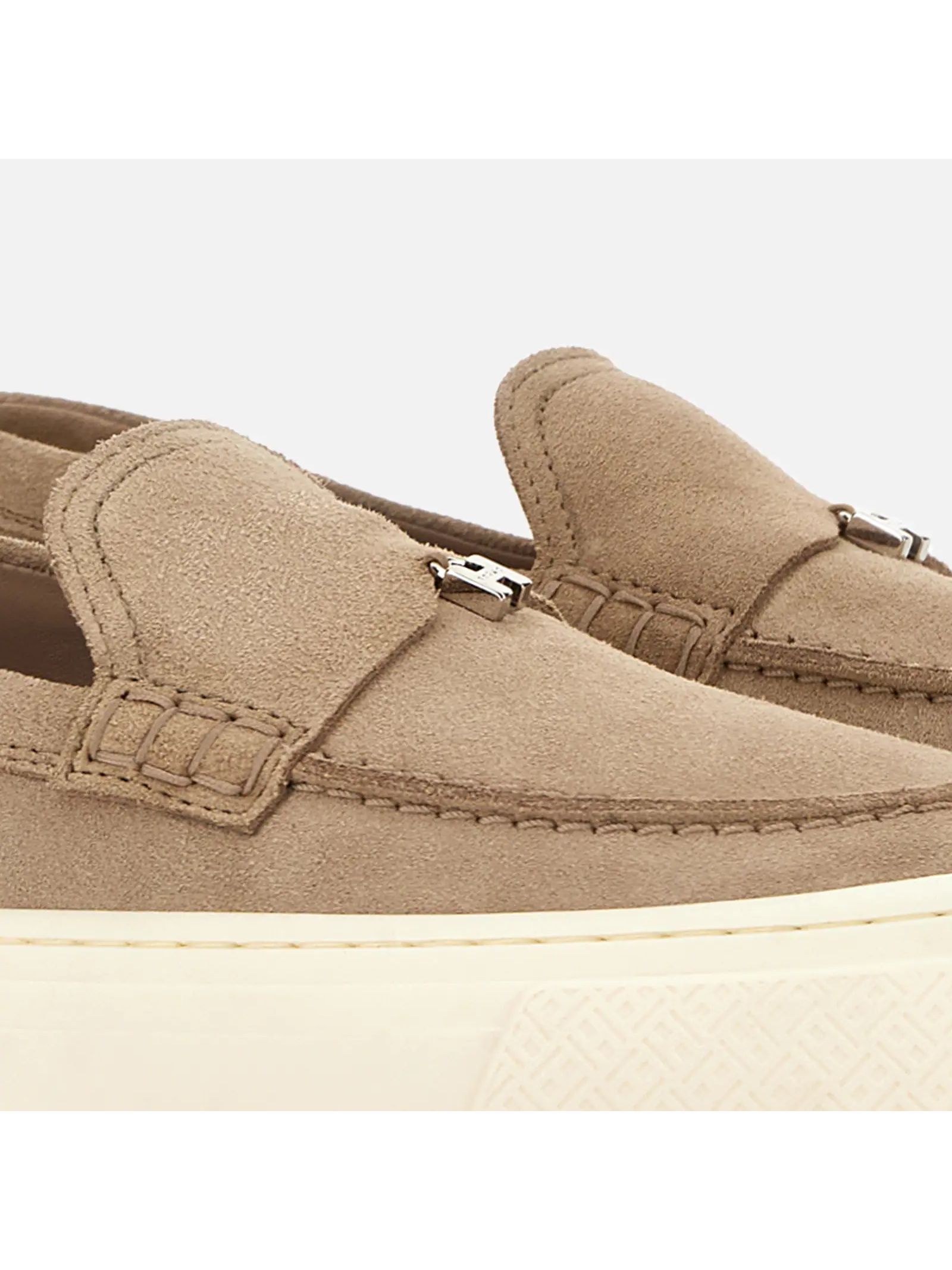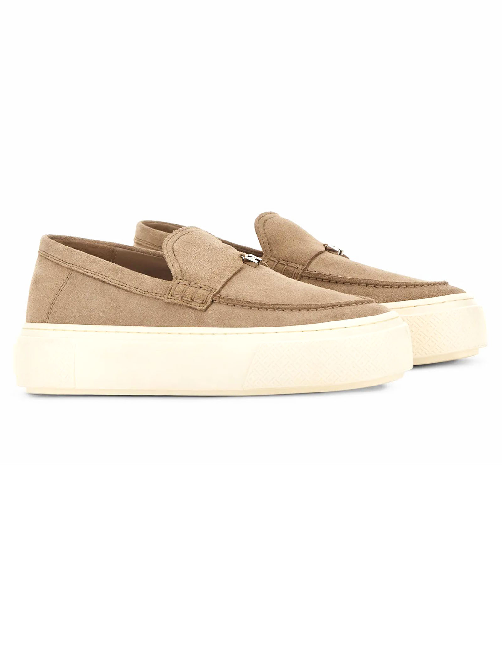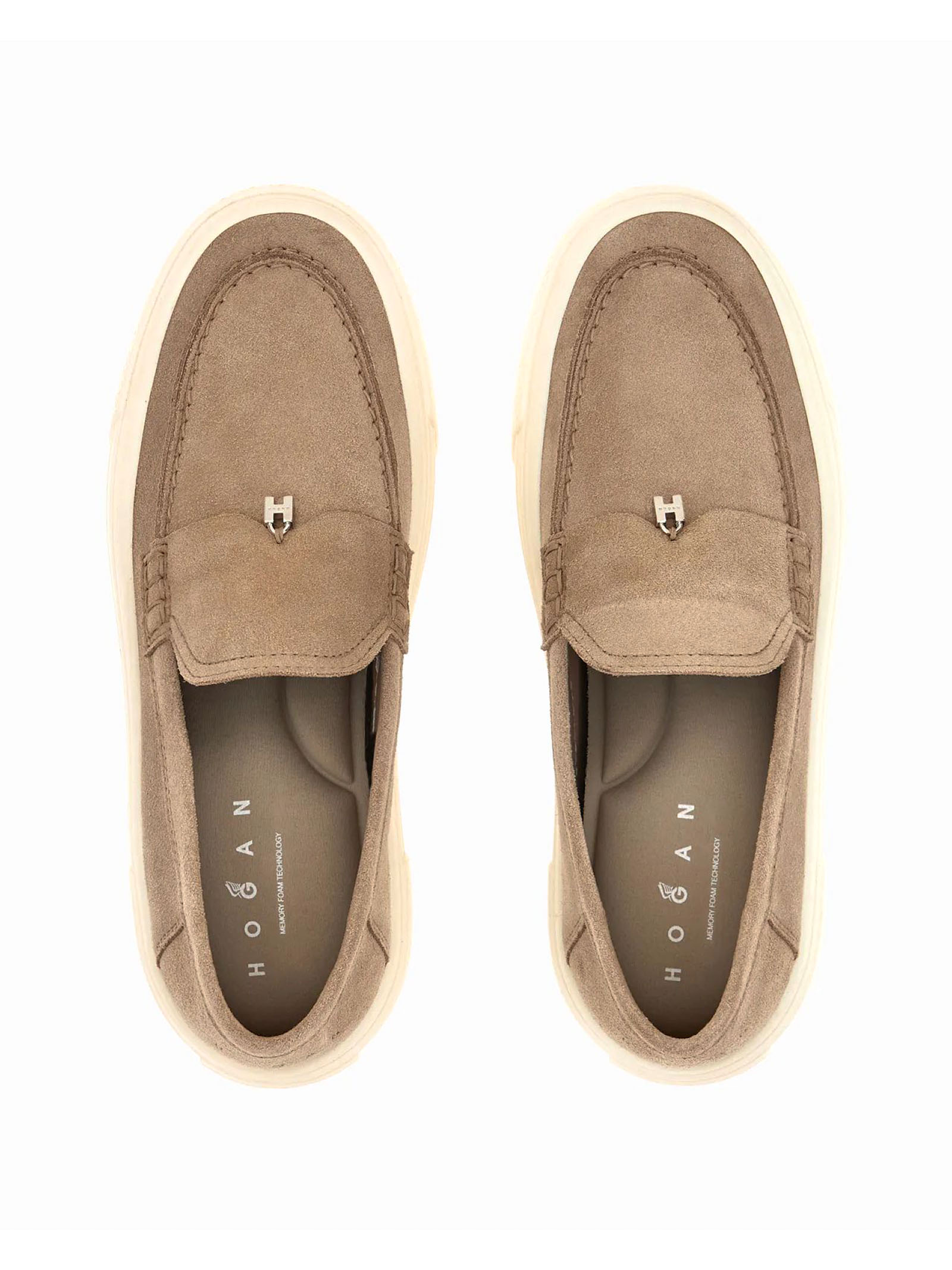 Mocassini Hogan Crosswind beige, tomaia in pelle scamosciata, linguetta con ciondolo a forma di H, monogramma micro H, suola in gomma, soletta in memory foam
