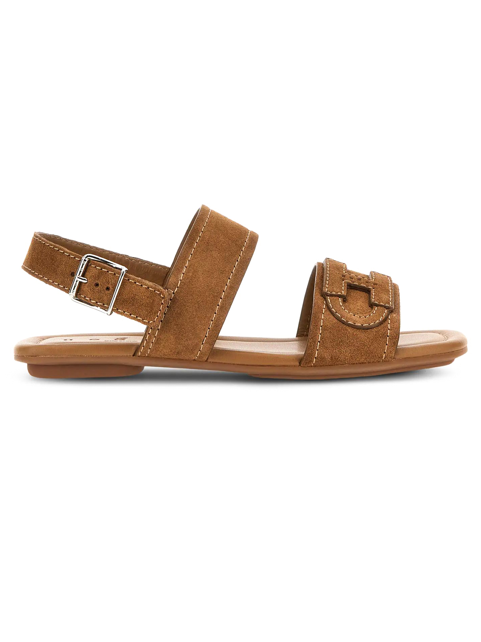 Sandali Flat Hogan H685 Marrone, Tomaia in pelle scamosciata, H applicata con logo Hogan impresso, Cinturino regolabile al tallone, Soletta morbida rivestita in pelle, Suola in gomma, Altezza totale 2 cm