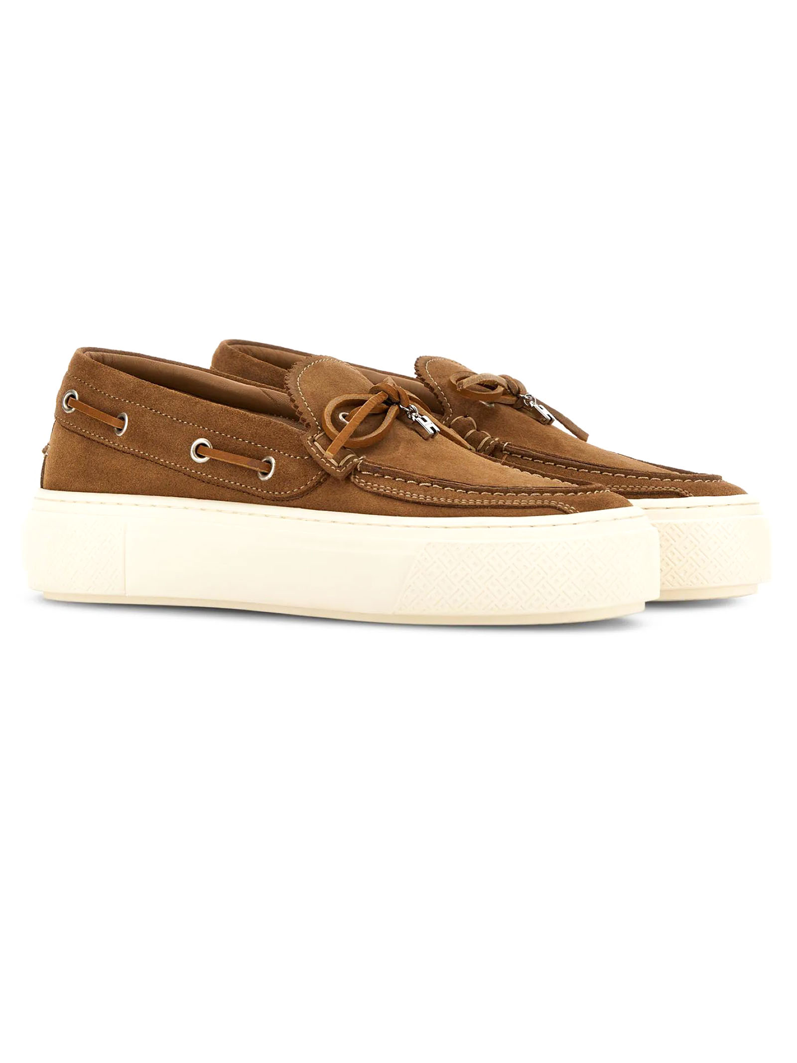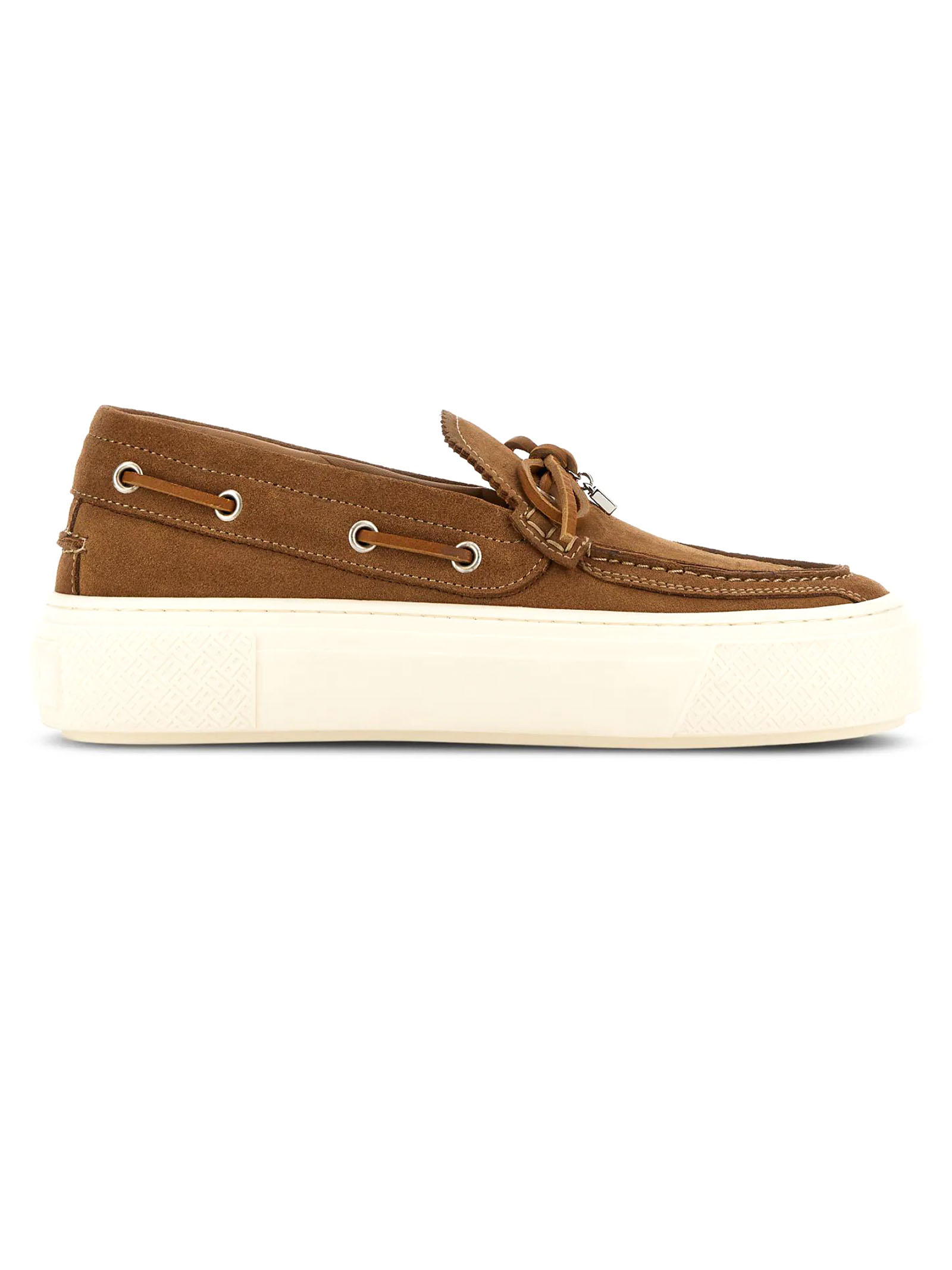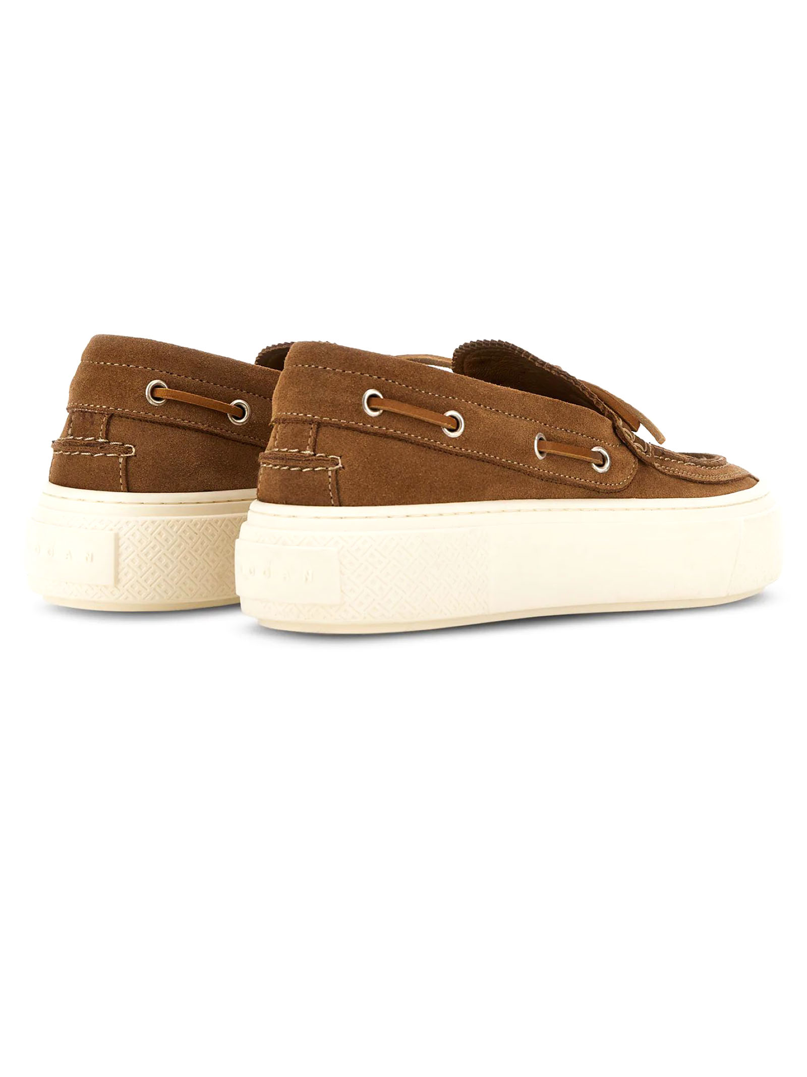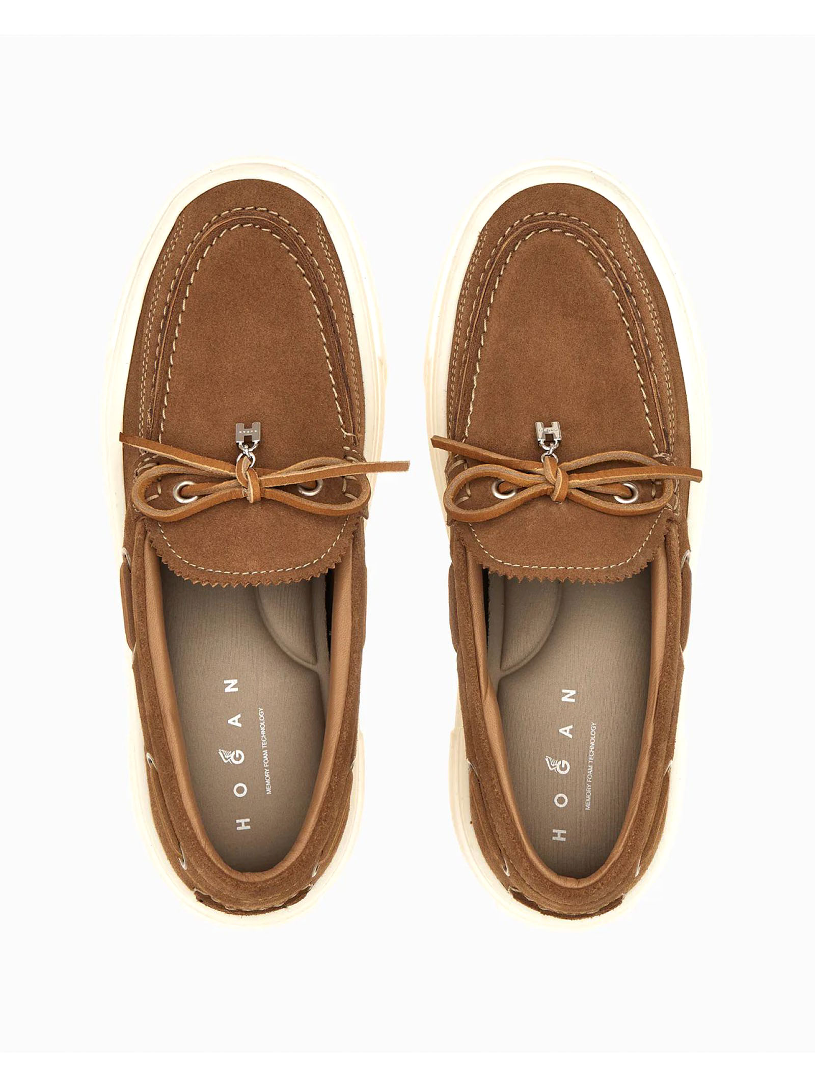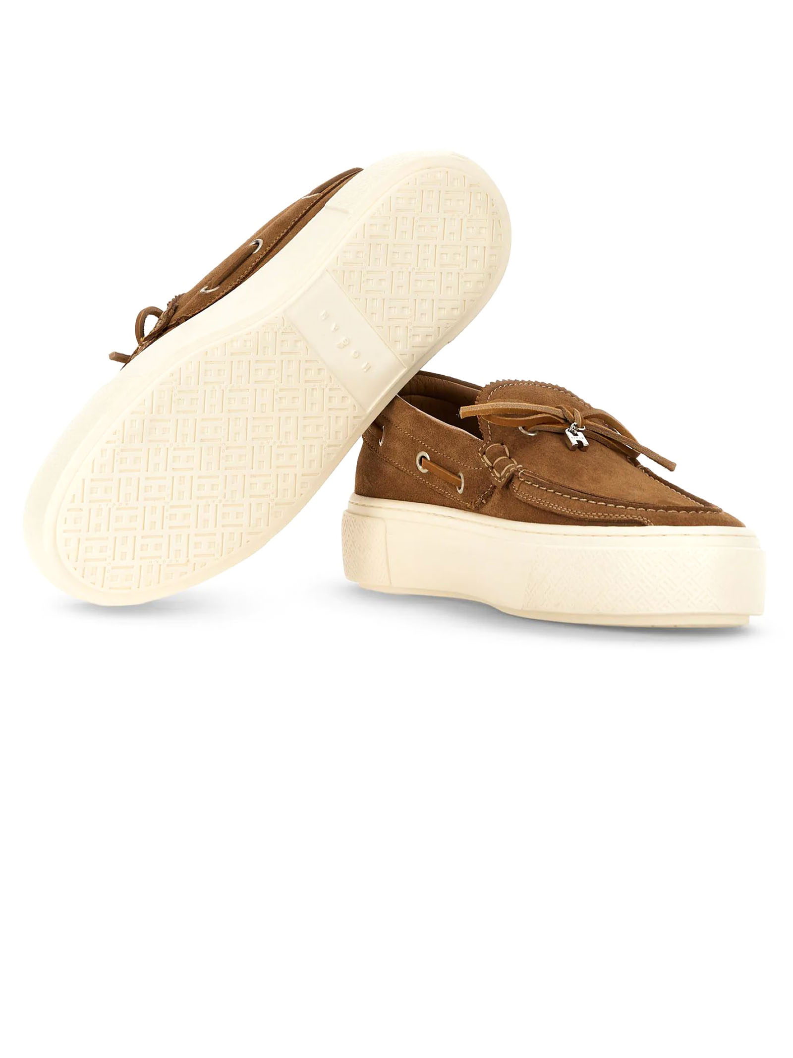 Scarpe da Barca Hogan Crosswind Marrone, Tomaia in pelle scamosciata, Laccetto passante, Charm H in metallo, Impunture realizzate a mano, Soletta in memory foam 8 mm, Suola in gomma, Altezza totale 5,6 cm