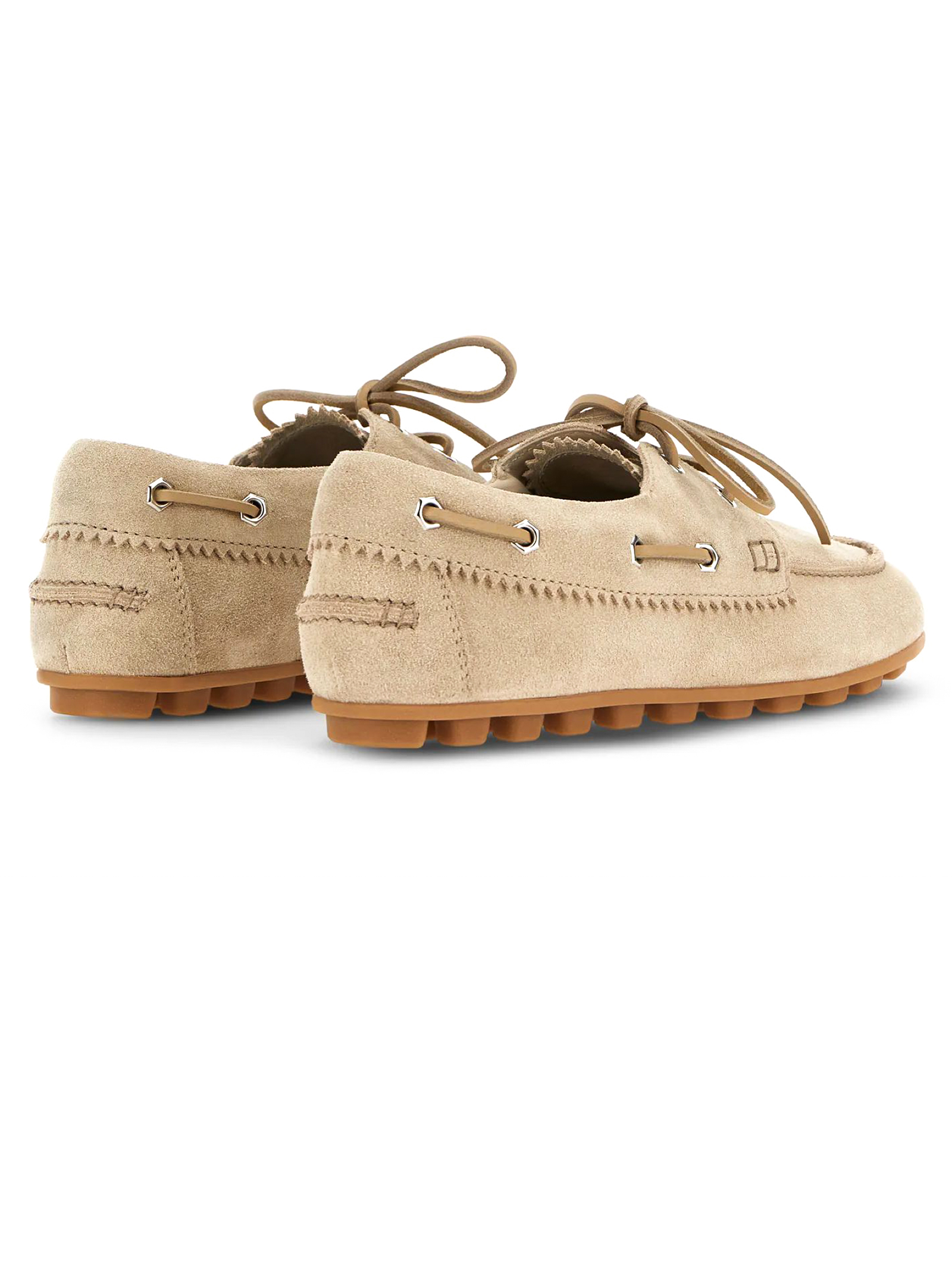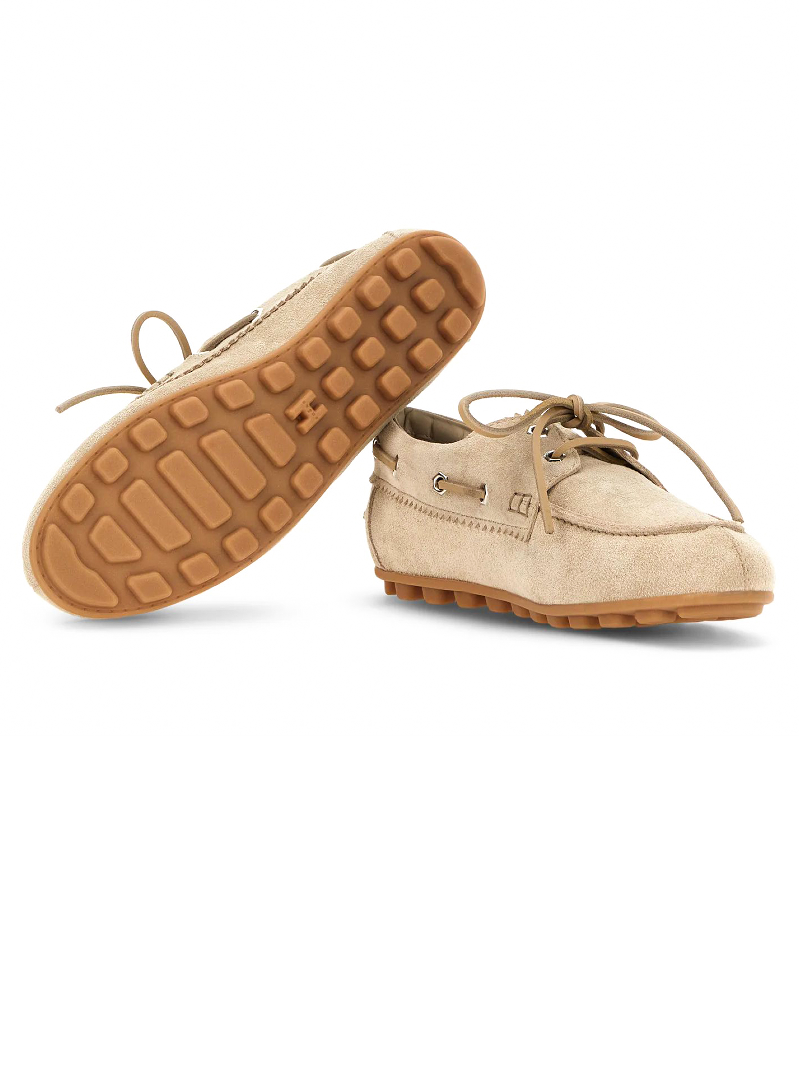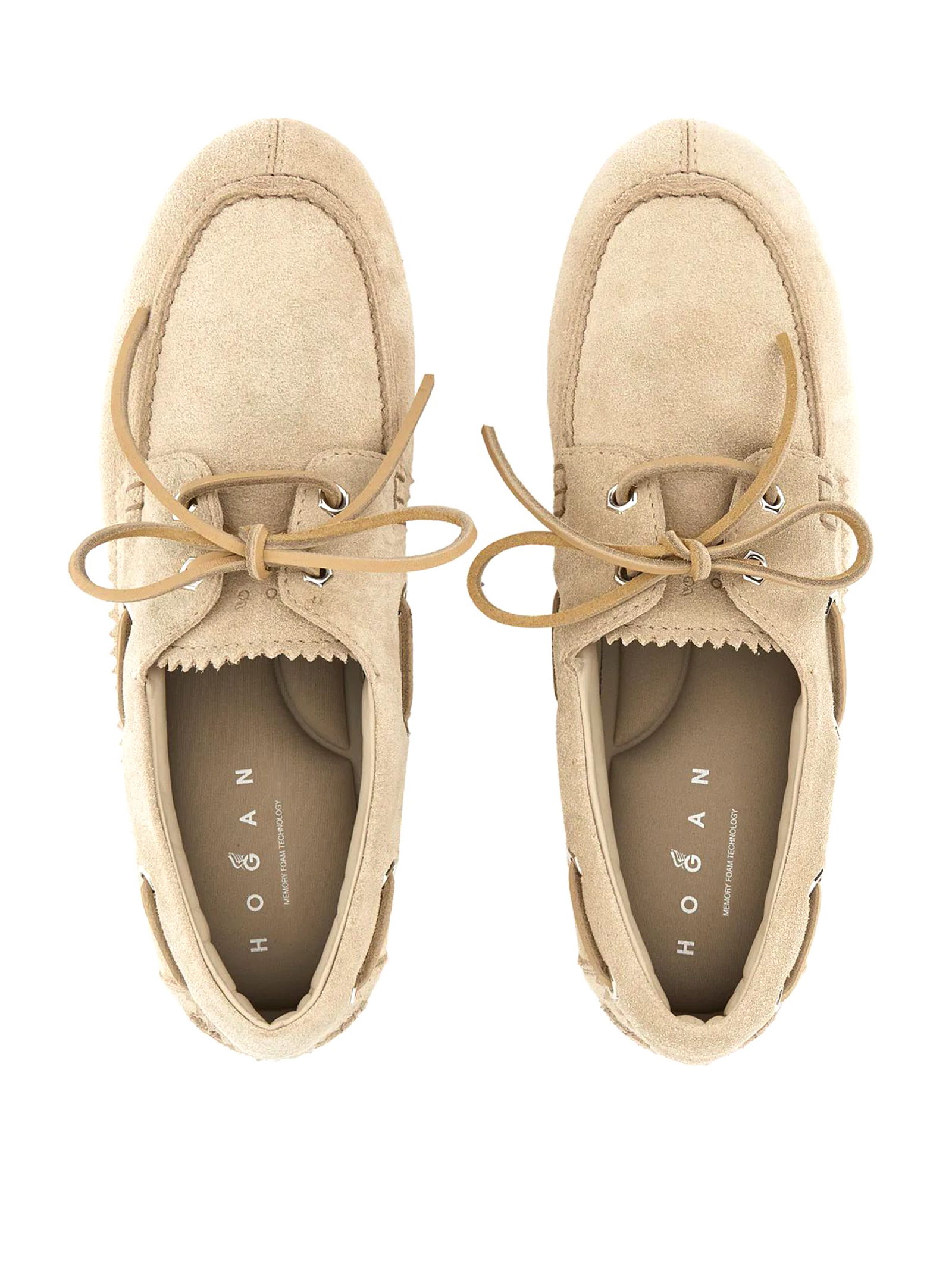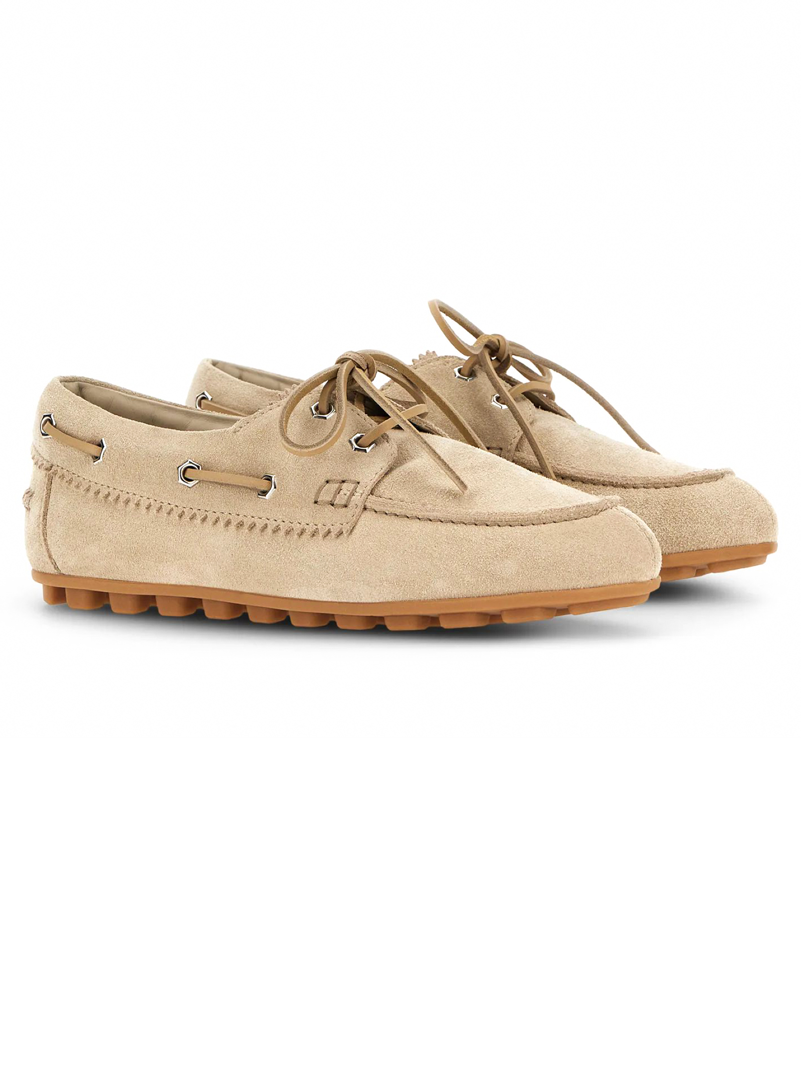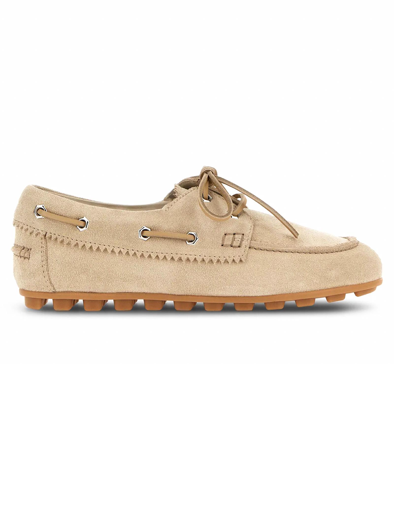 Scarpe da Barca Hogan Olympia Beige, tomaia in pelle scamosciata, laccetto passante in cuoio, impunture realizzate a mano, soletta in memory foam 9 mm, suola in gomma, altezza totale 3,2 cm