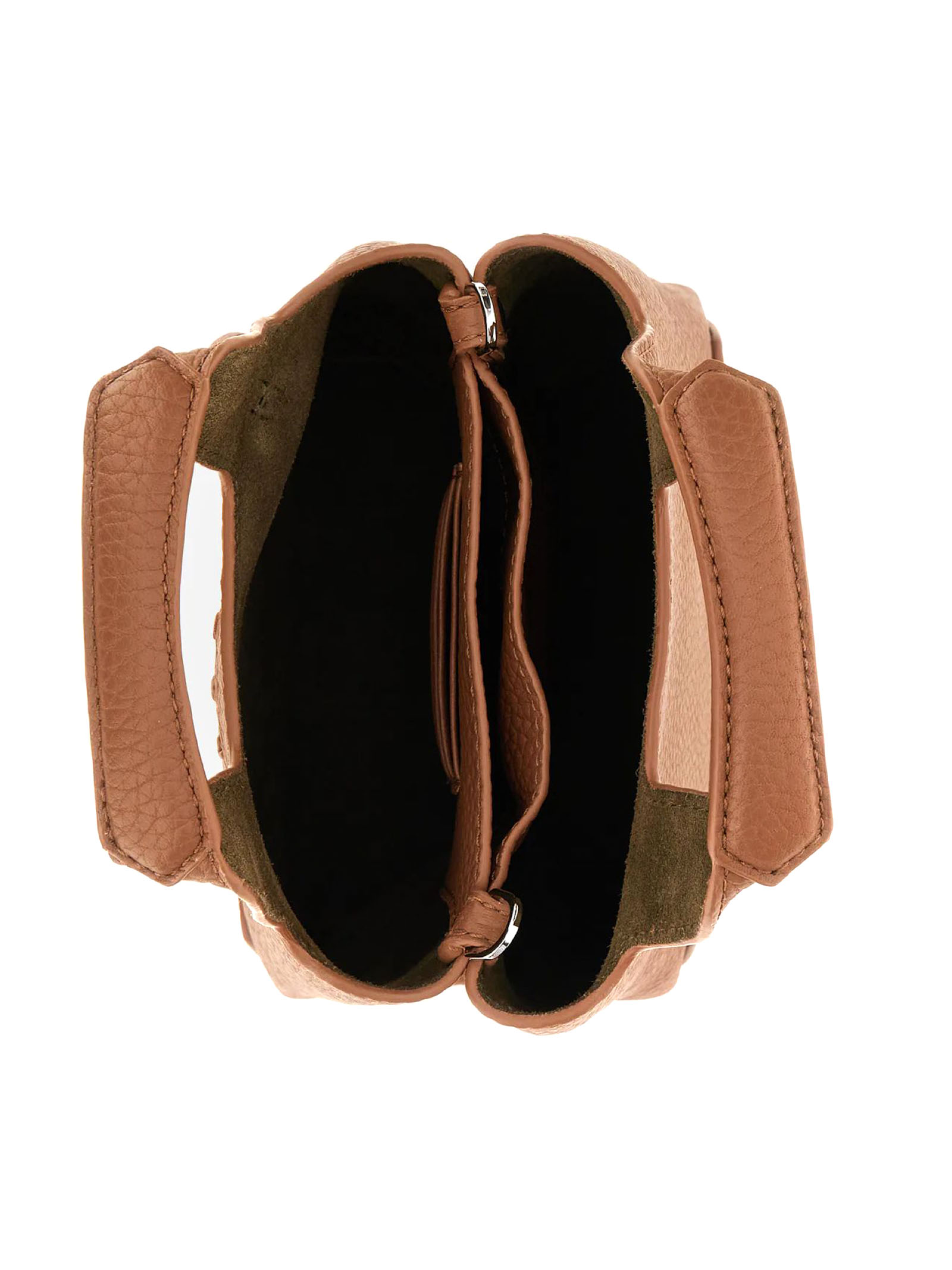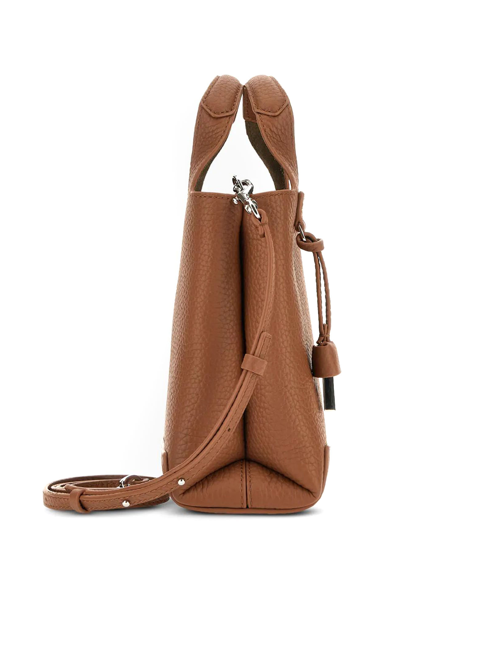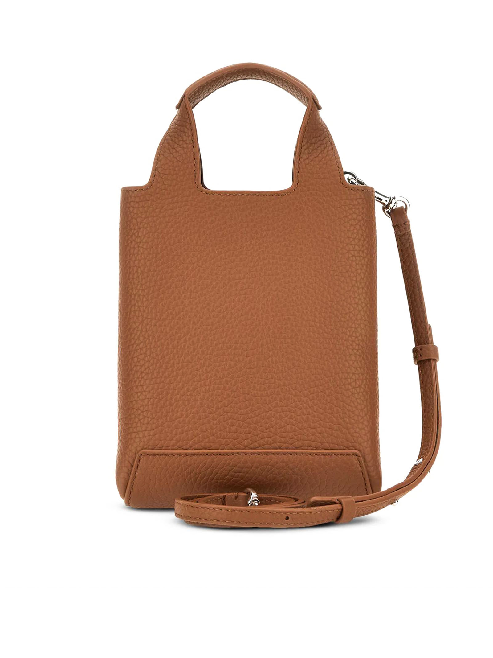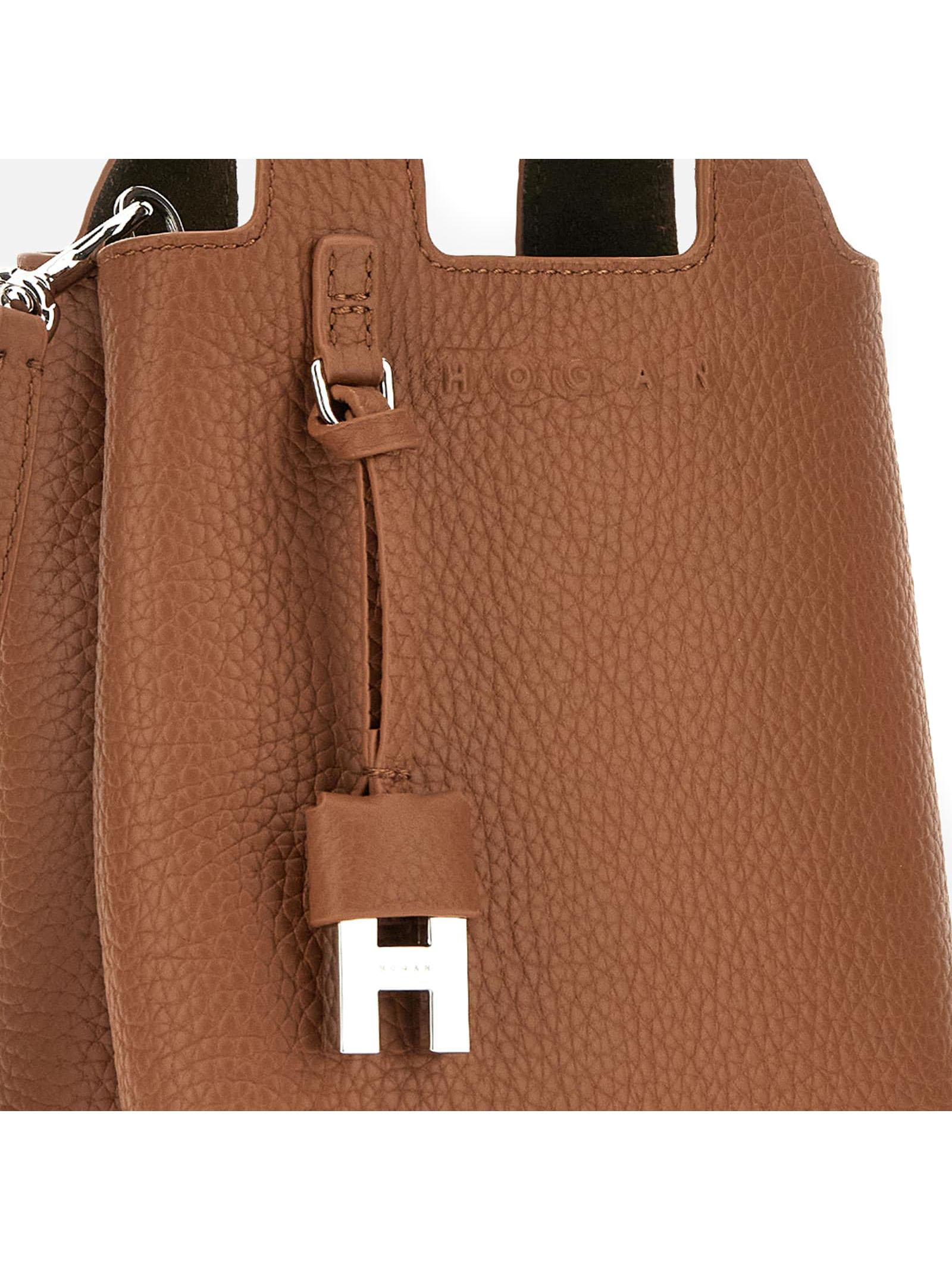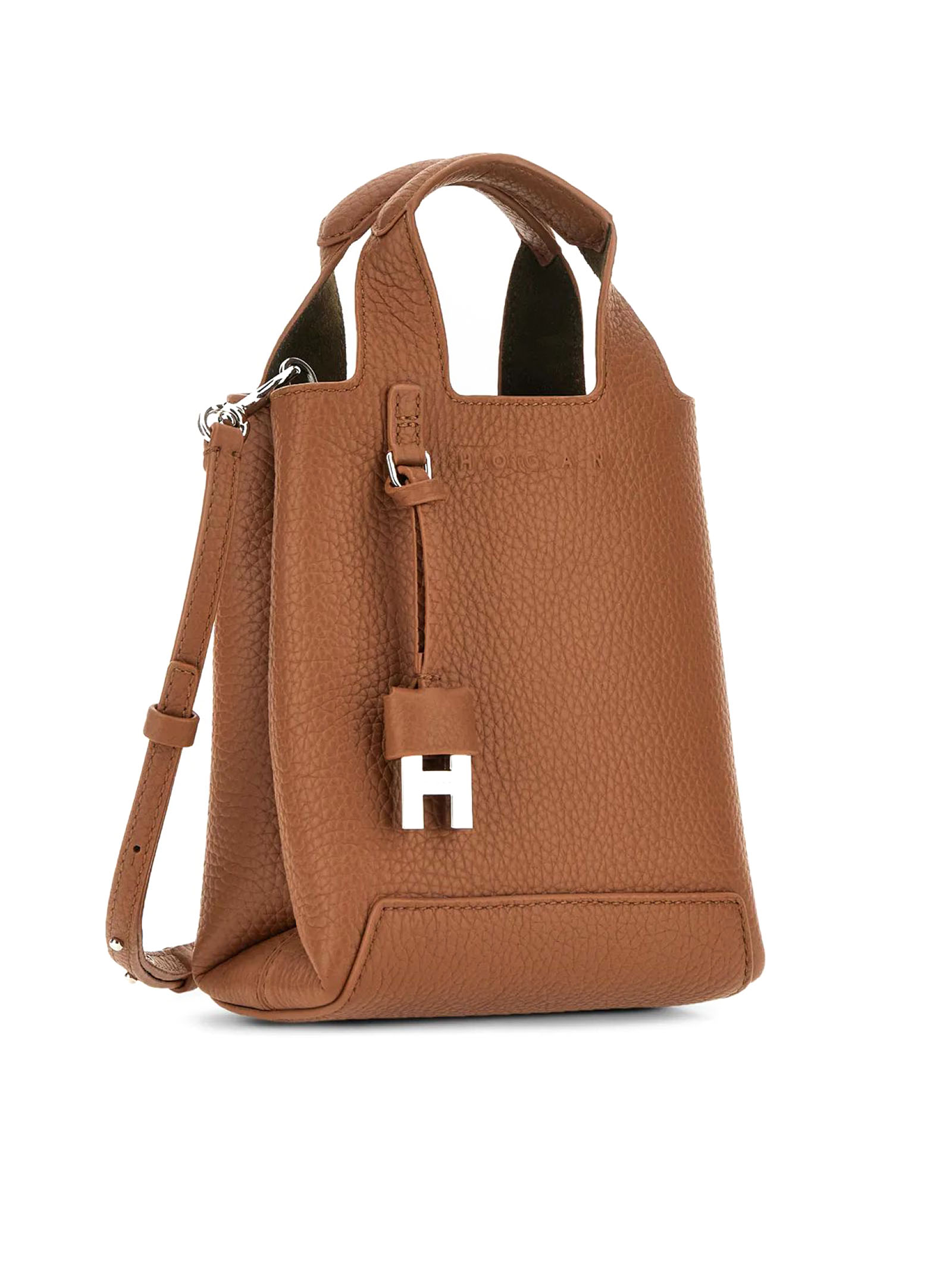 Shopping Bag Mini Marrone, in pelle martellata, Logo Hogan in rilievo, Charm H-Fob in metallo rivestito, Tasca centrale con portatessere, Dimensioni: 16 x 18 x 9 cm, Doppi manici, Tracolla regolabile e removibile