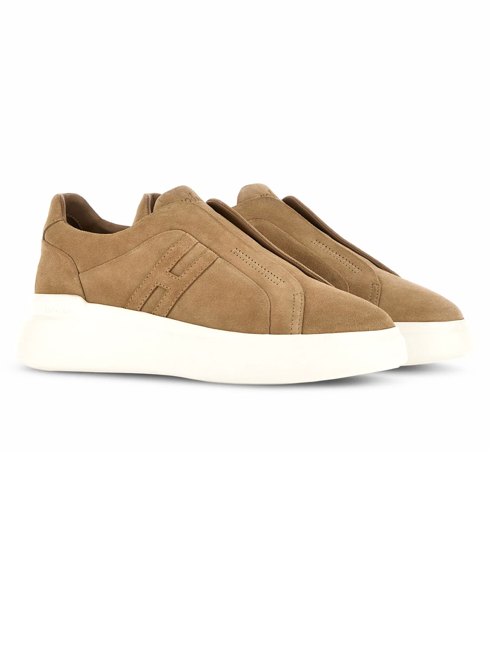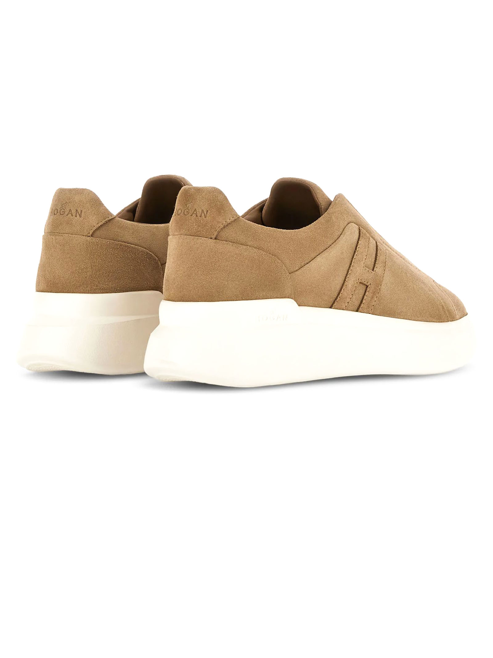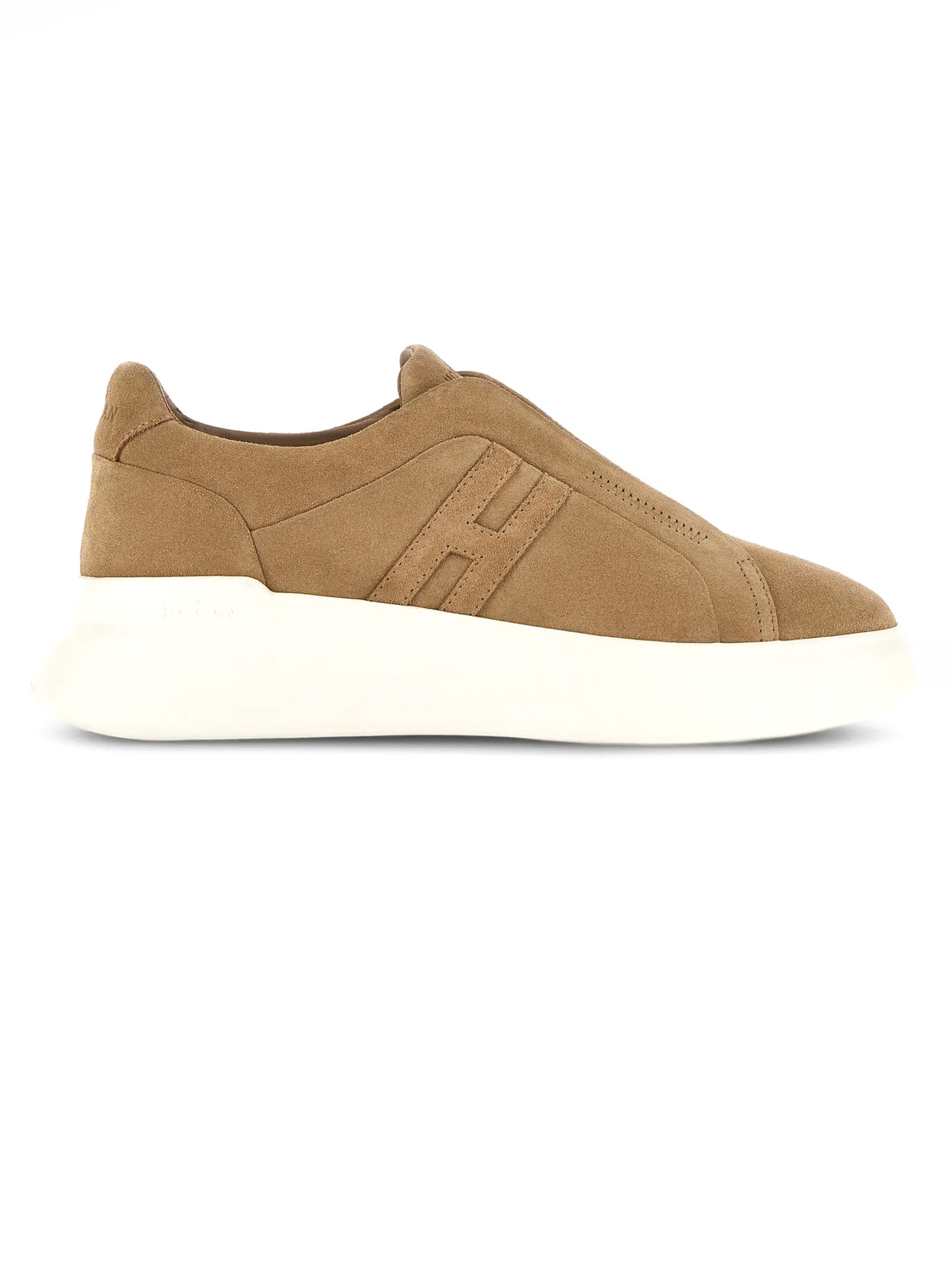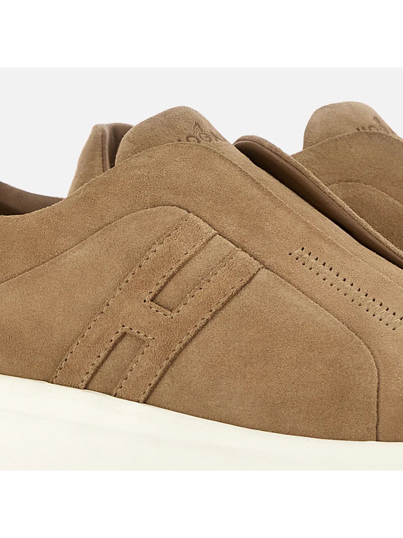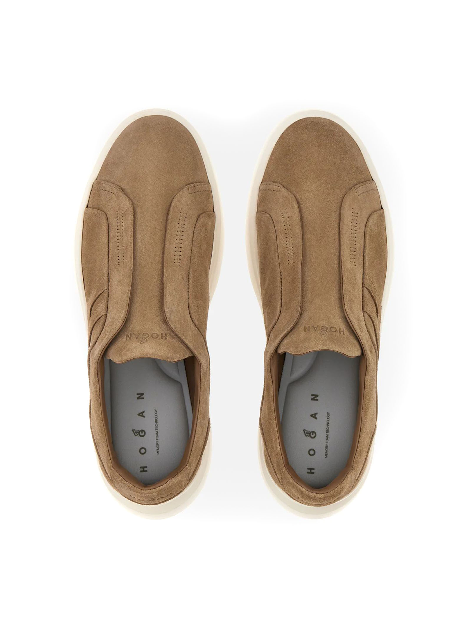 Slip-On Hogan H580 Marrone, Tomaia in pelle scamosciata, H laterale, Inserti elastici nascosti, Fussbett in memory foam 8 mm, Suola in gomma, Altezza totale 4,5 cm