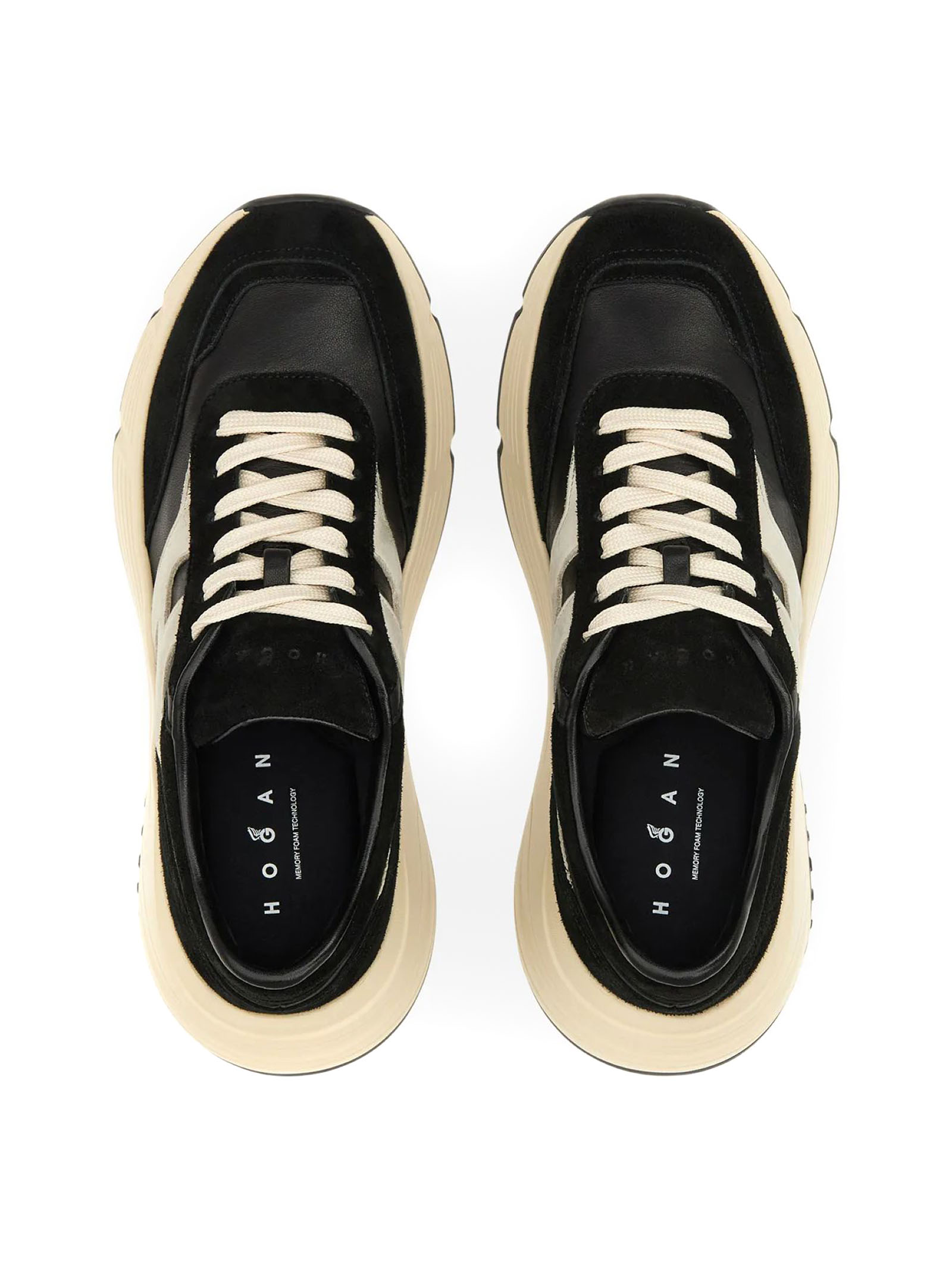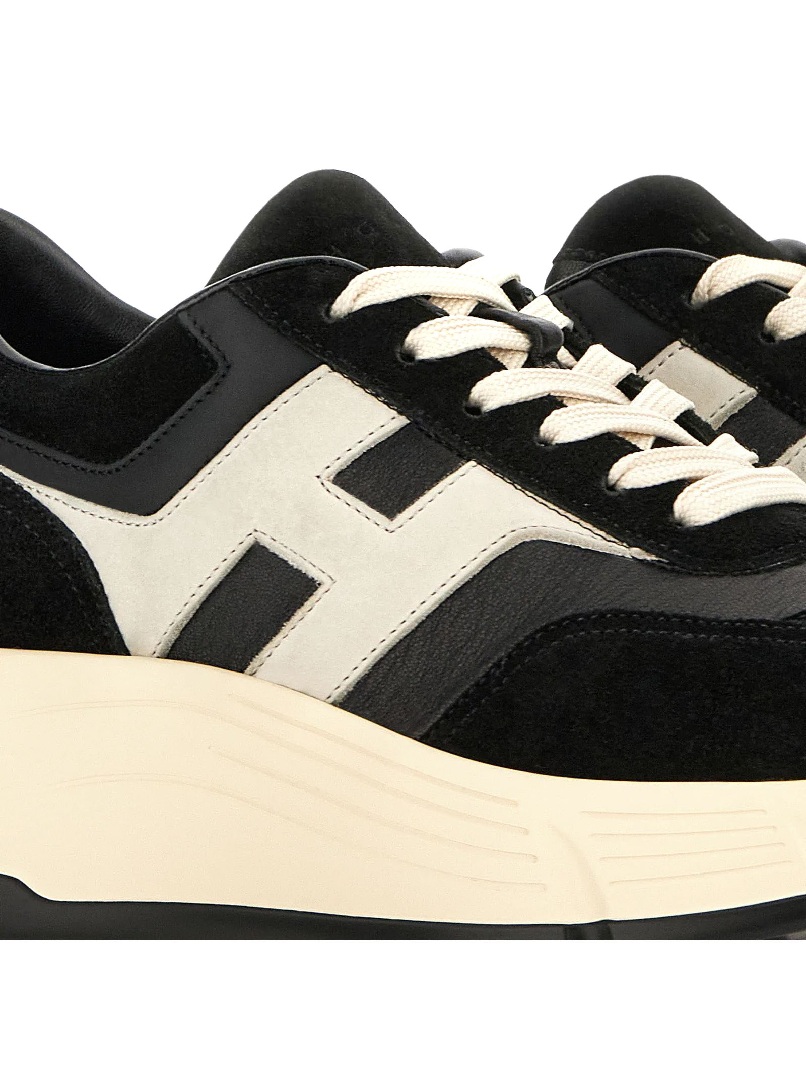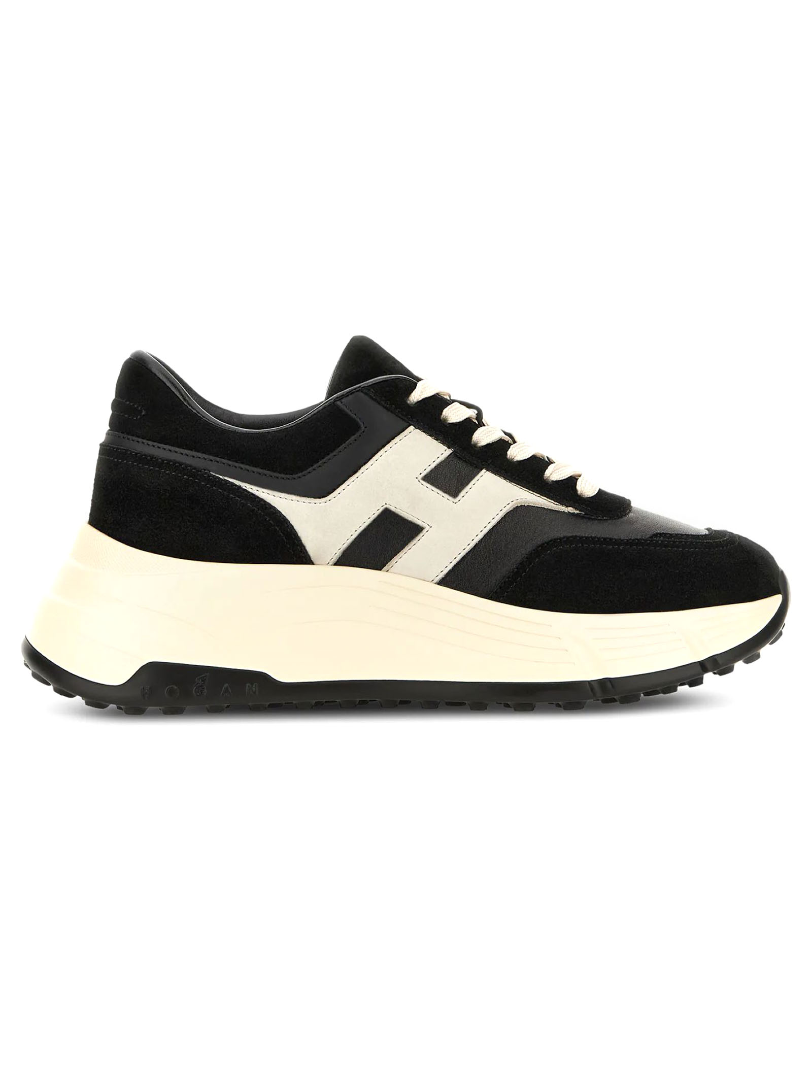 Sneakers Hi-Fi in pelle scamosciata nera, inserti in nappa, H laterale nabuk, dettagli in pelle liscia, soletta in memory foam 8 mm, suola in gomma, altezza totale 6,5 cm