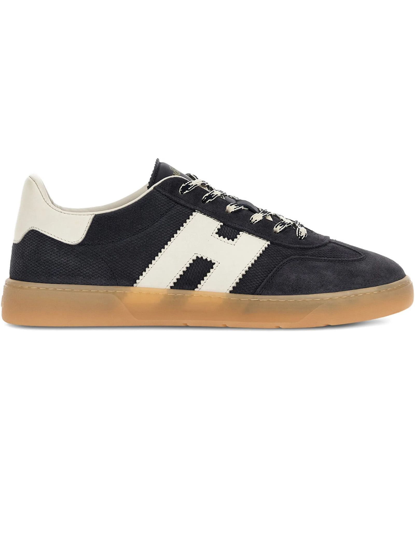 Sneakers Hogan Cool Blu, Tomaia in pelle scamosciata, H laterale in nappa, Dettagli in pelle liscia, Soletta in memory foam 16 mm, Suola a cassetta in gomma (TPU), Altezza totale 2,8 cm