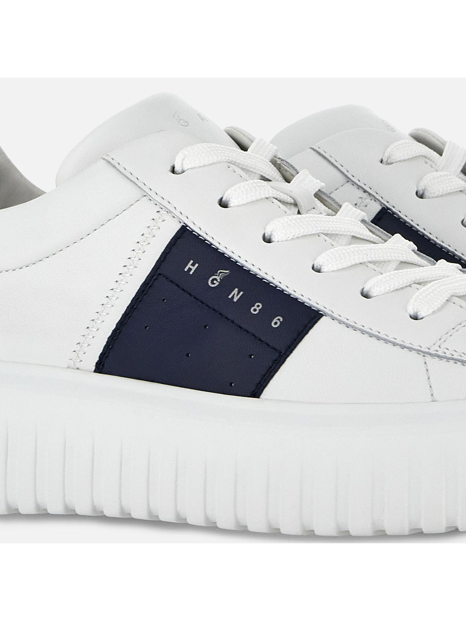 Sneakers Hogan H-Stripes Bianco Blu, Tomaia in nappa, Banda laterale, Soletta in memory foam 8 mm, Suola in EVA, Altezza totale 4,8 cm