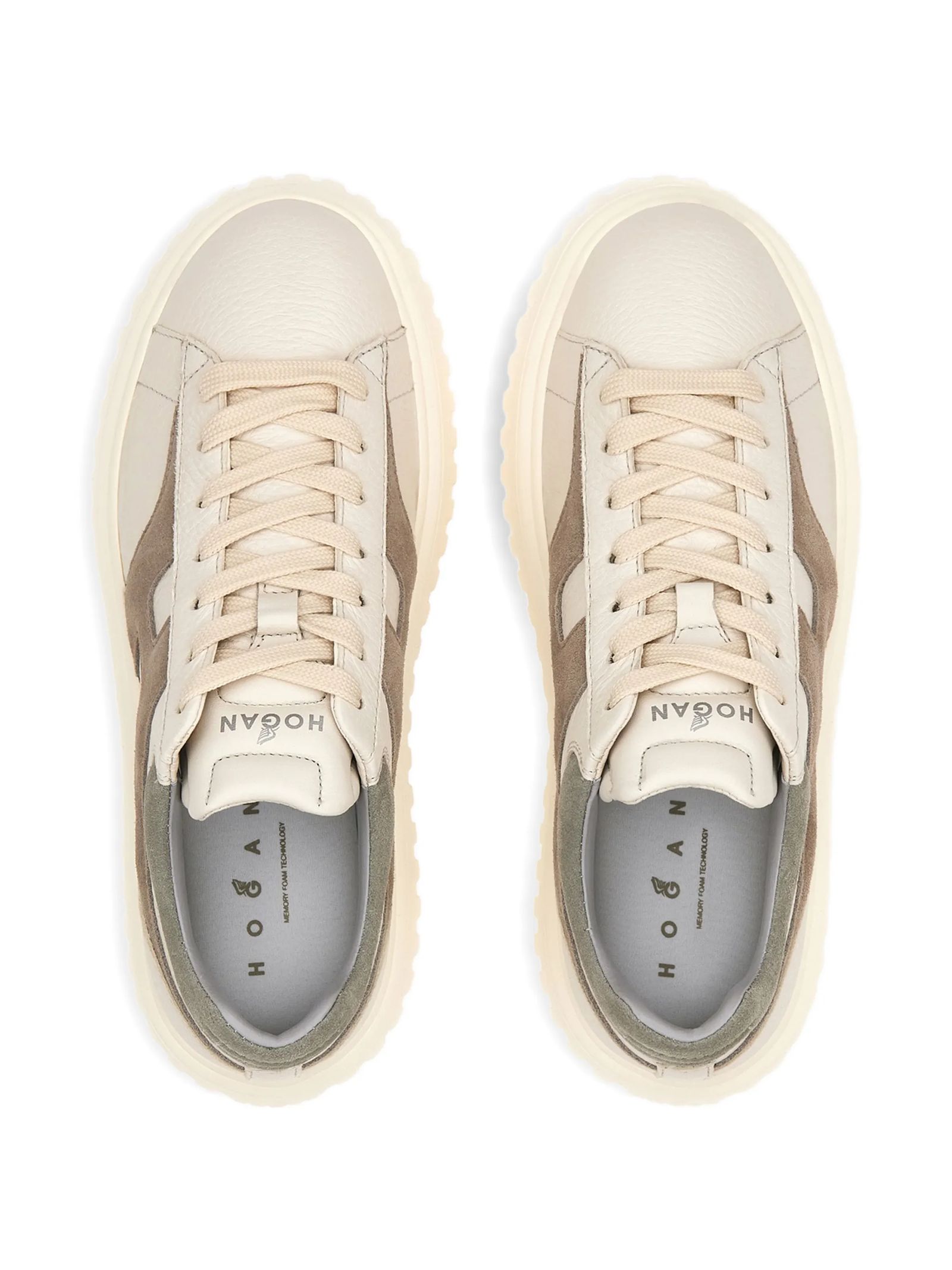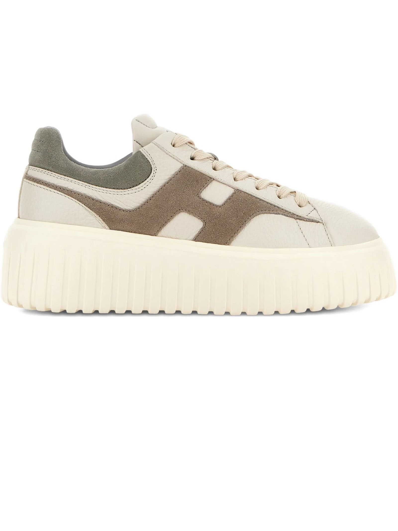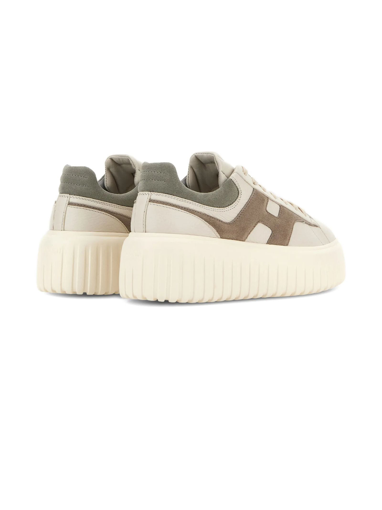 Sneakers Hogan H-Stripes Grigio Avorio Beige, Tomaia in pelle, H laterale in pelle scamosciata, Dettagli in morbida nappa, Soletta in memory foam 8 mm, Suola in EVA, Altezza totale 5,8 cm