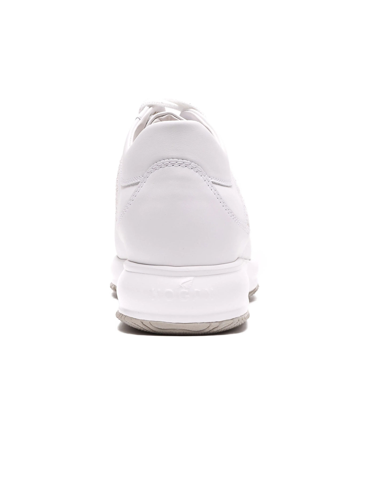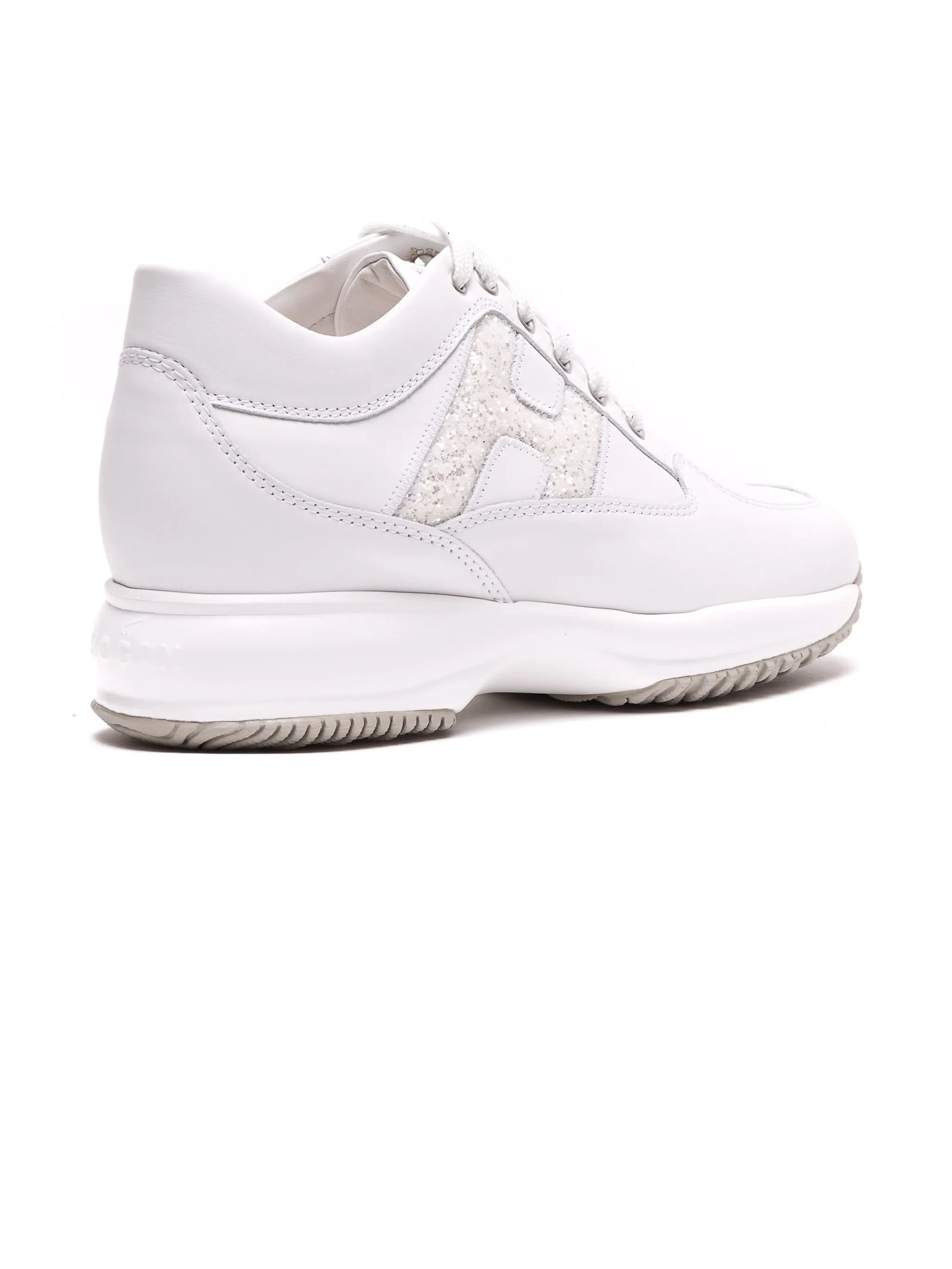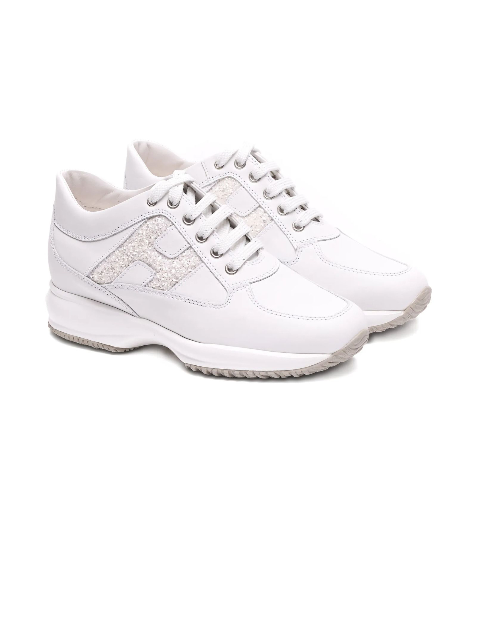 Sneakers Hogan Interactive Bianco, Tomaia in pelle liscia, H laterale in tessuto glitter, Soletta removibile 1,2 cm, Suola in gomma, Altezza totale 5,7 cm
