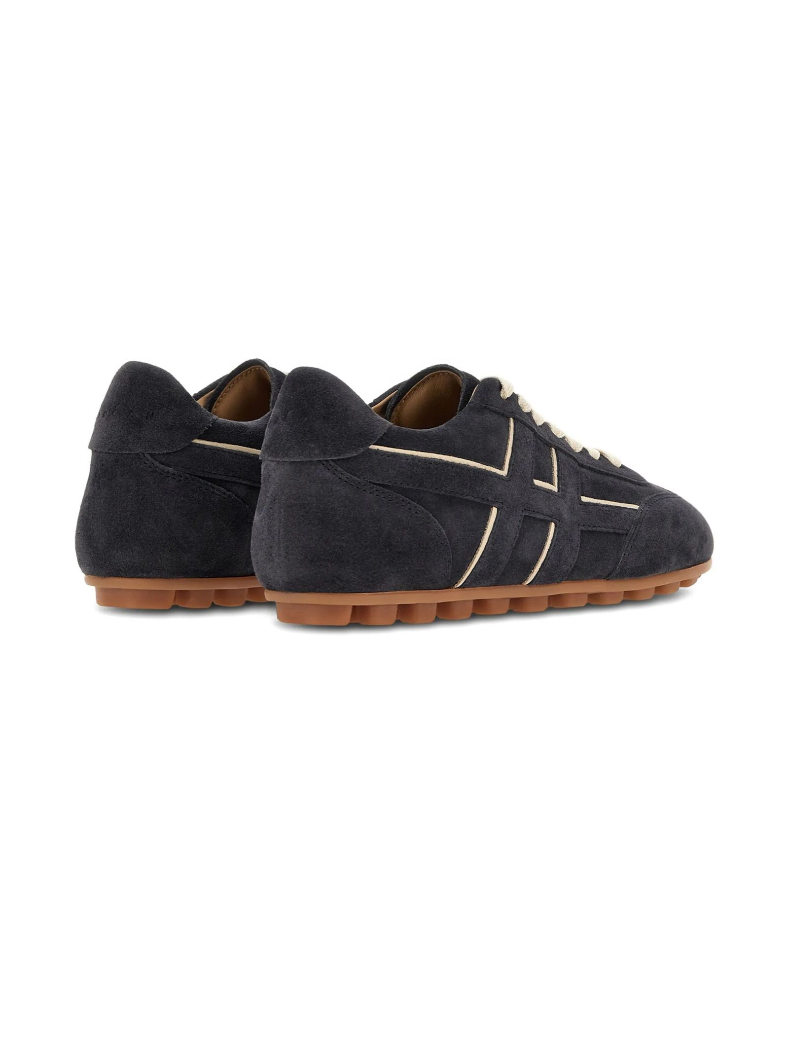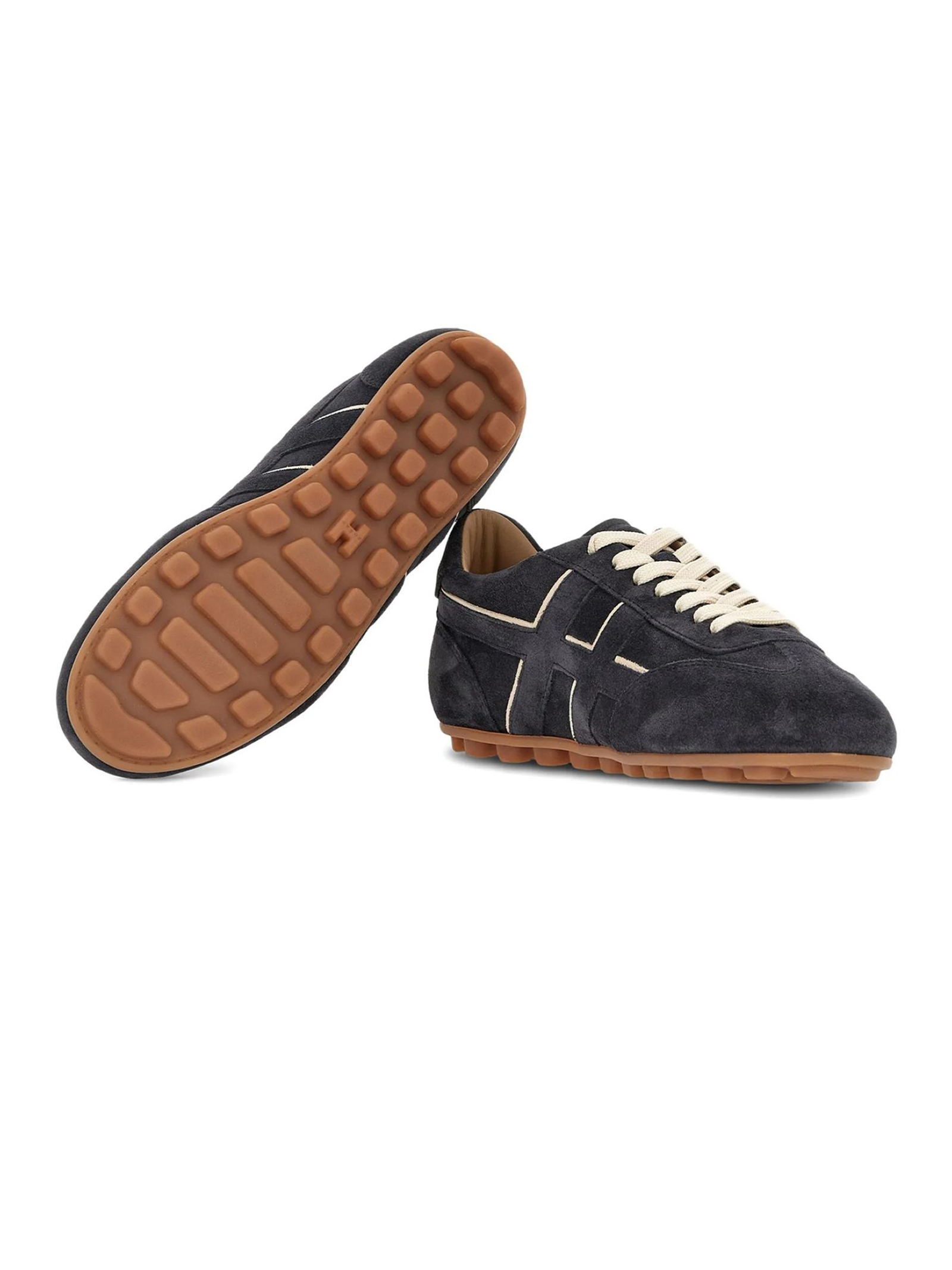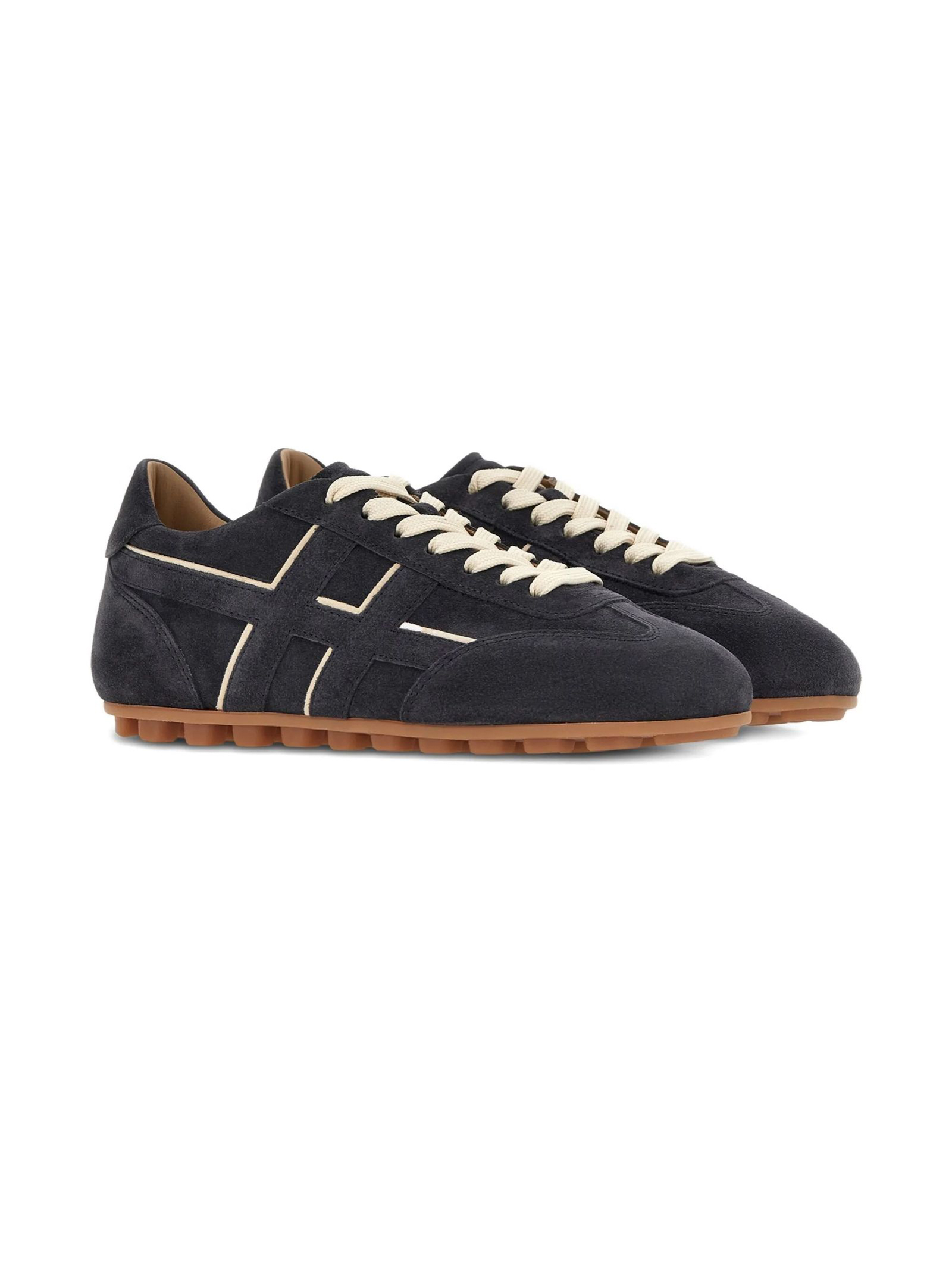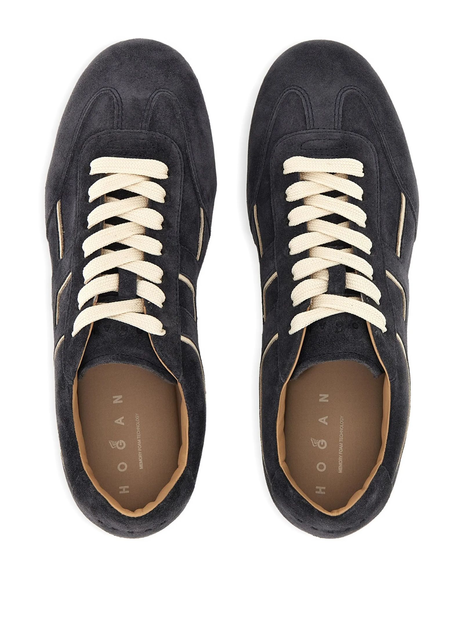 Sneakers Hogan Olympia Blu, tomaia in pelle scamosciata, dettagli in nabuk, H laterale, Logo impresso su linguetta e tallone, Fodera in pelle, Soletta in memory foam 9 mm, Suola in gomma, Altezza totale 3,2 cm