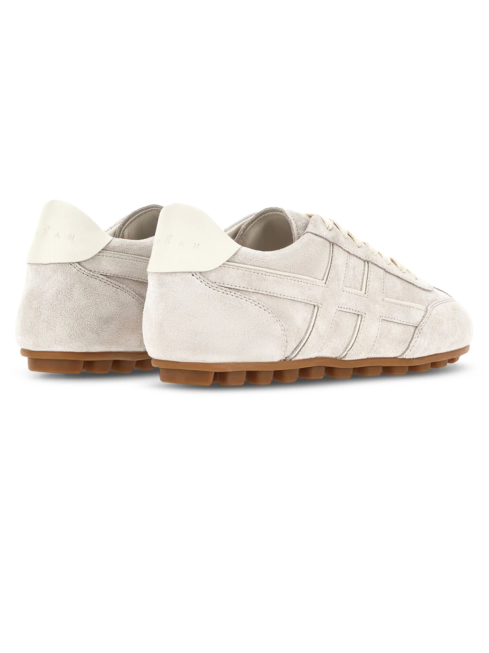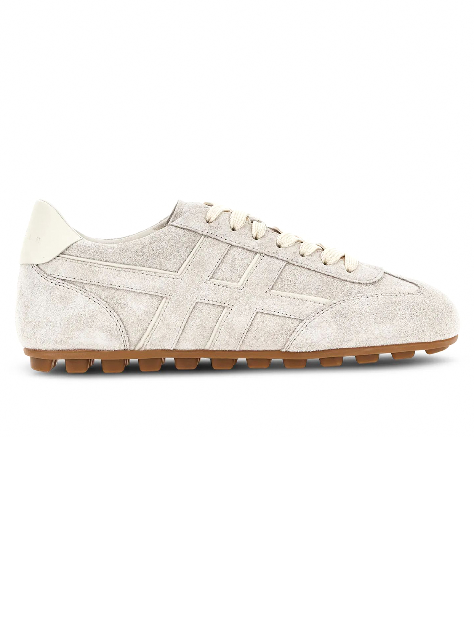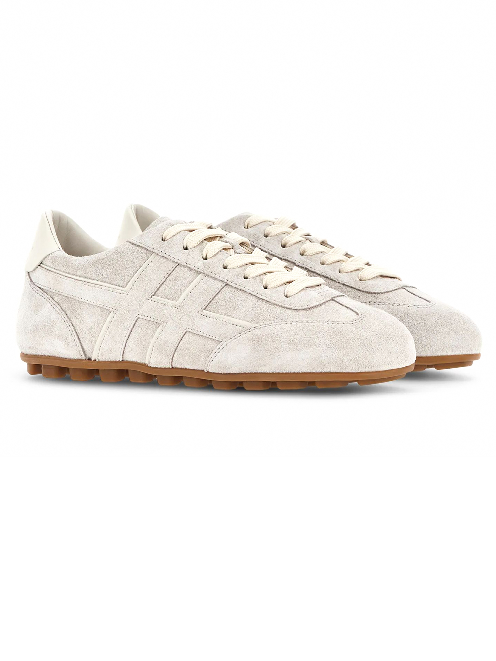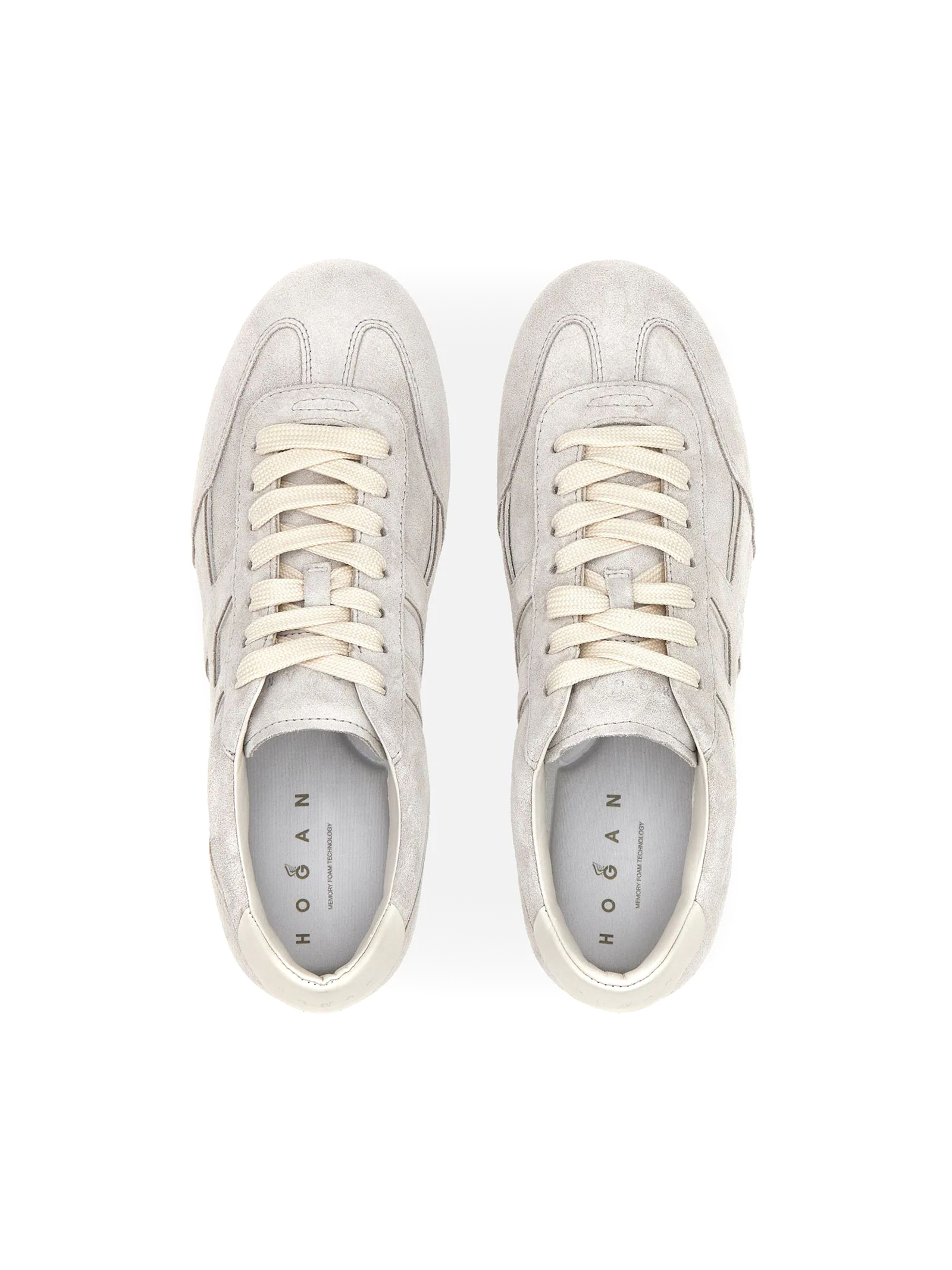 Sneakers Hogan Olympia Grigio, Tomaia in pelle scamosciata, H laterale, Dettagli in pelle liscia, Logo impresso su linguetta e tallone, Fodera in pelle, Soletta in memory foam 9 mm, Suola in gomma, Altezza totale 3,2 cm