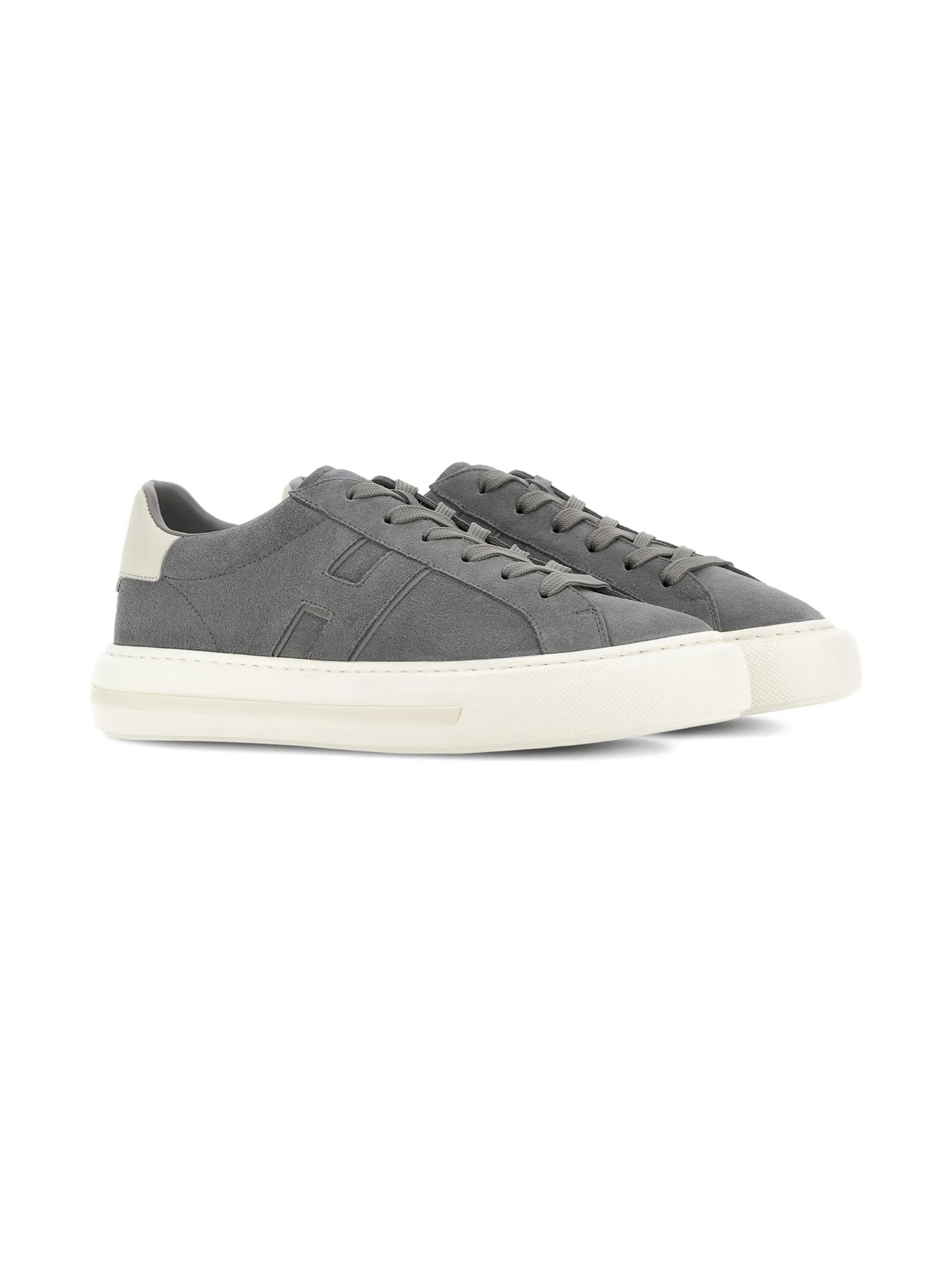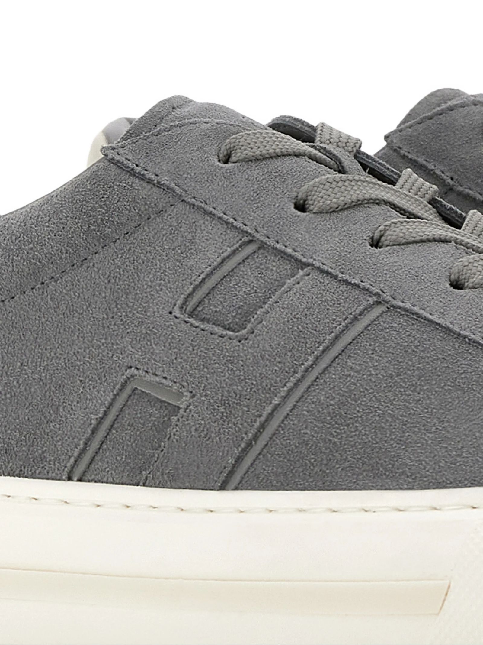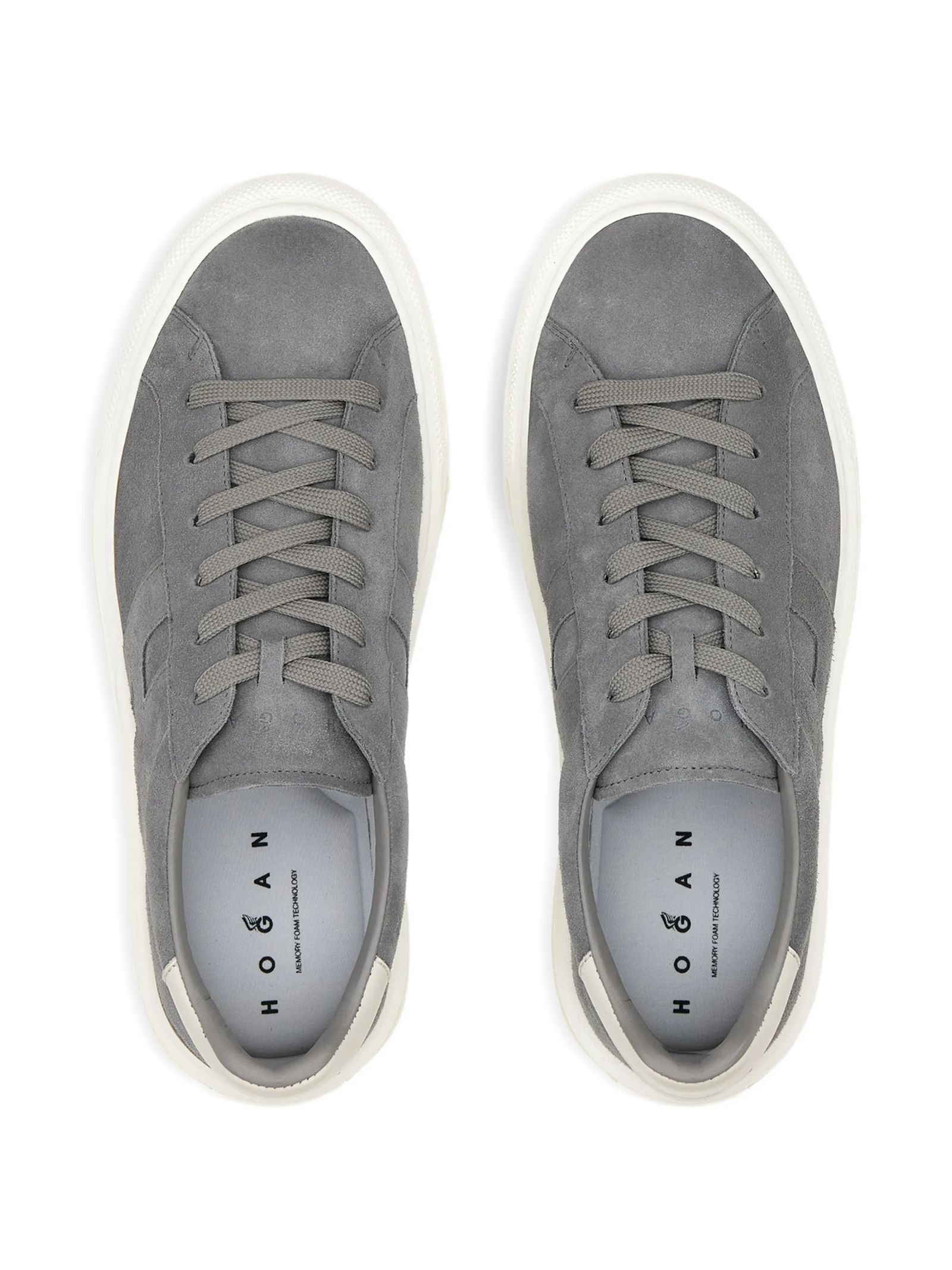 Sneakers Hogan Rebel Grigio, Tomaia in pelle scamosciata, Dettagli in pelle liscia, H laterale, Logo Hogan impresso sulla linguetta, Soletta in memory foam, Suola in gomma, Altezza totale 3,8 cm