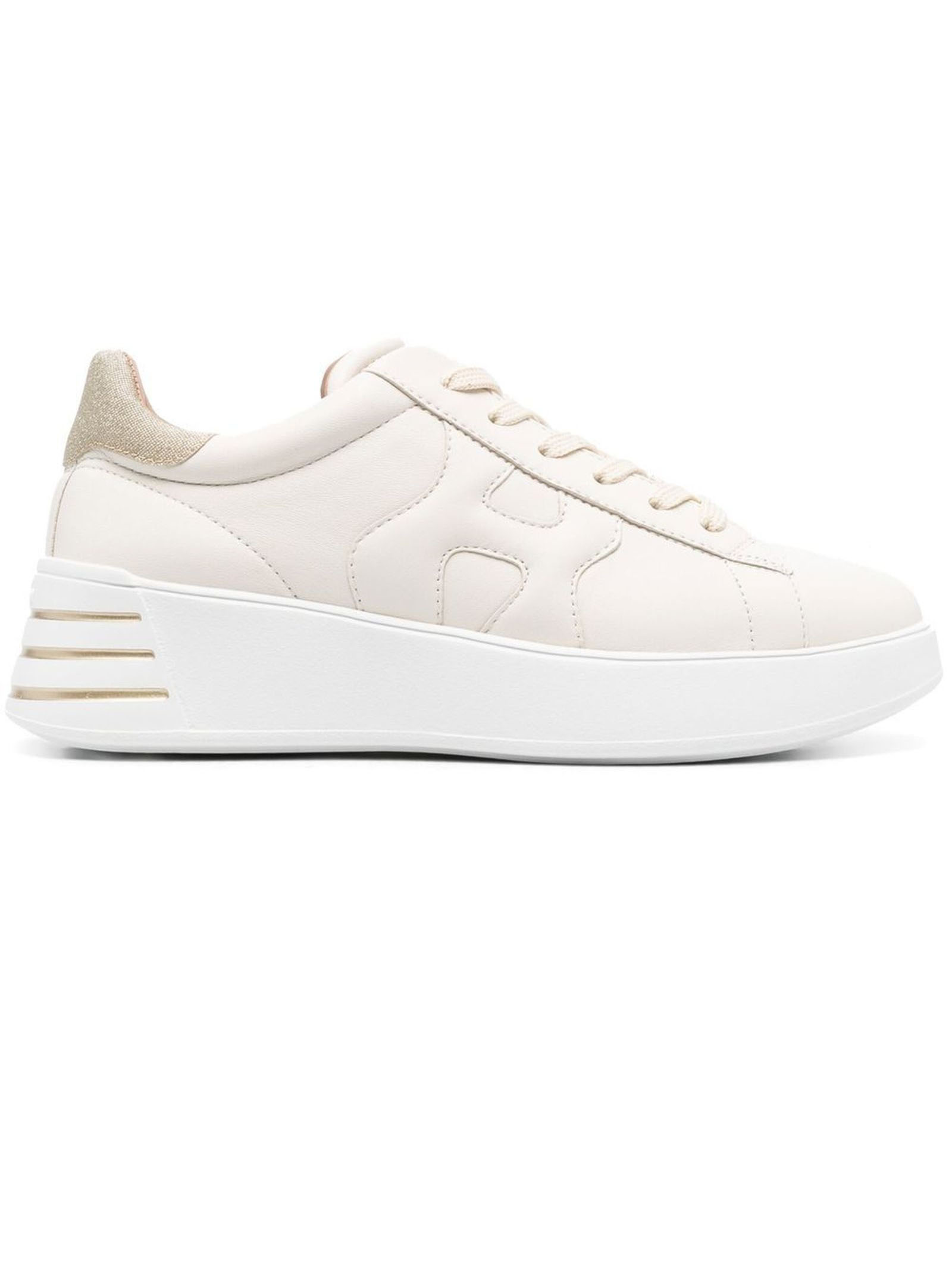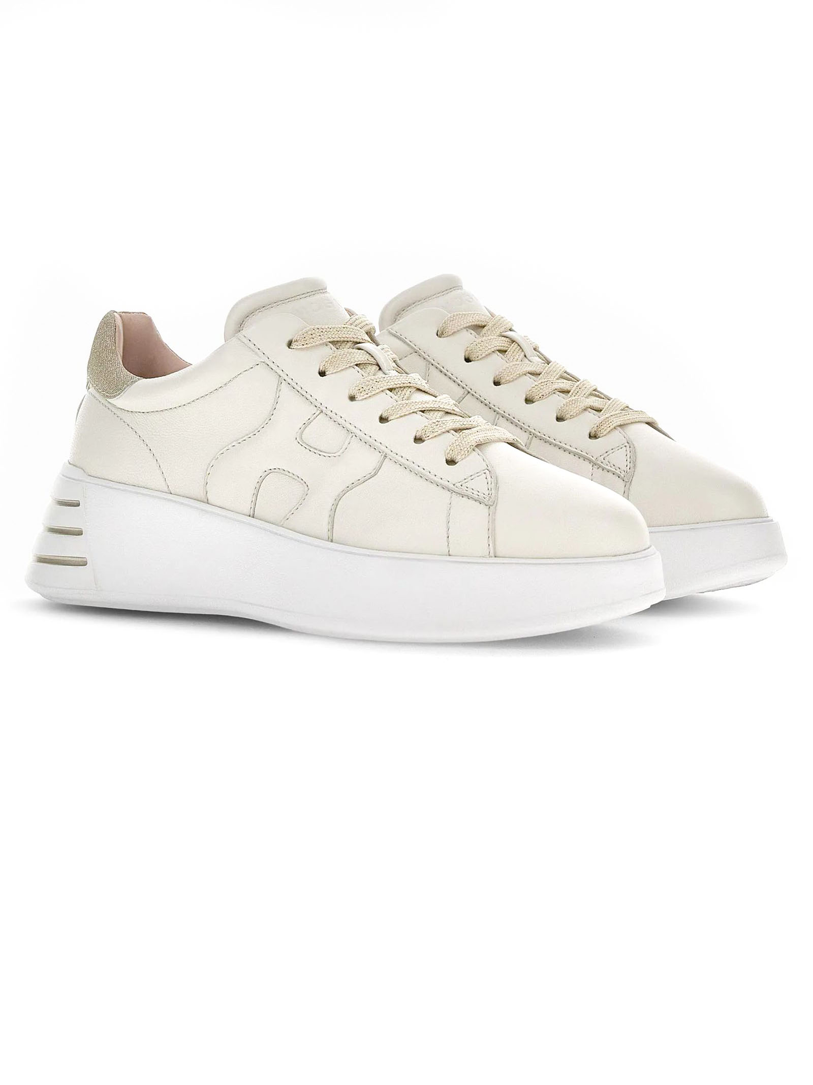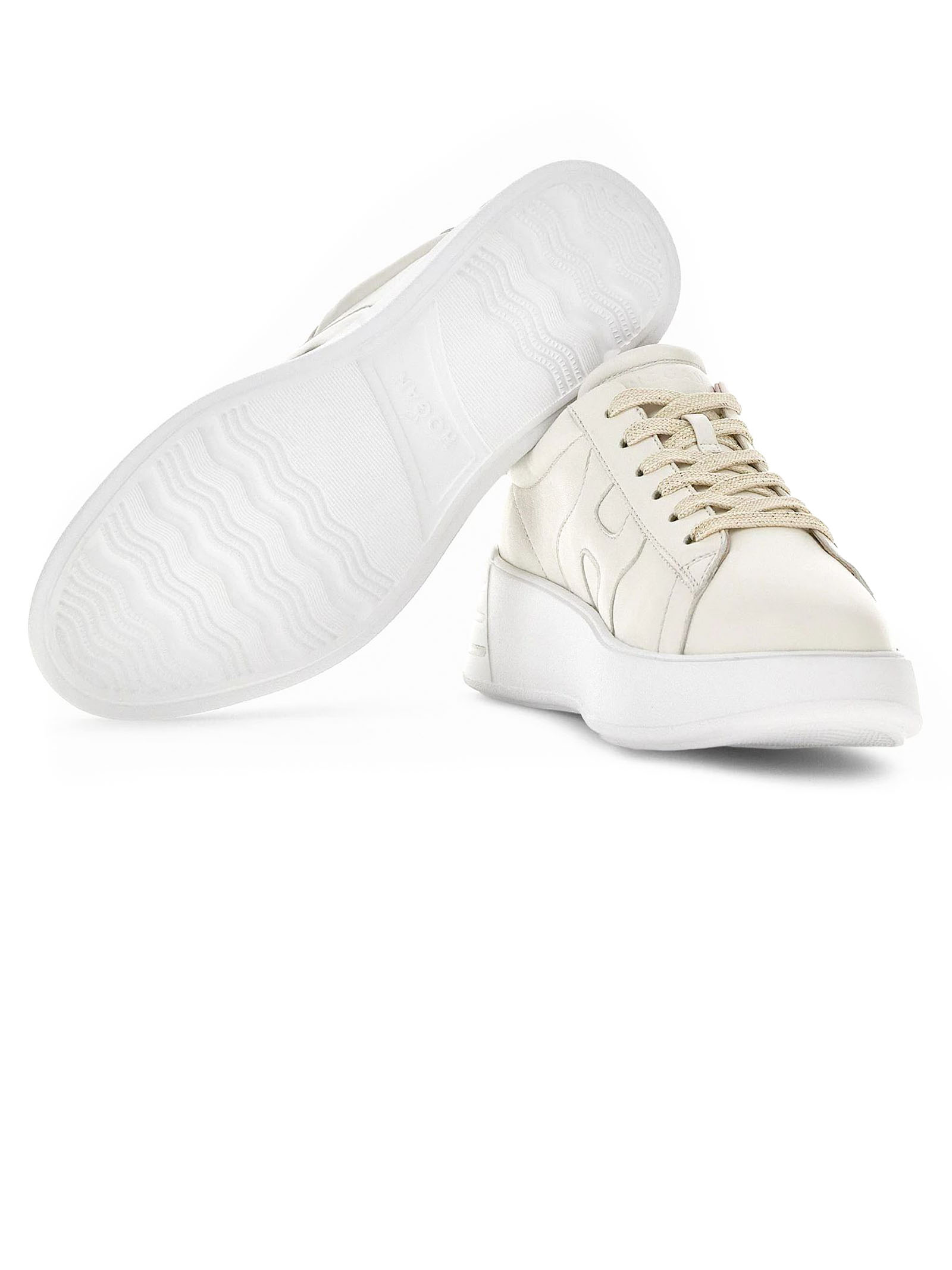 Sneakers Hogan Rebel in nappa Avorio, dettagli in tessuto glitterato, H laterale ondulata, soletta in memory foam 5 mm, suola in gomma, altezza totale 5 cm
