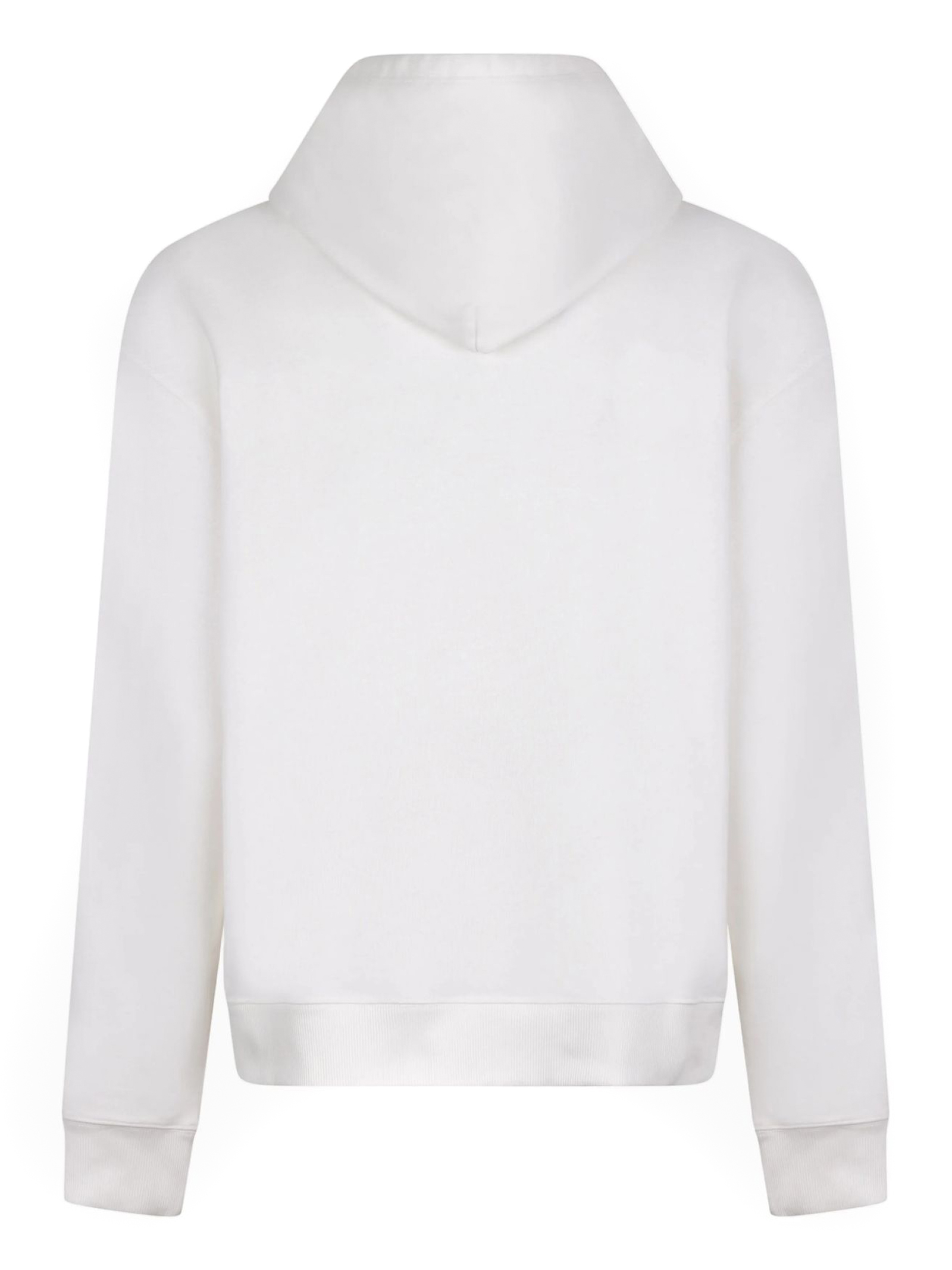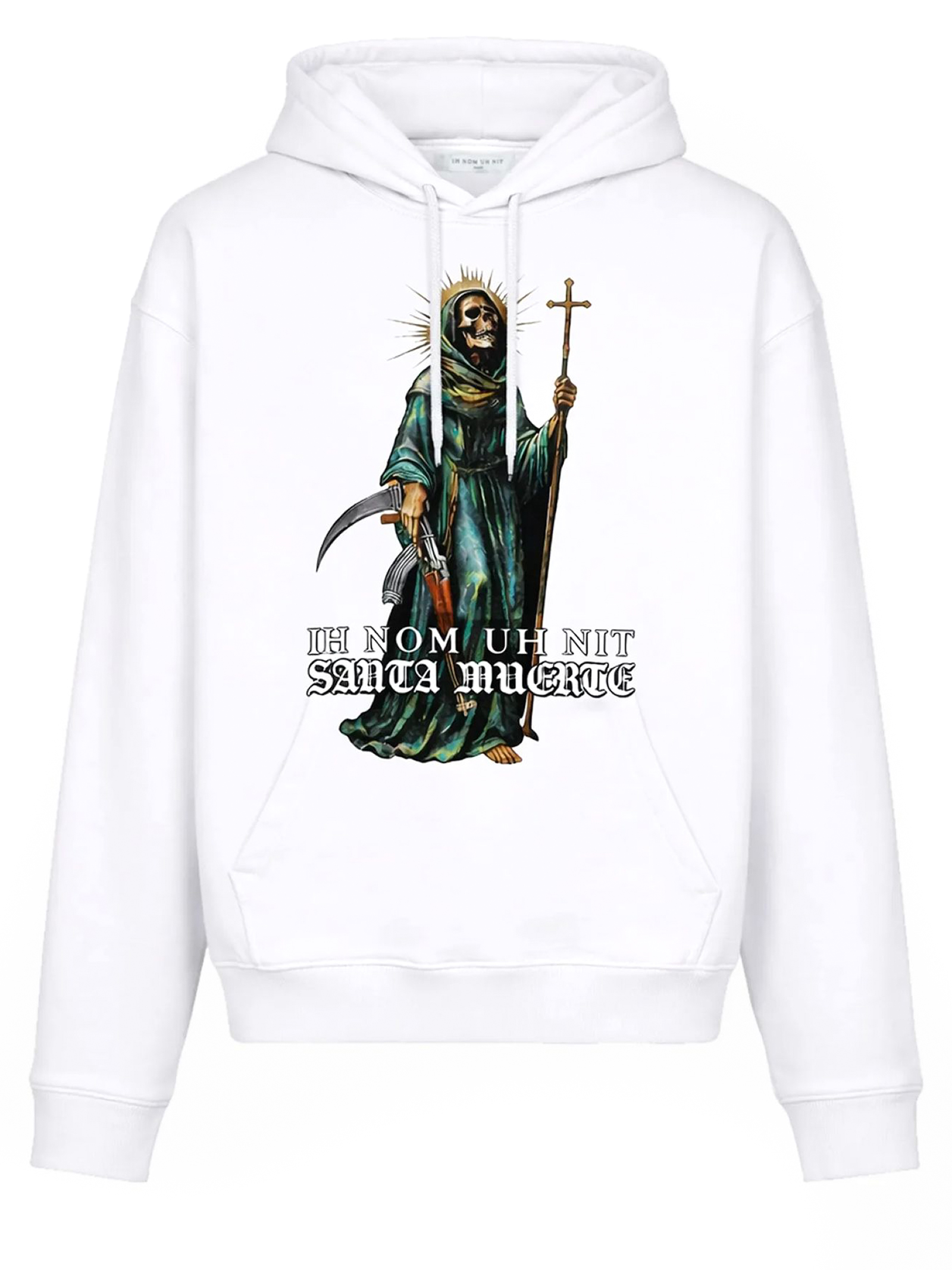 Felpa con cappuccio bianca Santa Muerte Print, grafica Santa Muerte stampata al centro, abbinata alla scritta IH NOM UH NIT Santa Muerte per un look audace e simbolico, retro pulito senza grafiche aggiuntive, cappuccio con coulisse regolabile, polsini e orlo a costine, tasca a marsupio frontale.