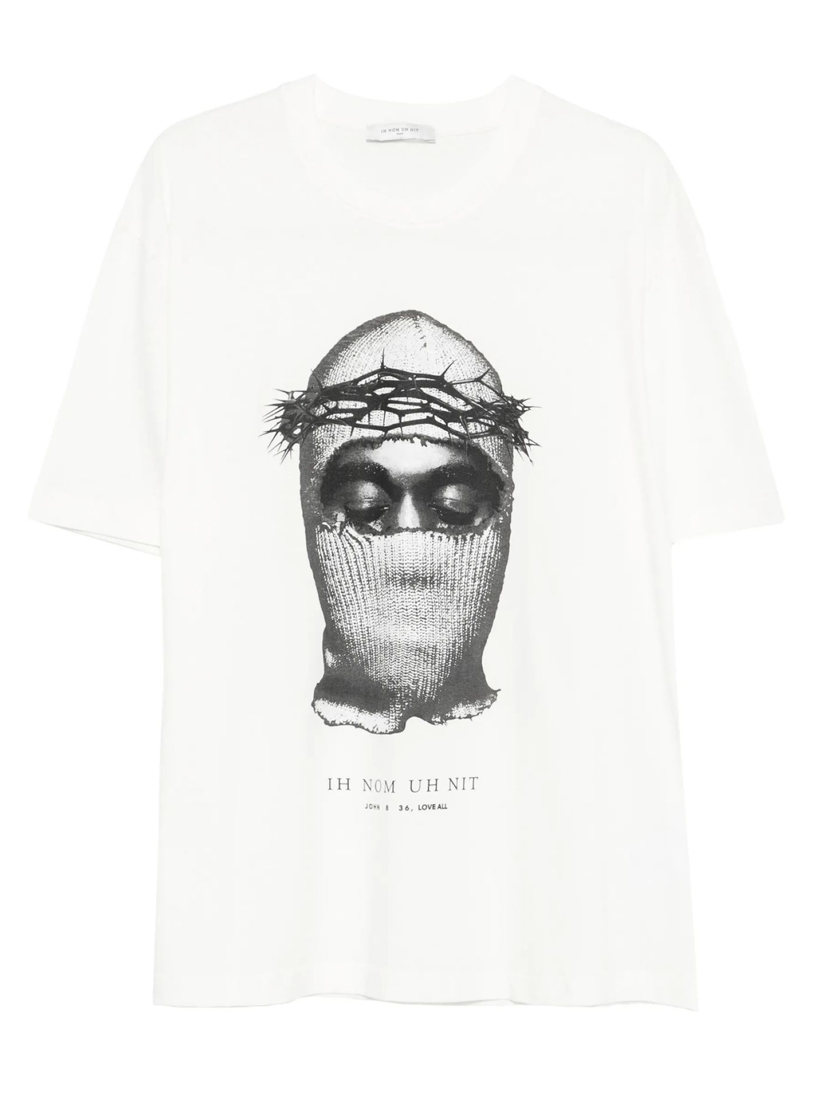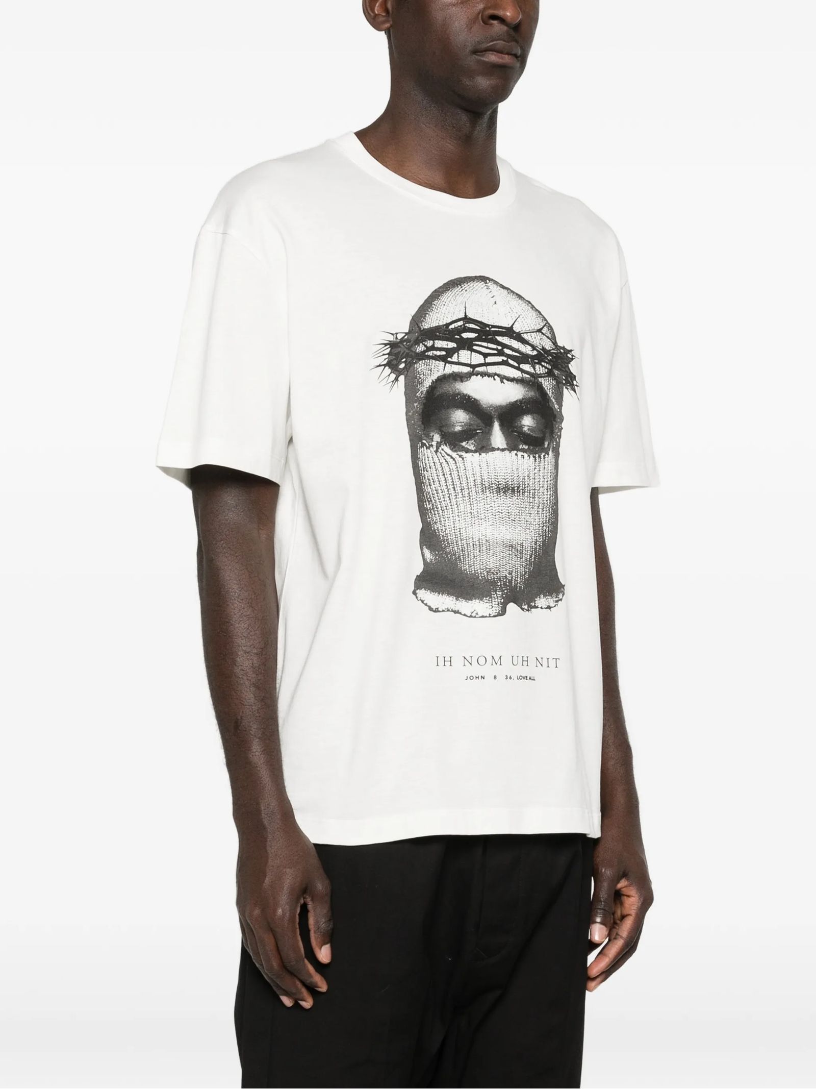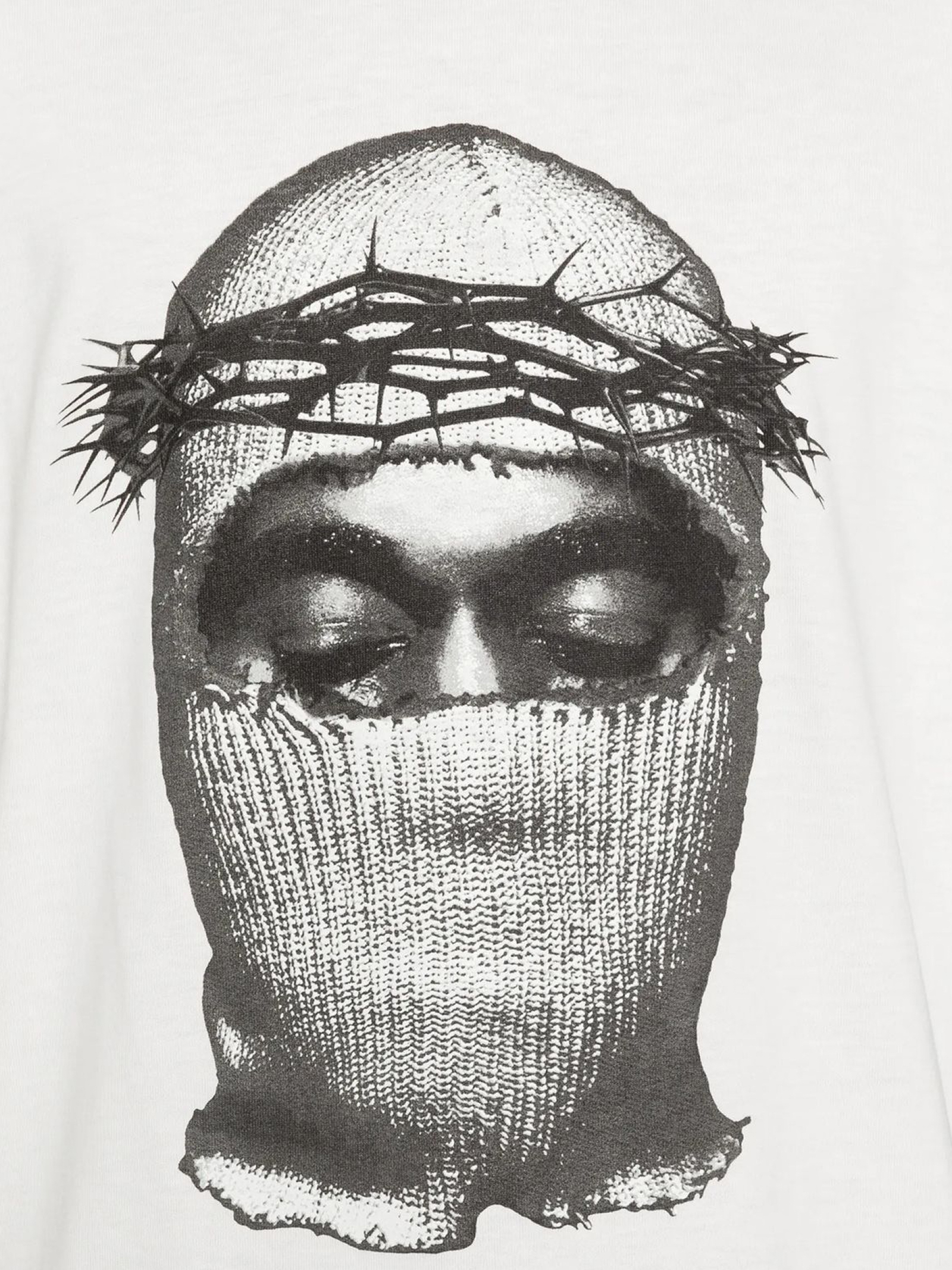 T-shirt Corona Mask in cotone bianco con stampa grafica, girocollo, maniche corte