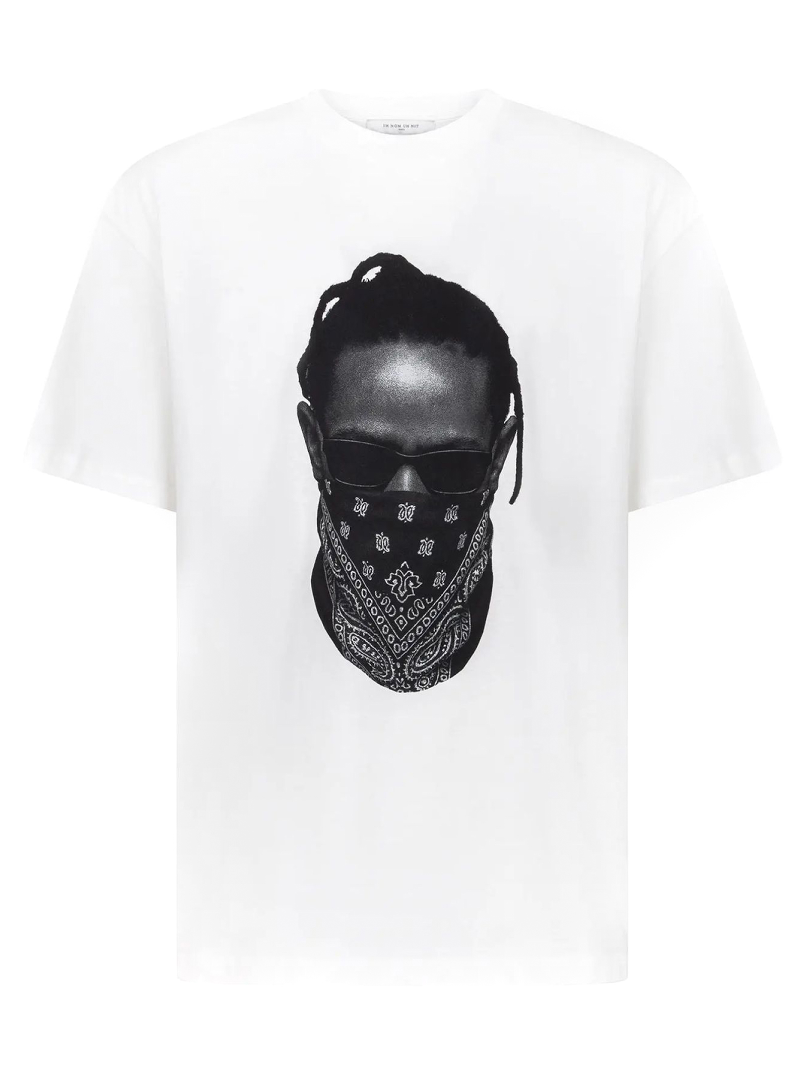 T-shirt CWY Mask in cotone bianco con grafica monocromatica raffigurante un volto con occhiali da sole e mascherina bandana paisley, vestibilità regolare, grande logo IH NOM UH NIT PARIS stampato sulla parte superiore della schiena in bianco a contrasto, collo a costine, maniche corte e orlo pulito per una finitura elegante e minimalista