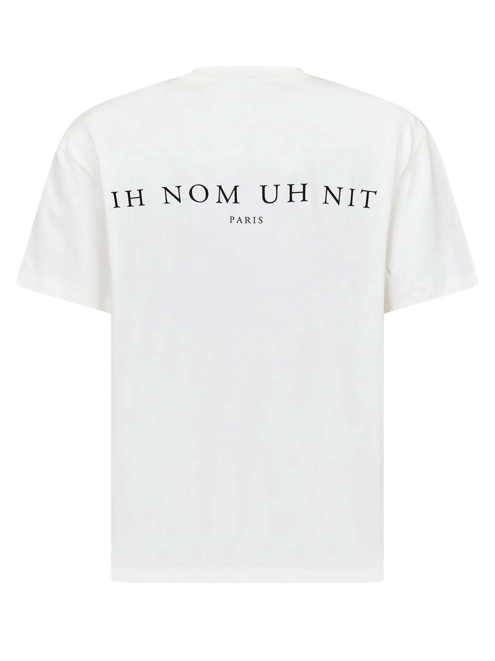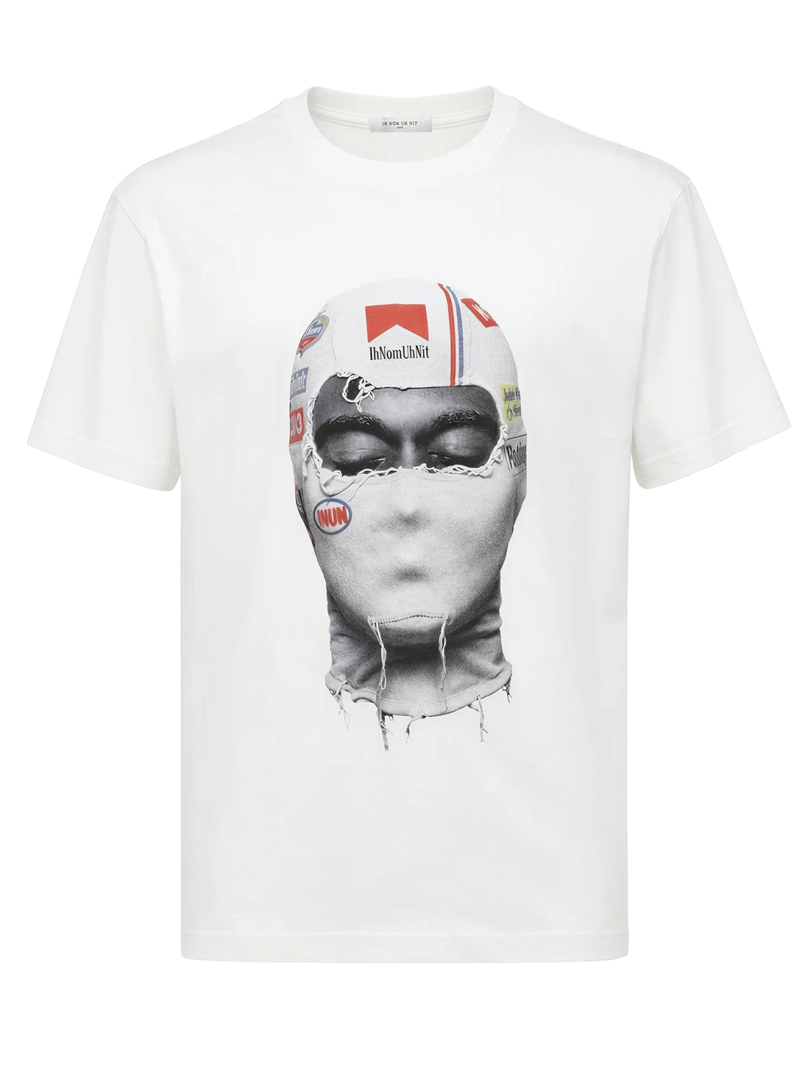 T-shirt in cotone bianco con stampa Mask Racing, con una grafica centrale ispirata alle corse automobilistiche e dettagli grezzi e consumati che definiscono l'identità visiva del capo, vestibilità regolare con linea dritta, retro pulito rifinito con la stampa del logo IH NOM UH NIT Paris posizionata sulle spalle, girocollo, maniche corte