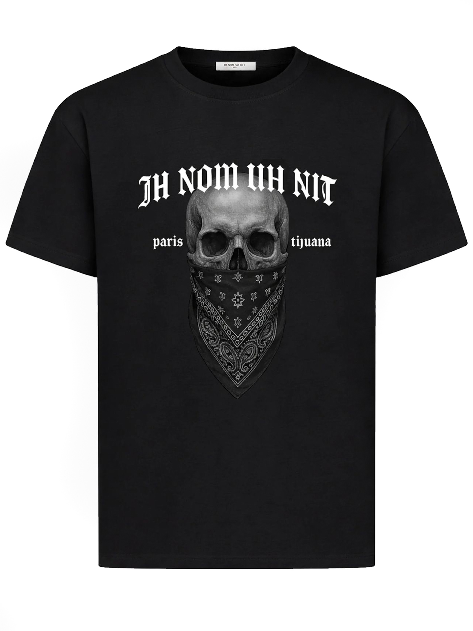 T-shirt nera in cotone con stampa Skull 20, audace grafica con teschio e bandana stampata al centro, incorniciata dalla scritta IH NOM UH NIT con riferimenti a Paris e Tijuana. Un look grezzo, ispirato alla strada, con una forte identità, vestibilità comoda