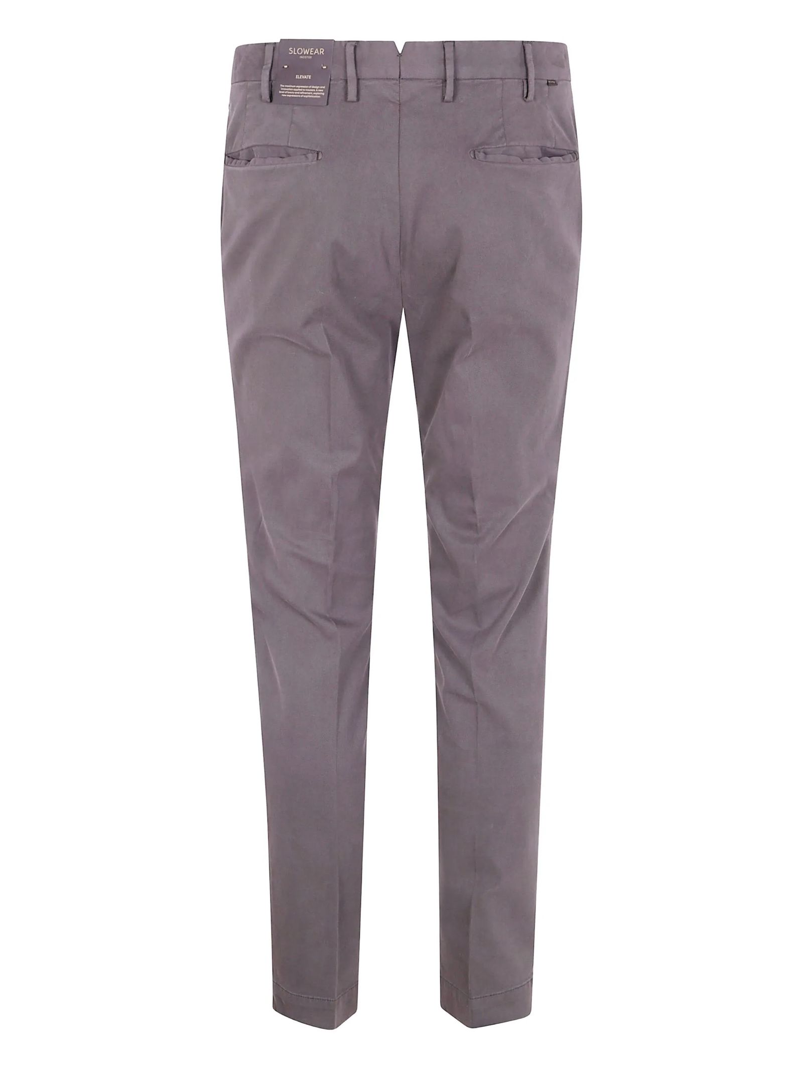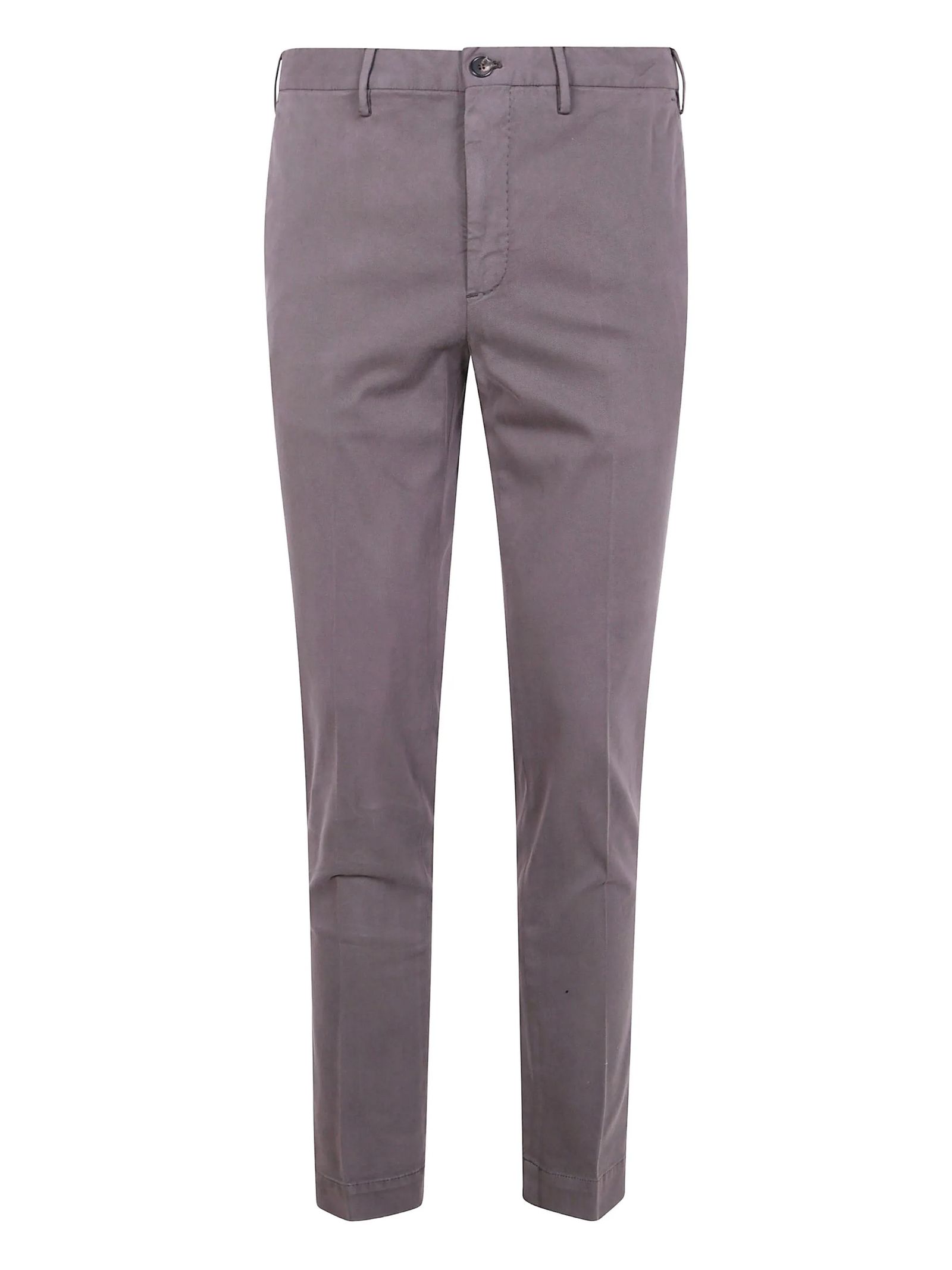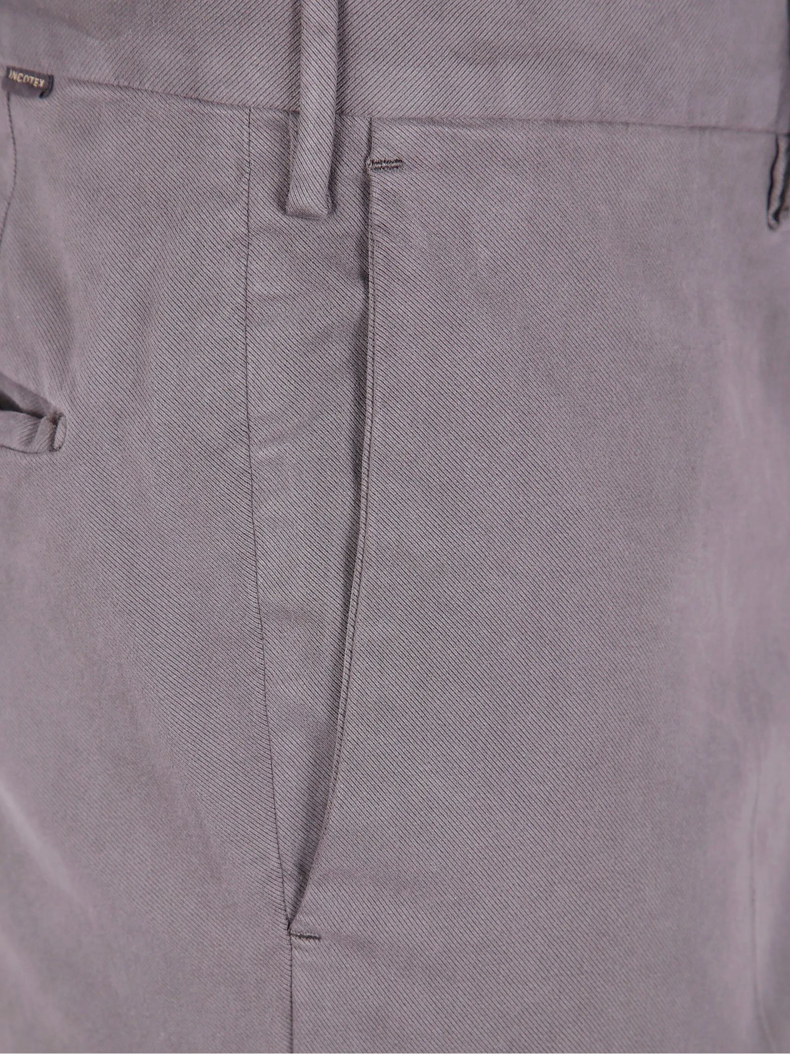 Pantaloni in cotone taupe, parte frontale liscia, chiusura con zip, chiusura a bottoni, tasche laterali, tasche a filetto