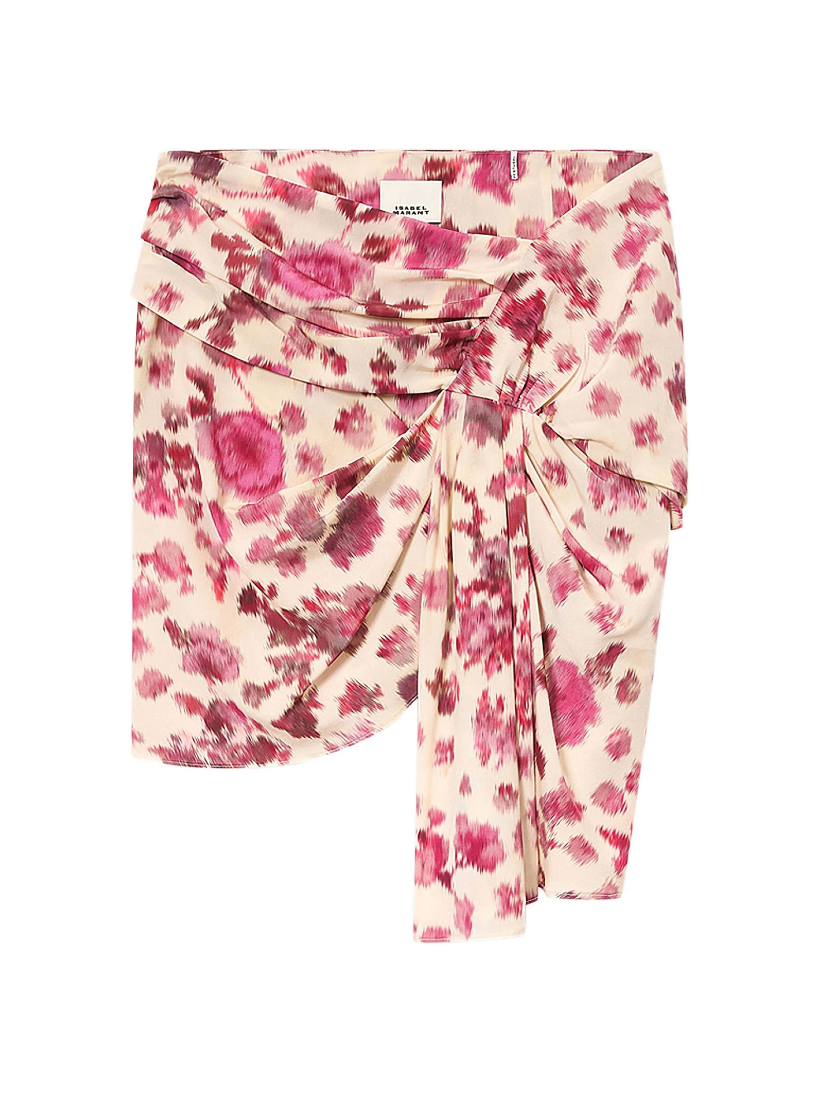 Gonna corta drappeggiata in seta stretch con rose stampate, Fascia fissata in vita e zip invisibile sul fianco, Grande pannello annodato davanti, Taglio aderente e lunghezza asimmetrica