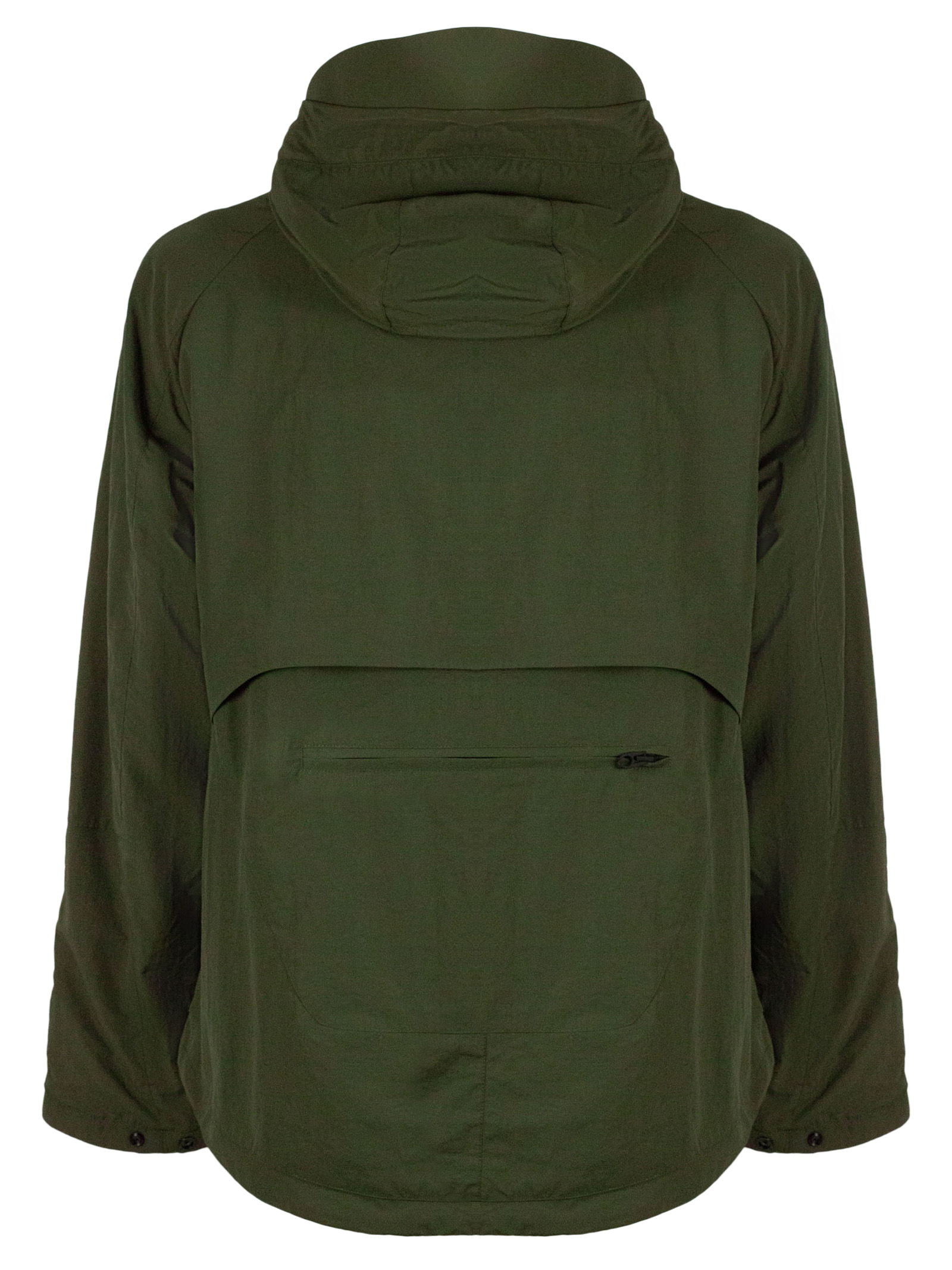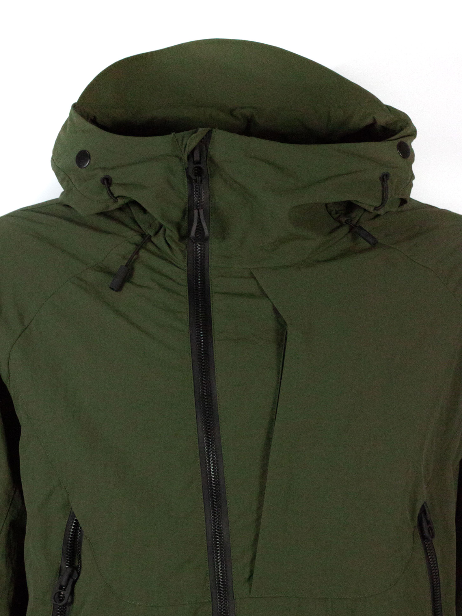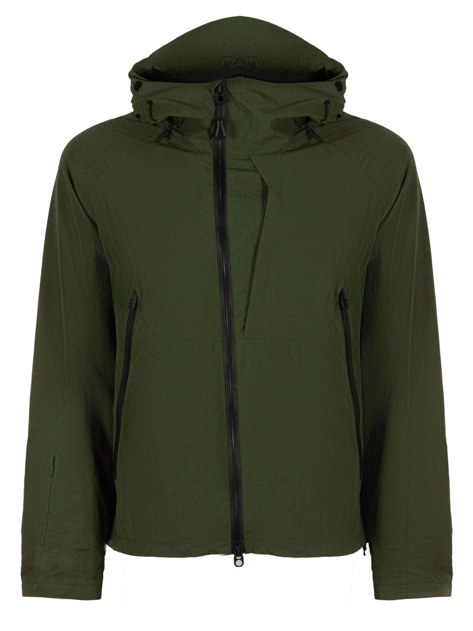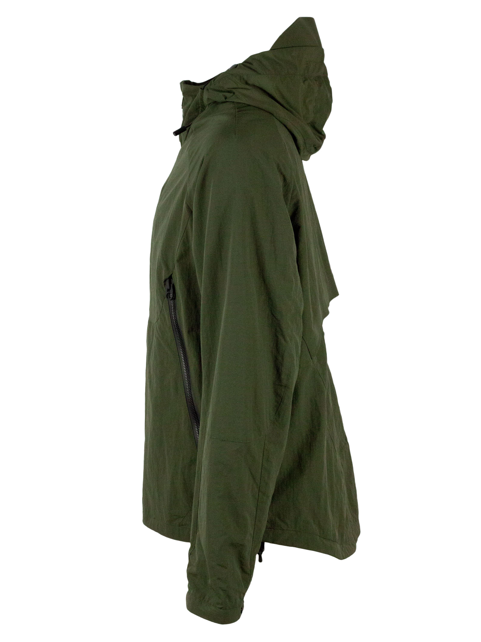 Giubbotto in tessuto tecnico verde con cappuccio e coulisse, maniche lunghe, tasche laterali con zip, chiusura frotnale asimmetrica