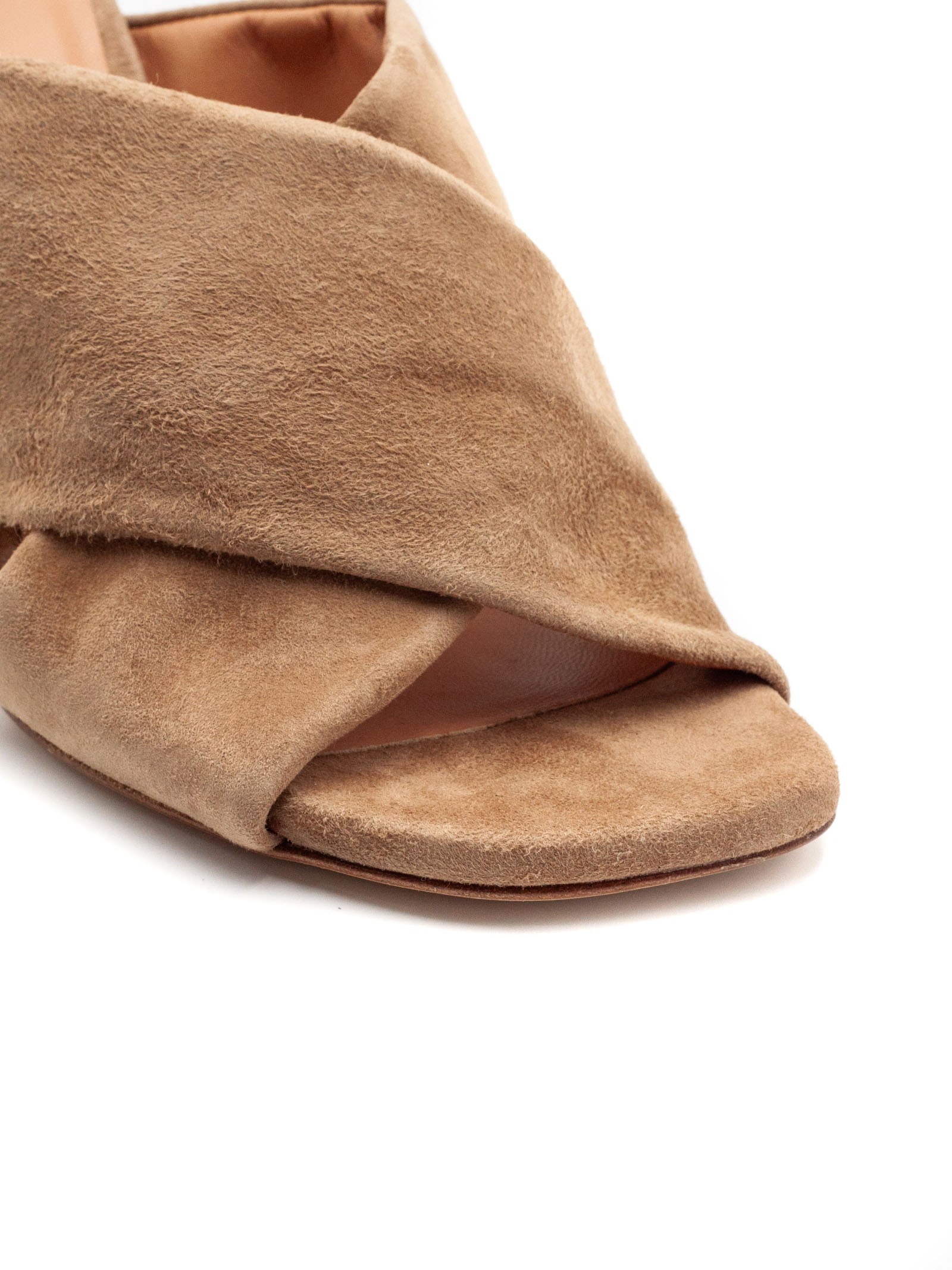 Sandalo in camoscio marrone con punta aperta, fasce incrociate, suola in cuoio con logo, altezza tacco 9 cm