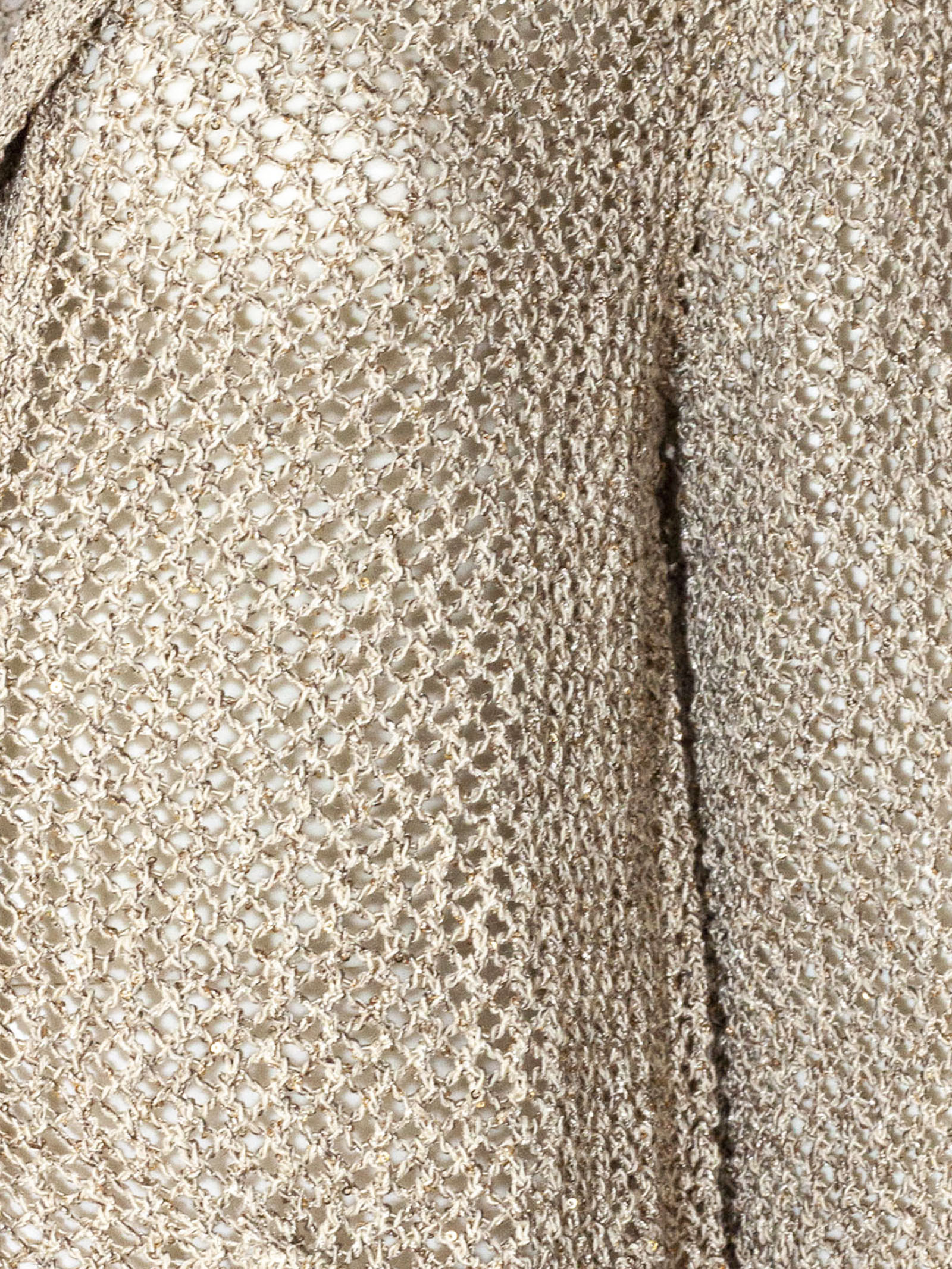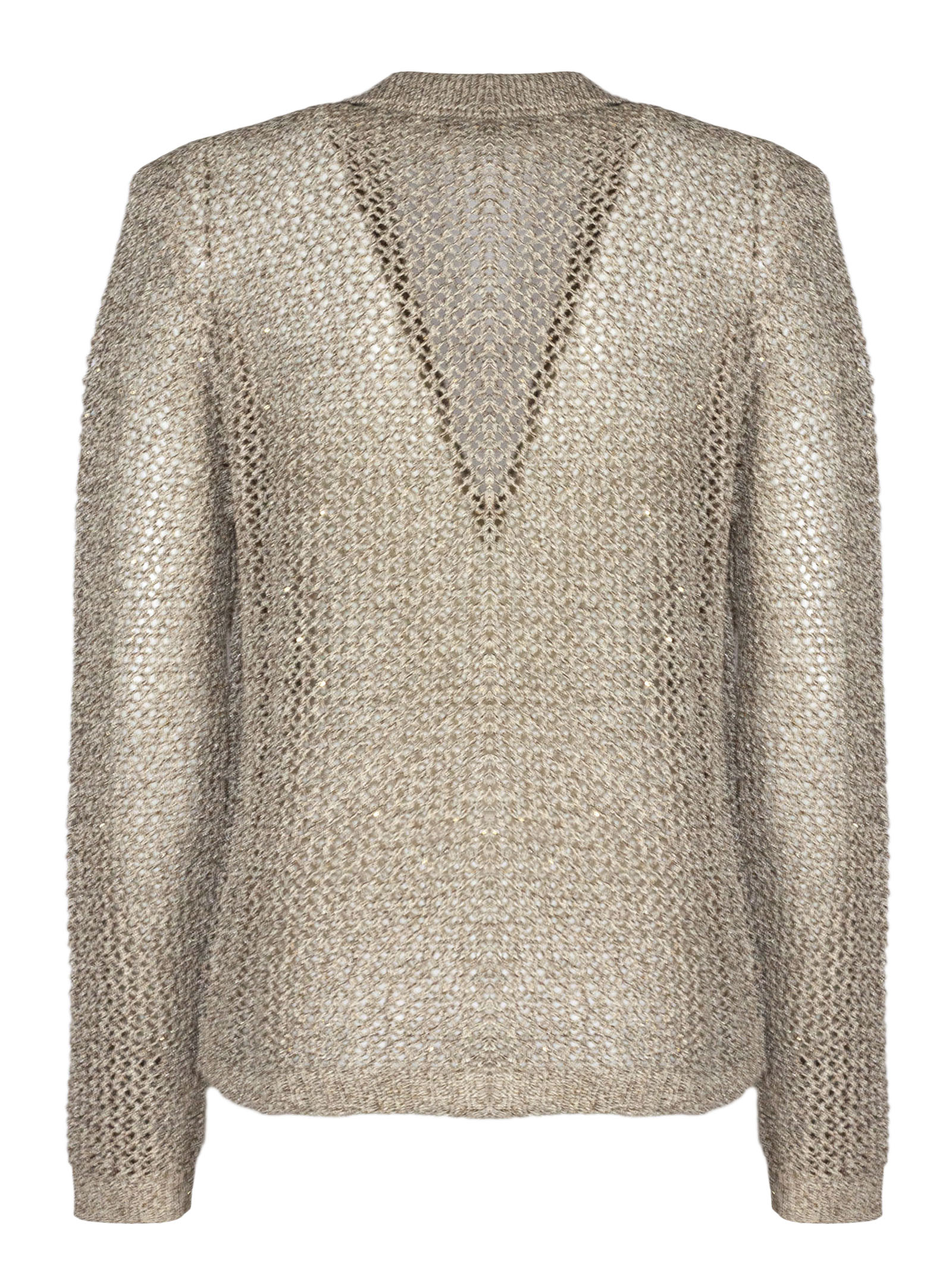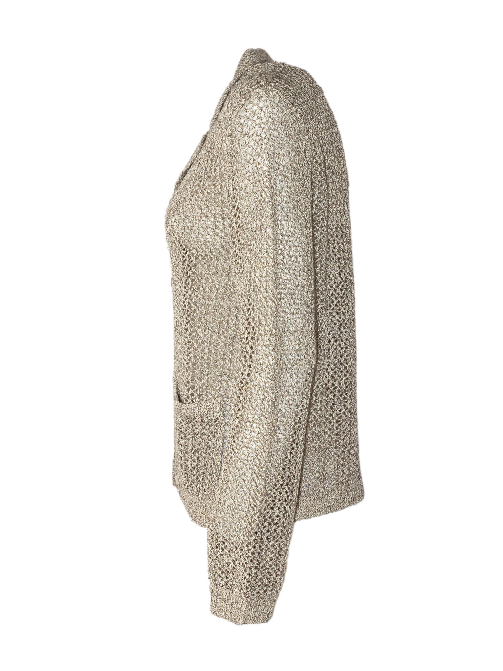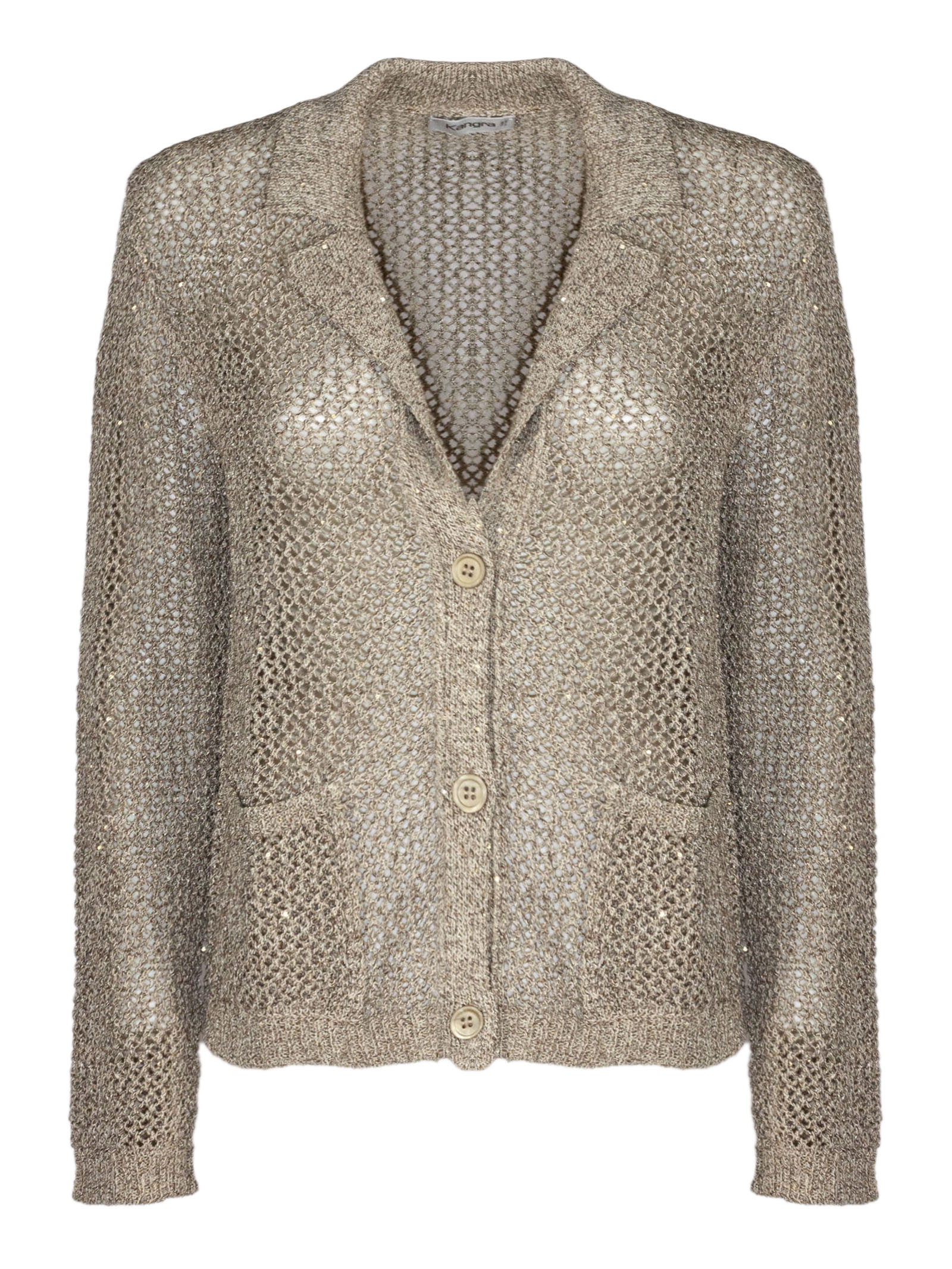 Blazer con collo a rever in filato di cotone-viscosa con paillettes e lavorazione punto rete, regular fit, la maglia a rete crea trasparenze, tasche applicate e chiusura con bottoni frontali