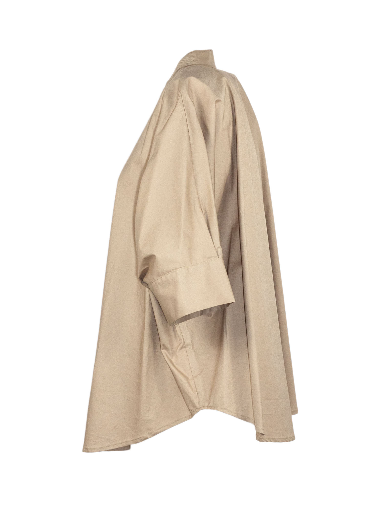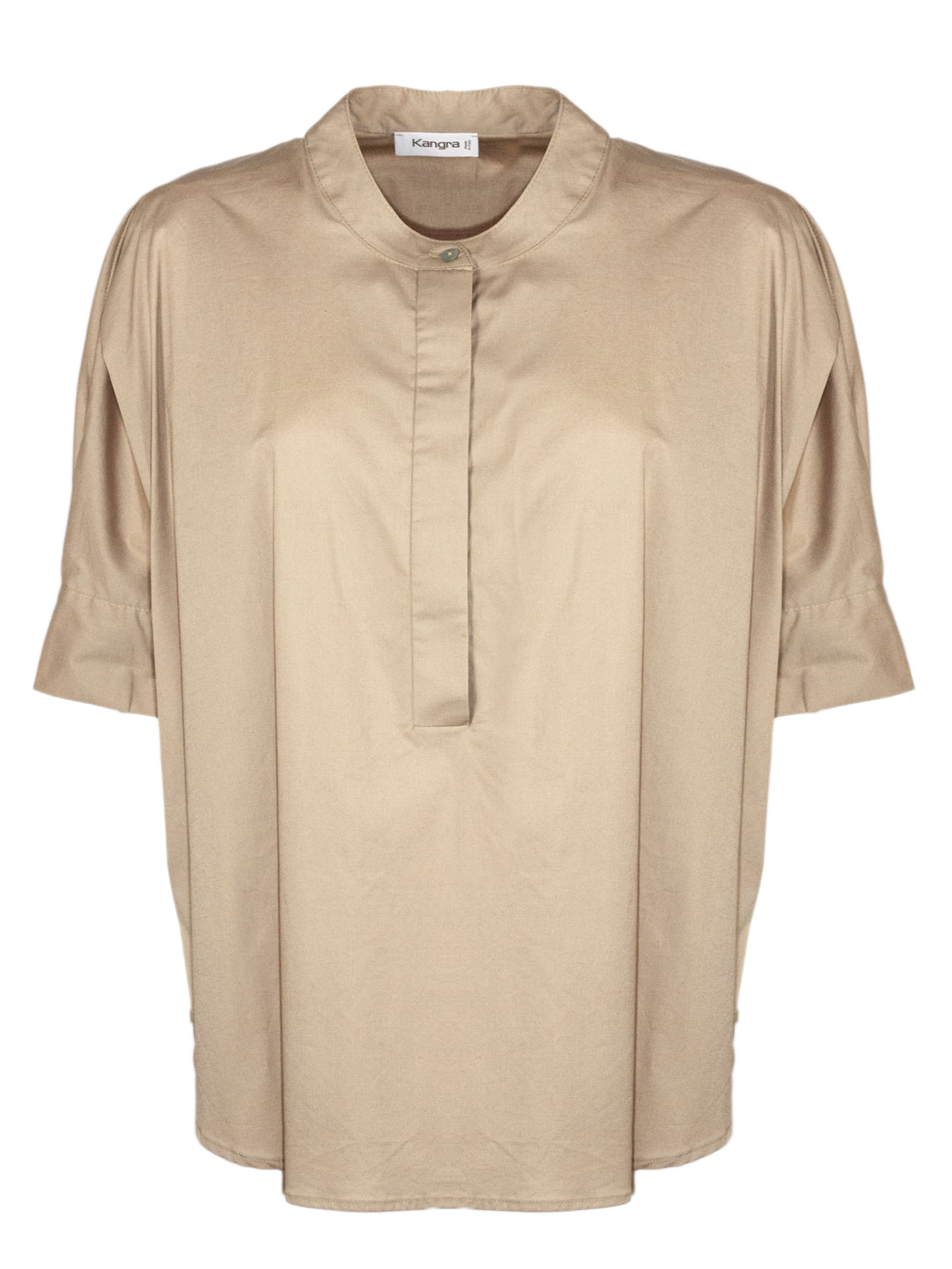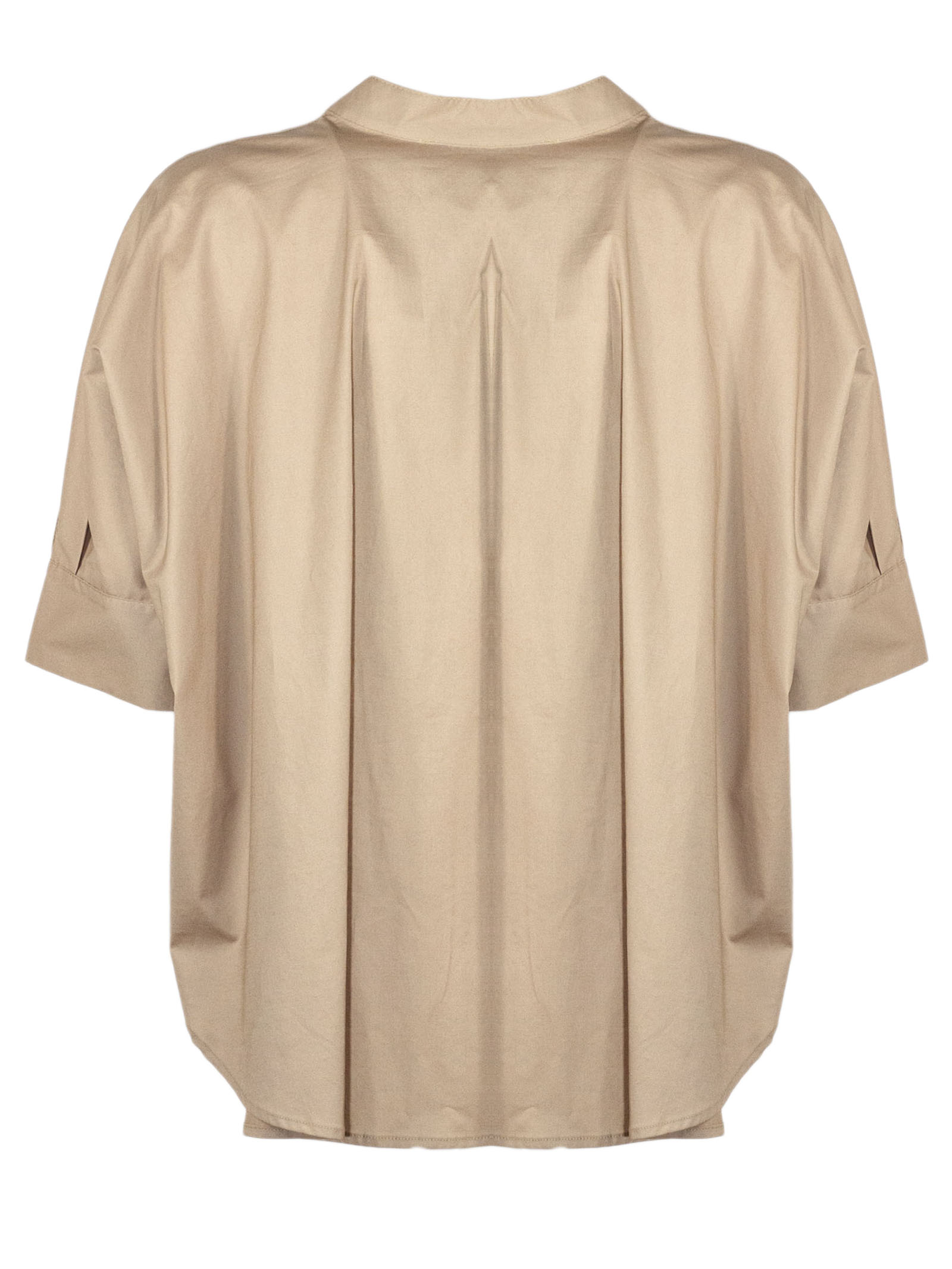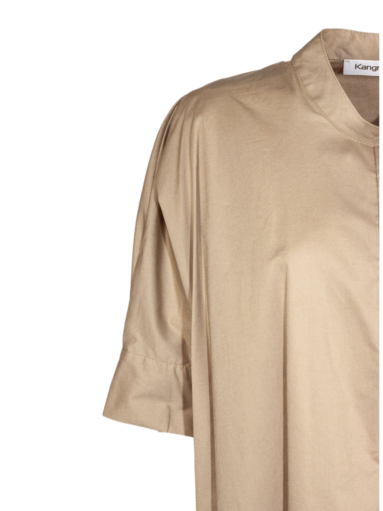 Camicia in cotone beige con girocollo, chiusura parziale con bottoni nascosti, maniche corte, vestibilità ampia e rilassata