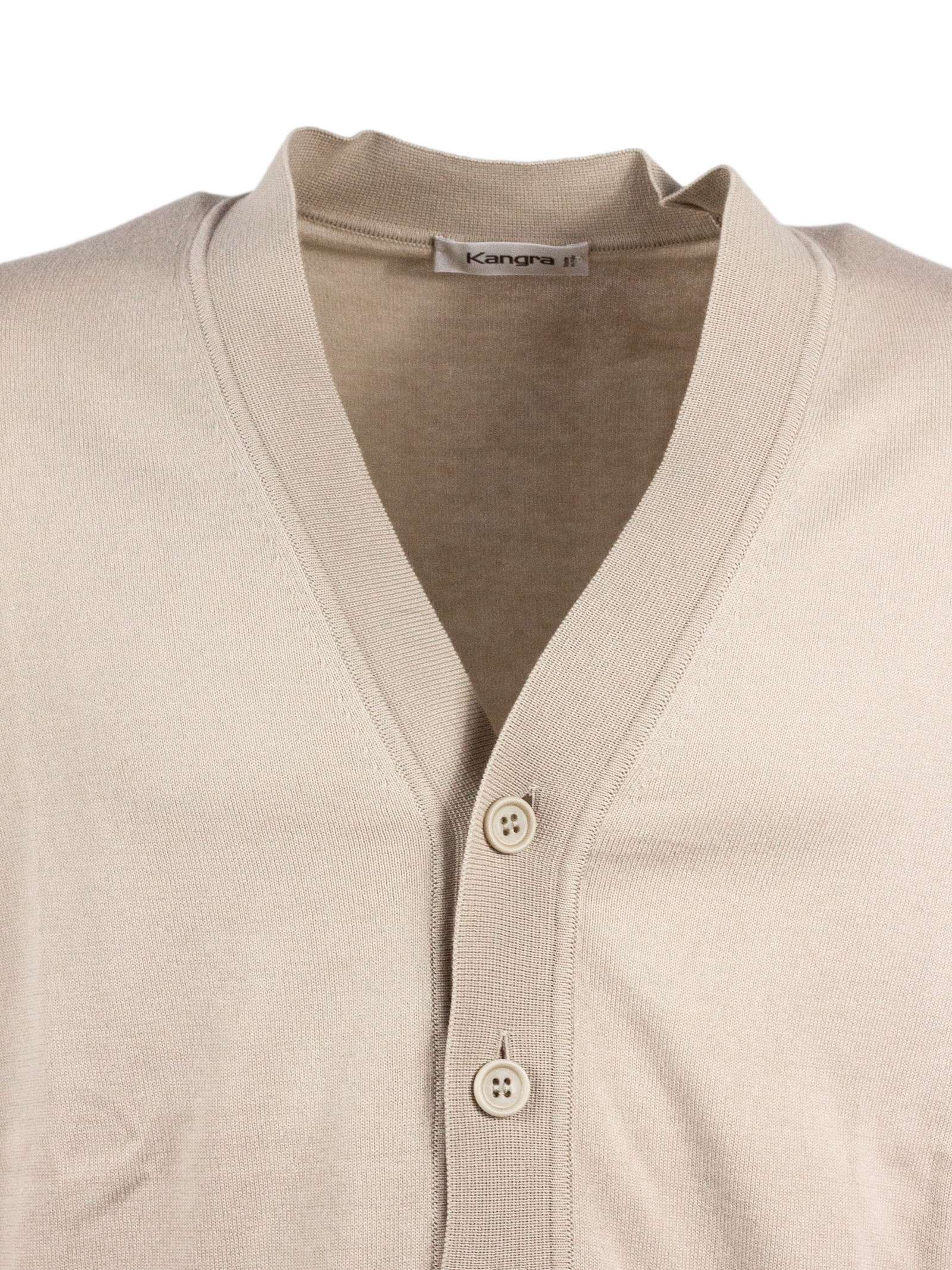 Cardigan in cotone beige con scollo a V, chiusura frontale bottoni, maniche lunghe, finiture a costine