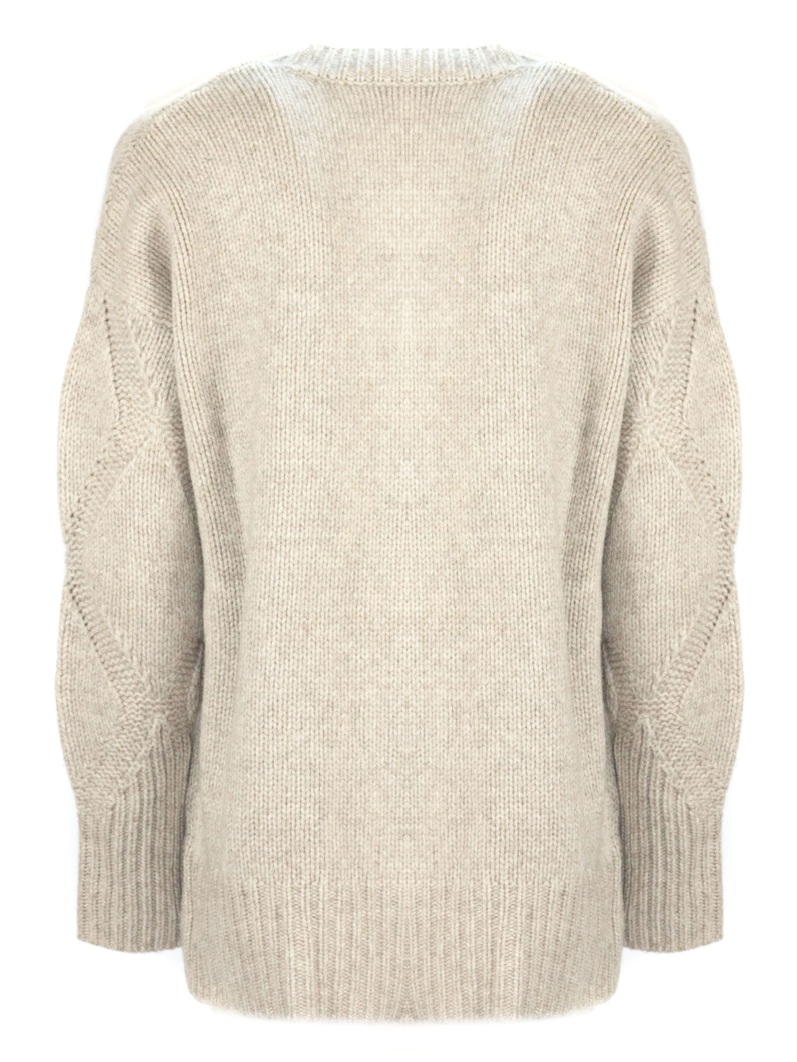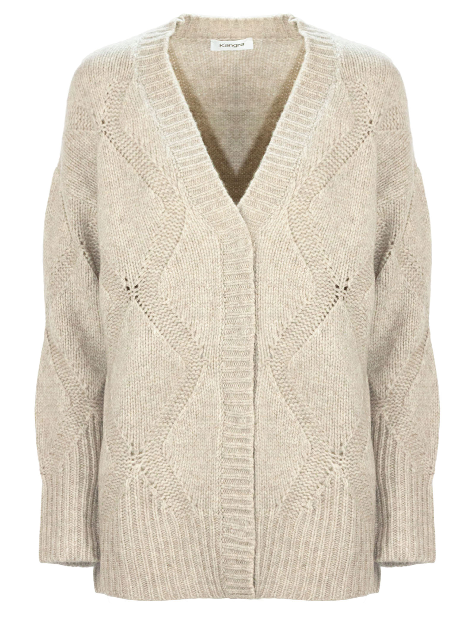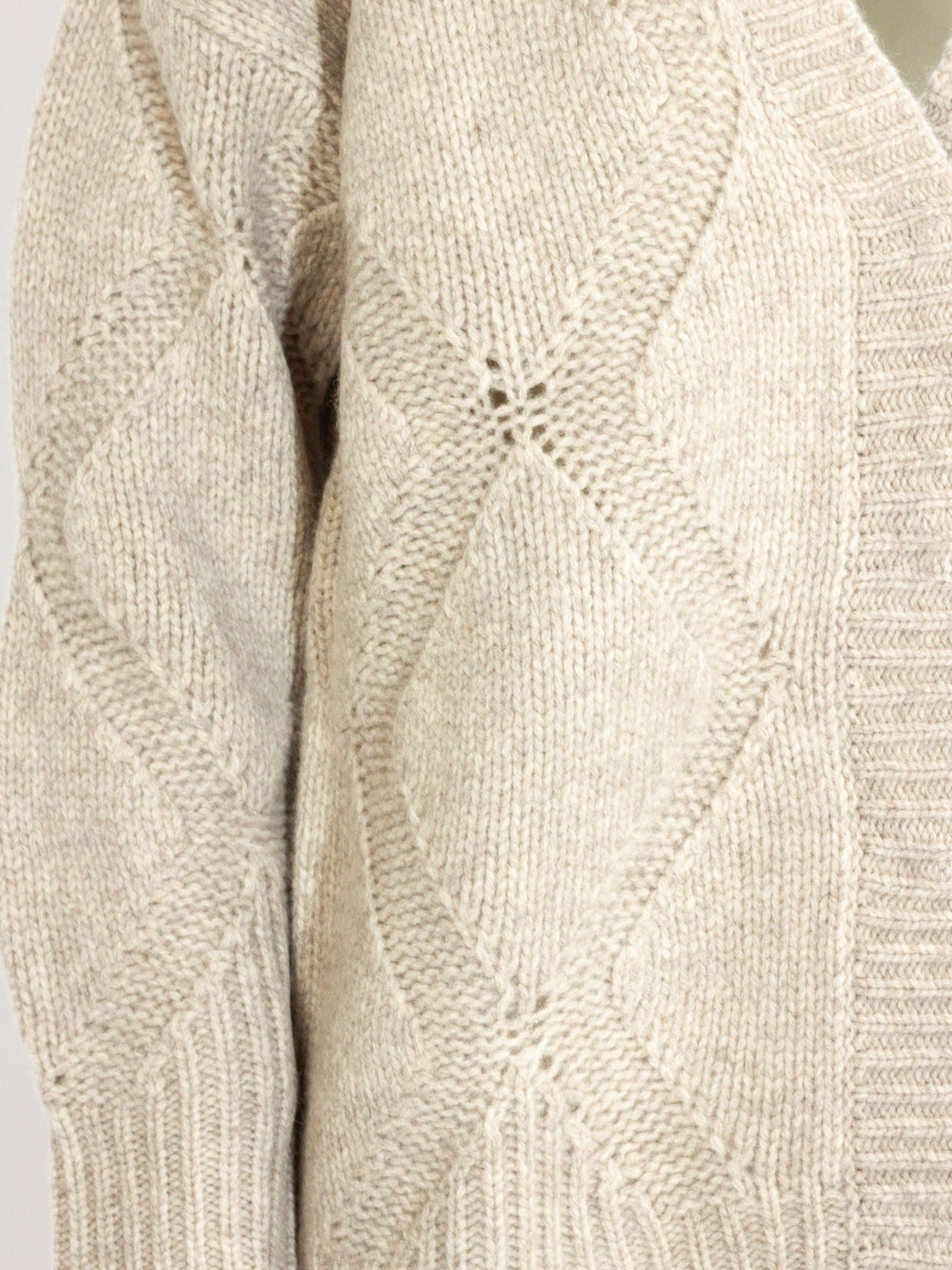 Cardigan in lana beige con losanghe, scollo a V, maniche lunghe, finiture a coste