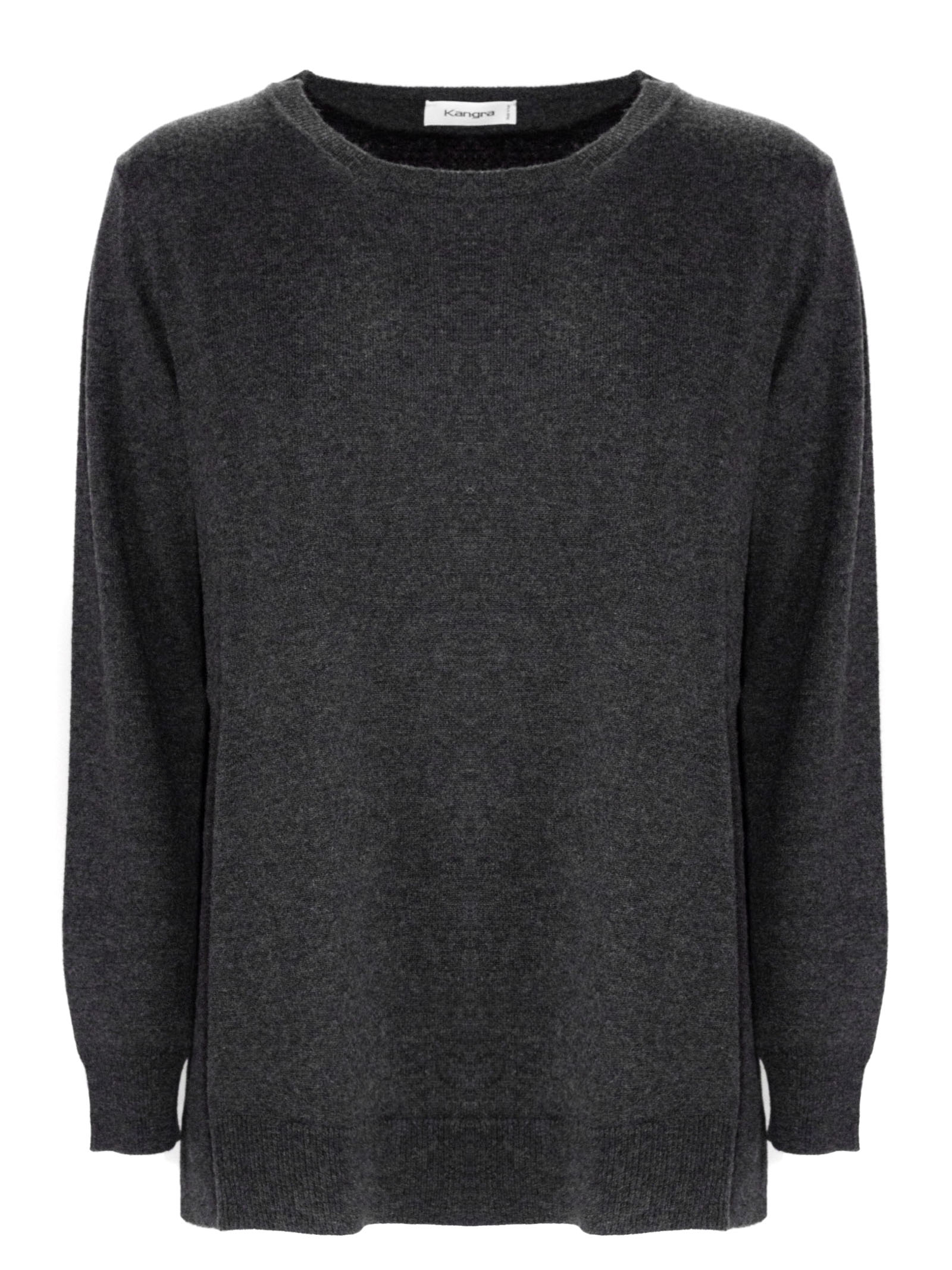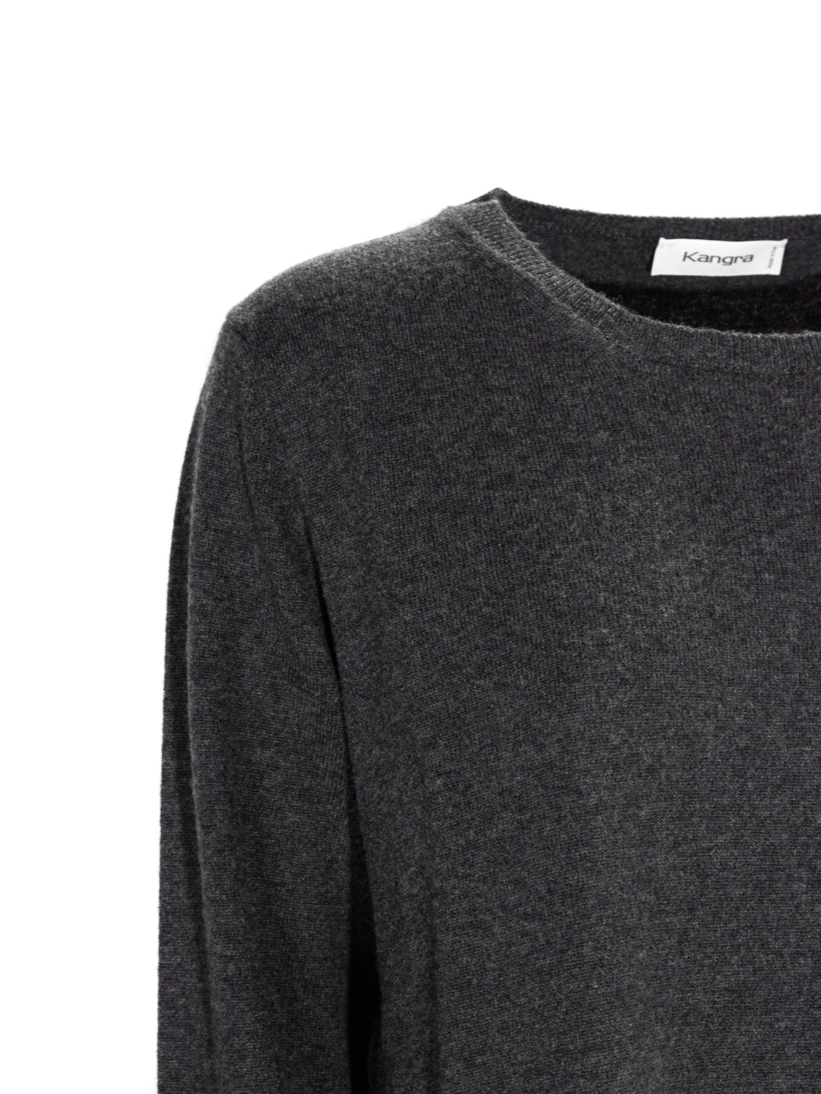 Maglia girocollo in misto lana e cashmere grigio con maniche lunghe, finiture a costine