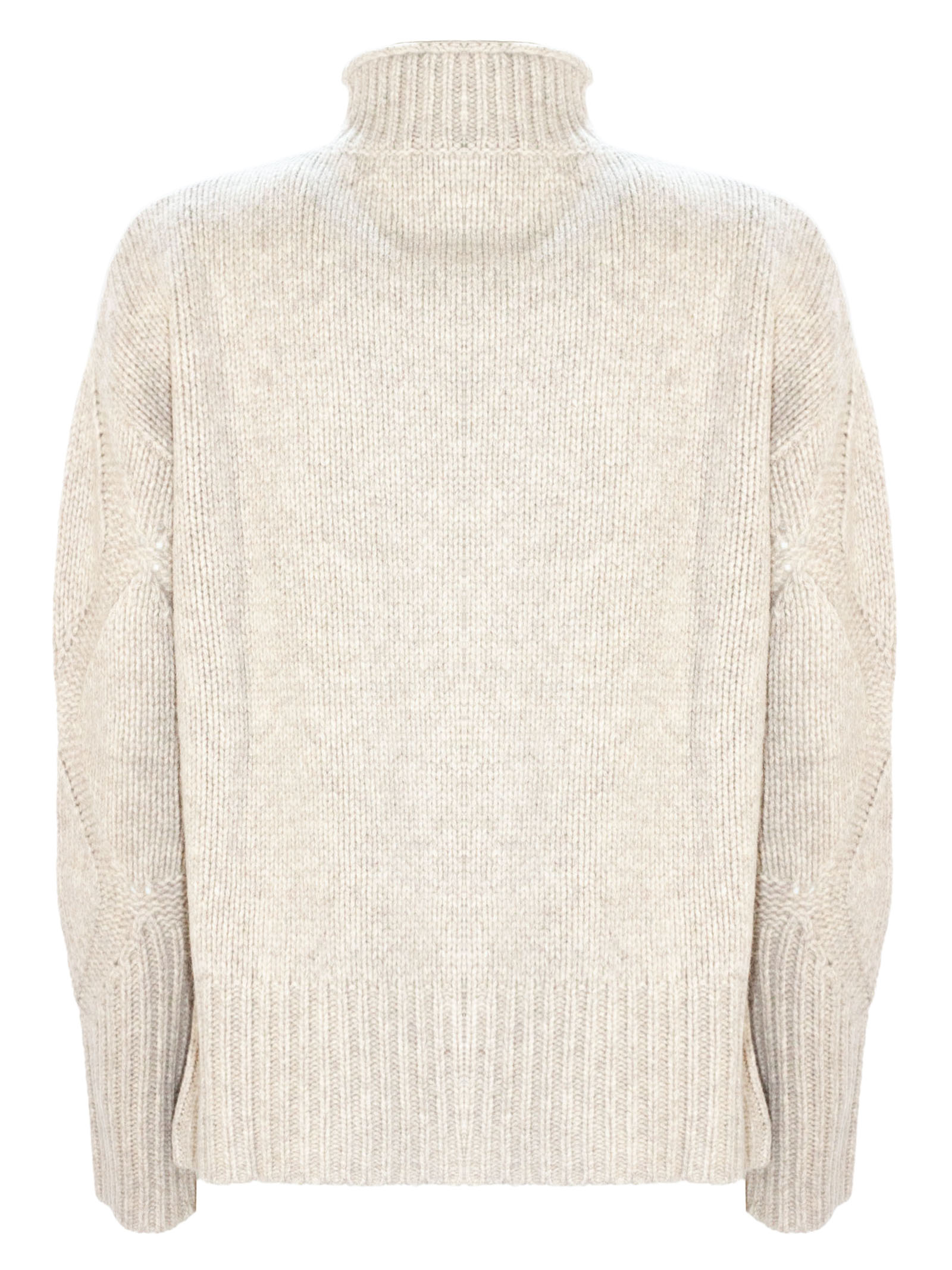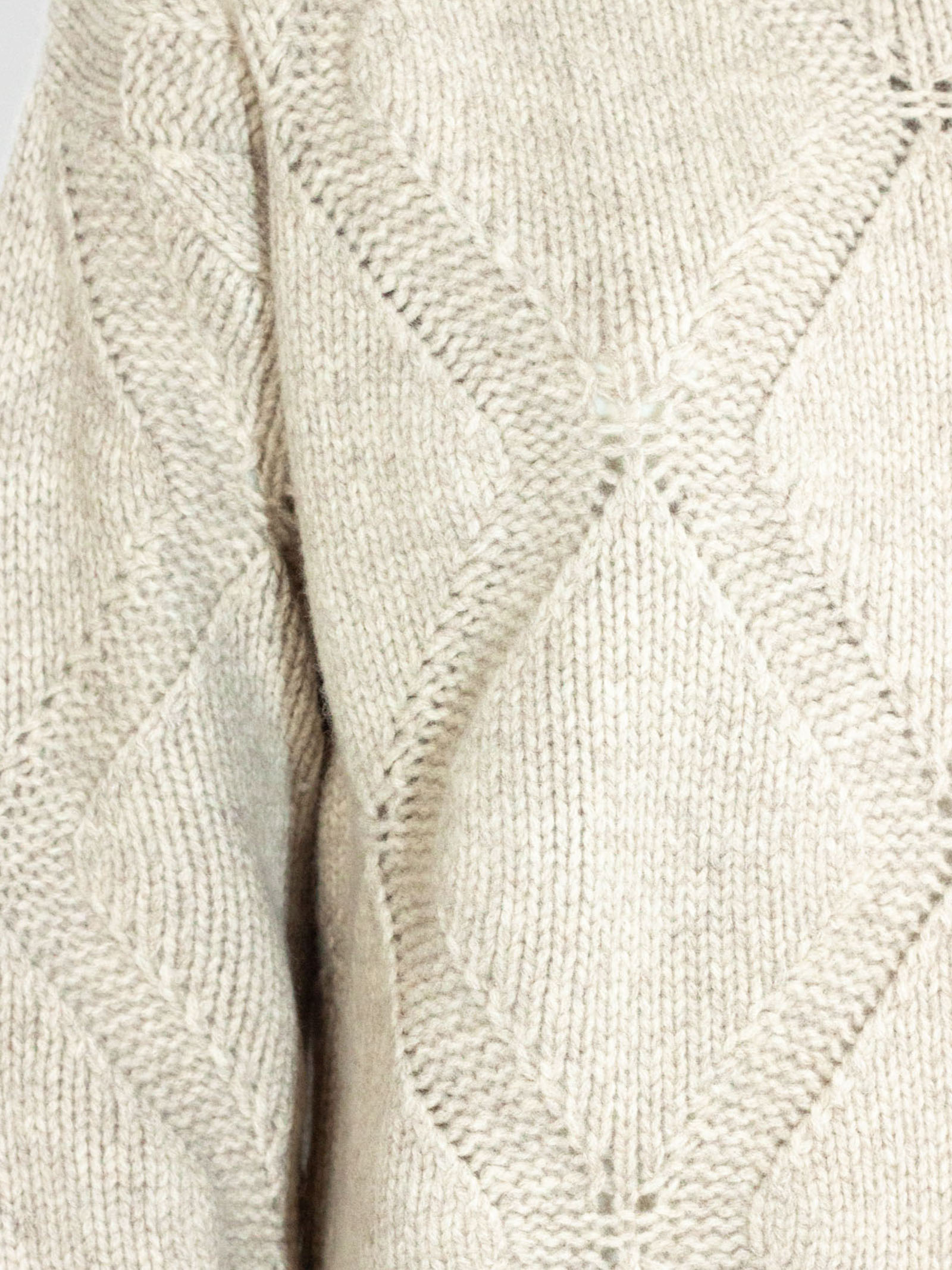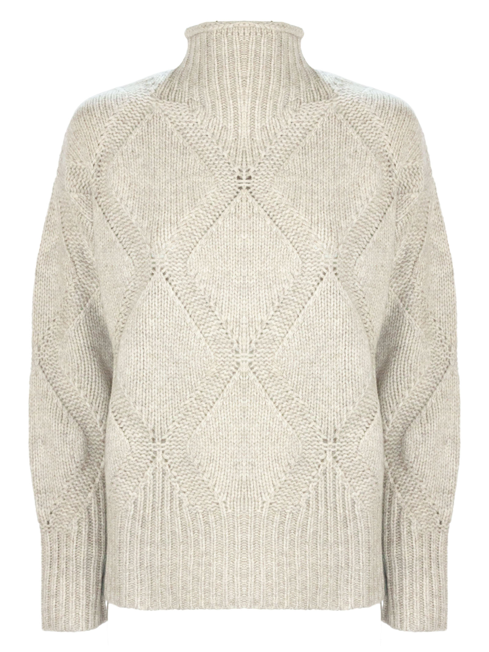 Maglia in lana beige con losanghe, collo alto, maniche lunghe, finiture a coste
