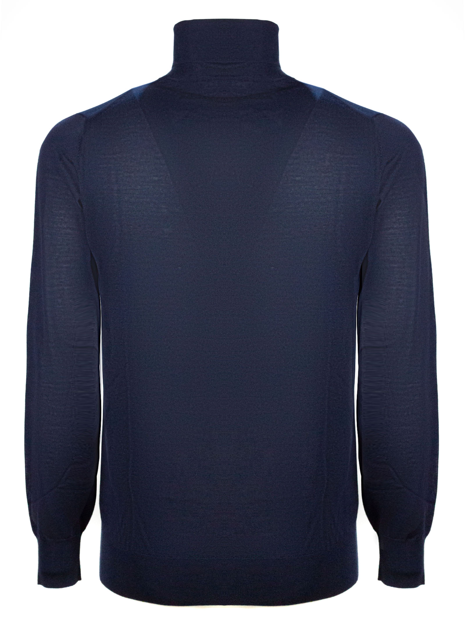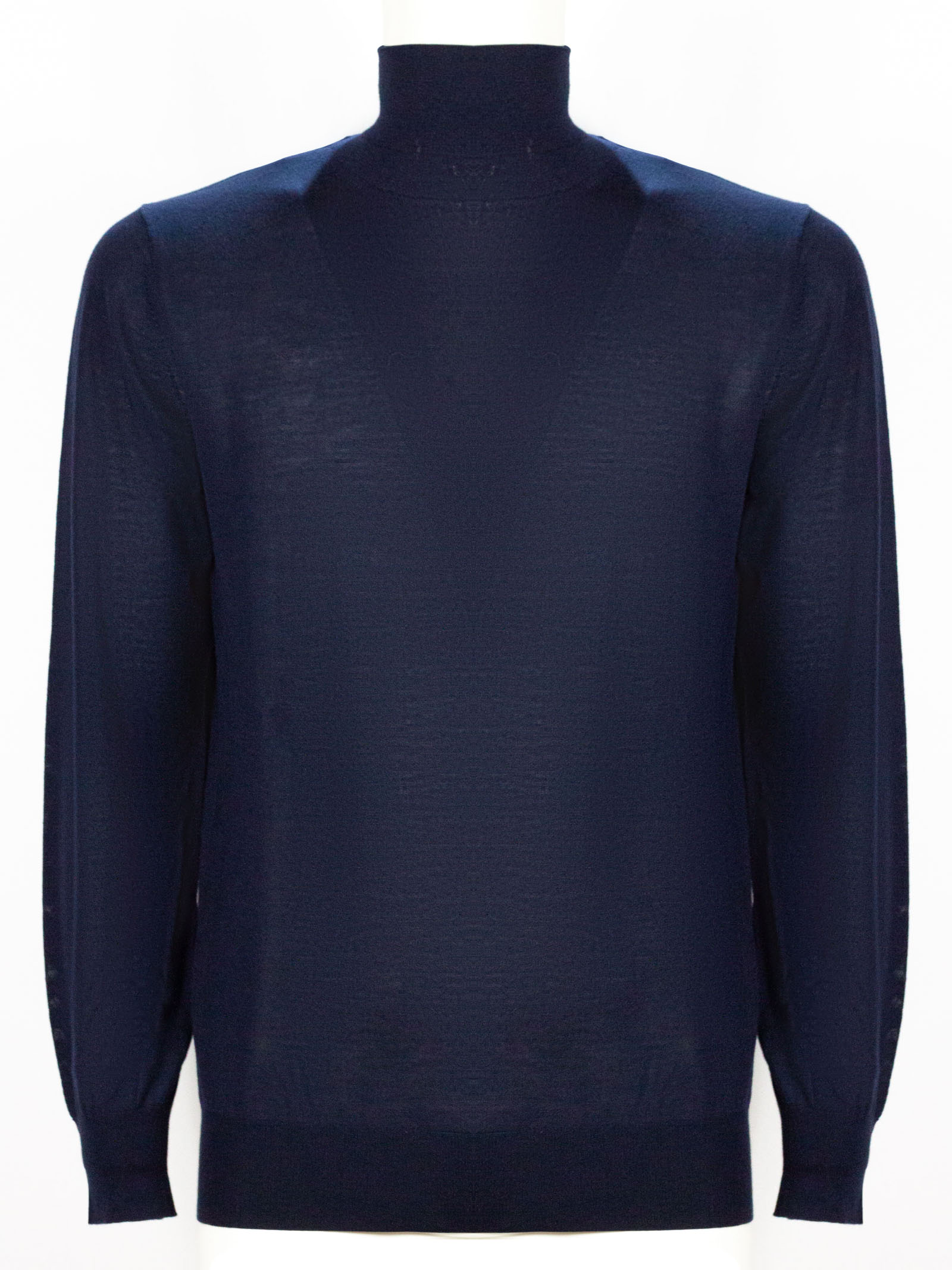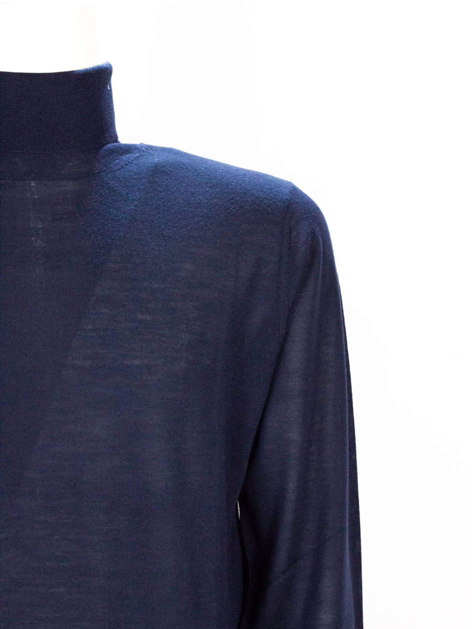 Maglia in lana blu con collo alto, maniche lunghe, finiture a costine