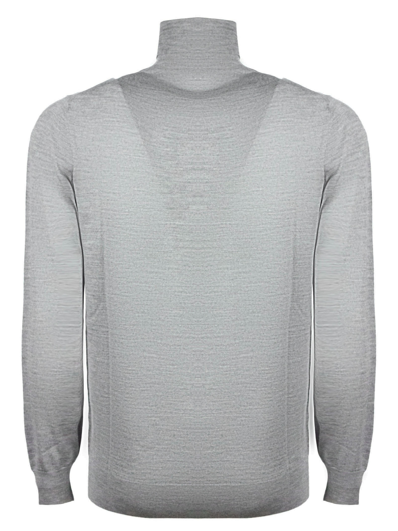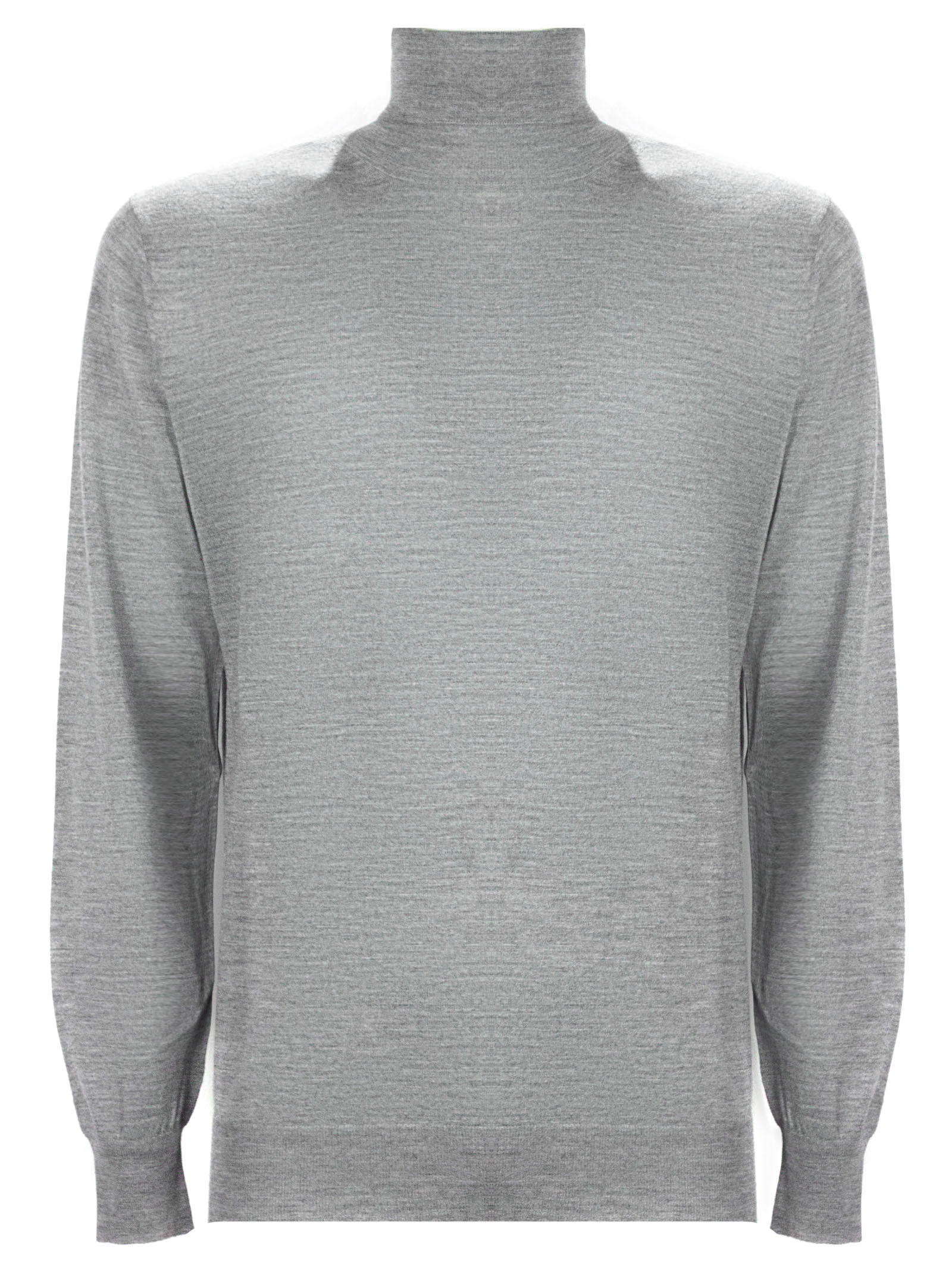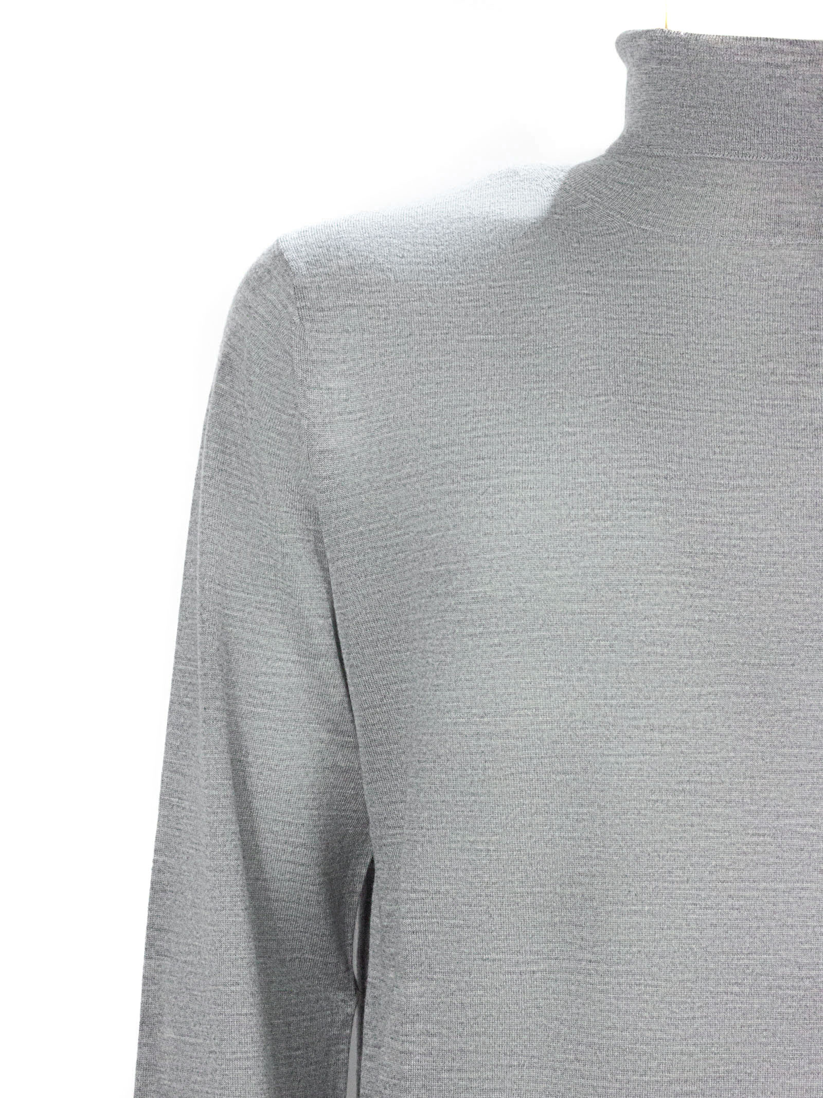 Maglia in lana grigia con collo alto, maniche lunghe, finiture a costine