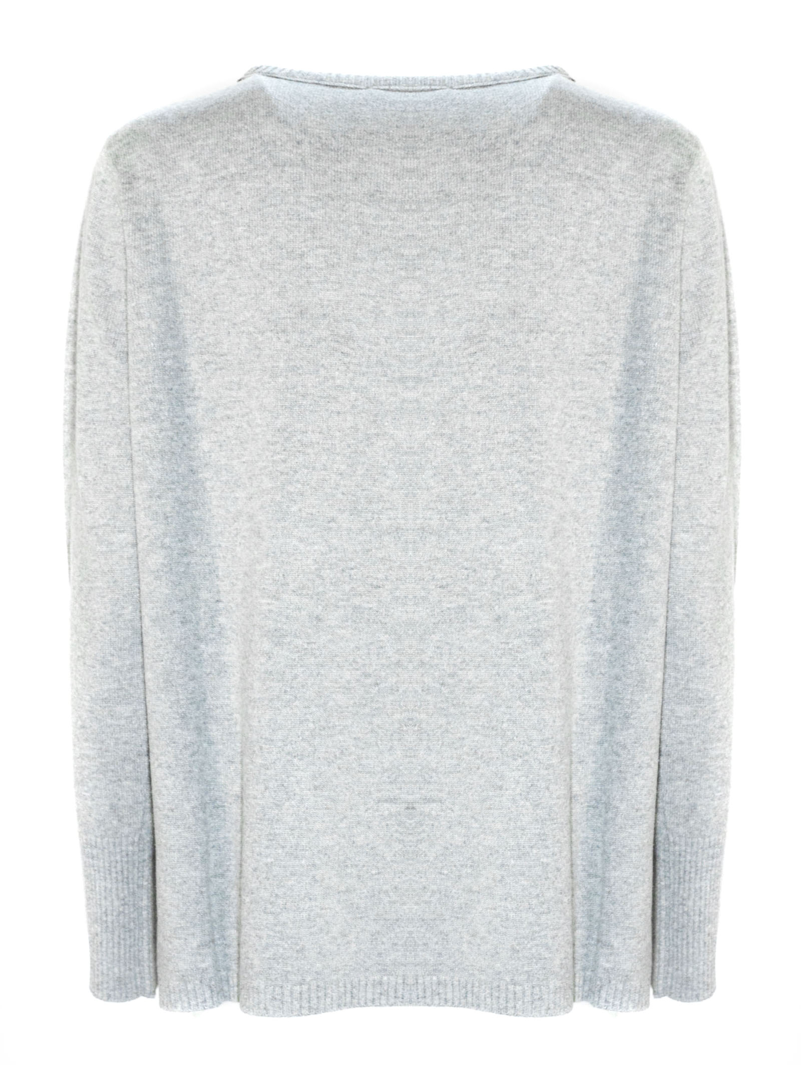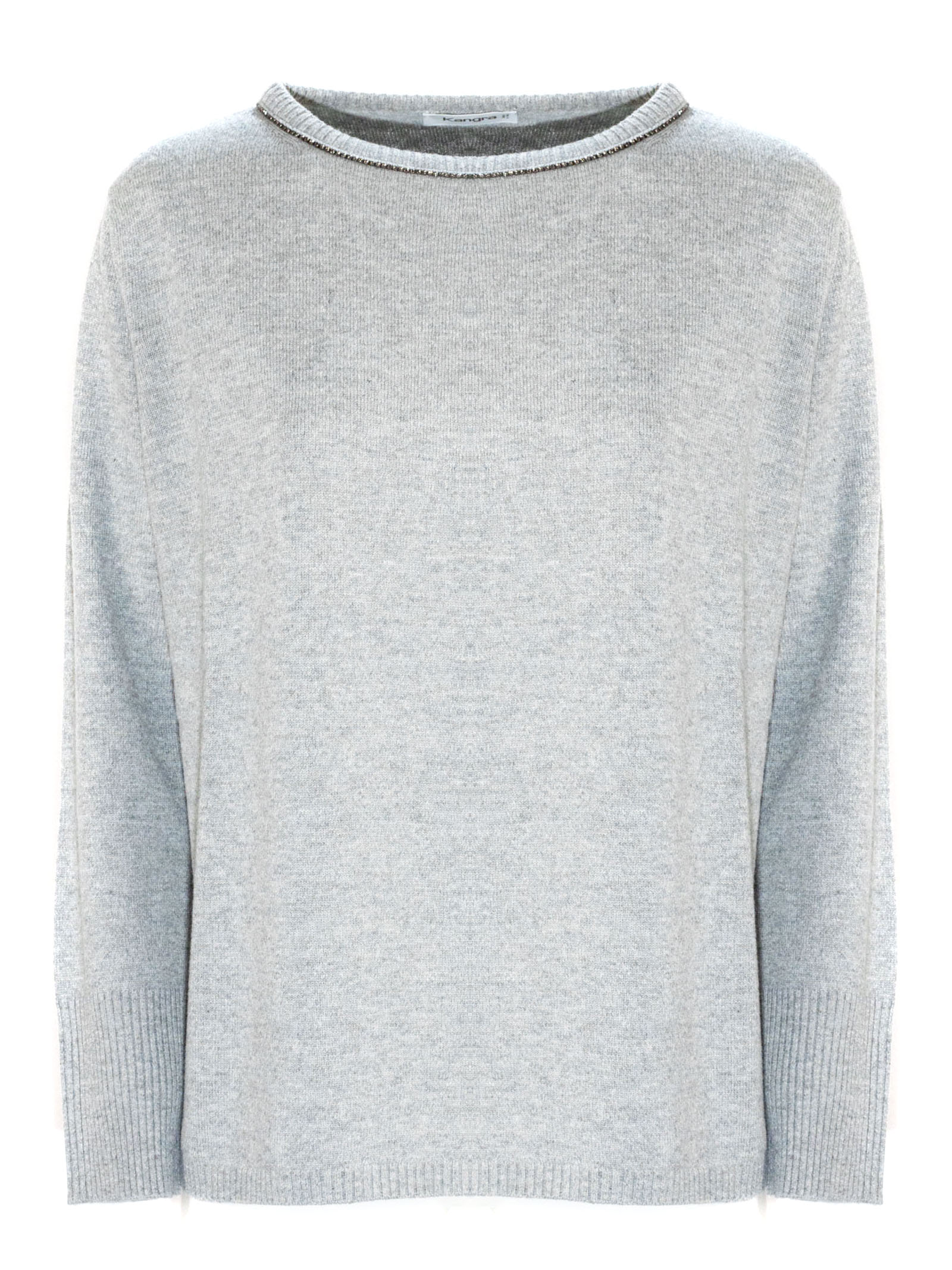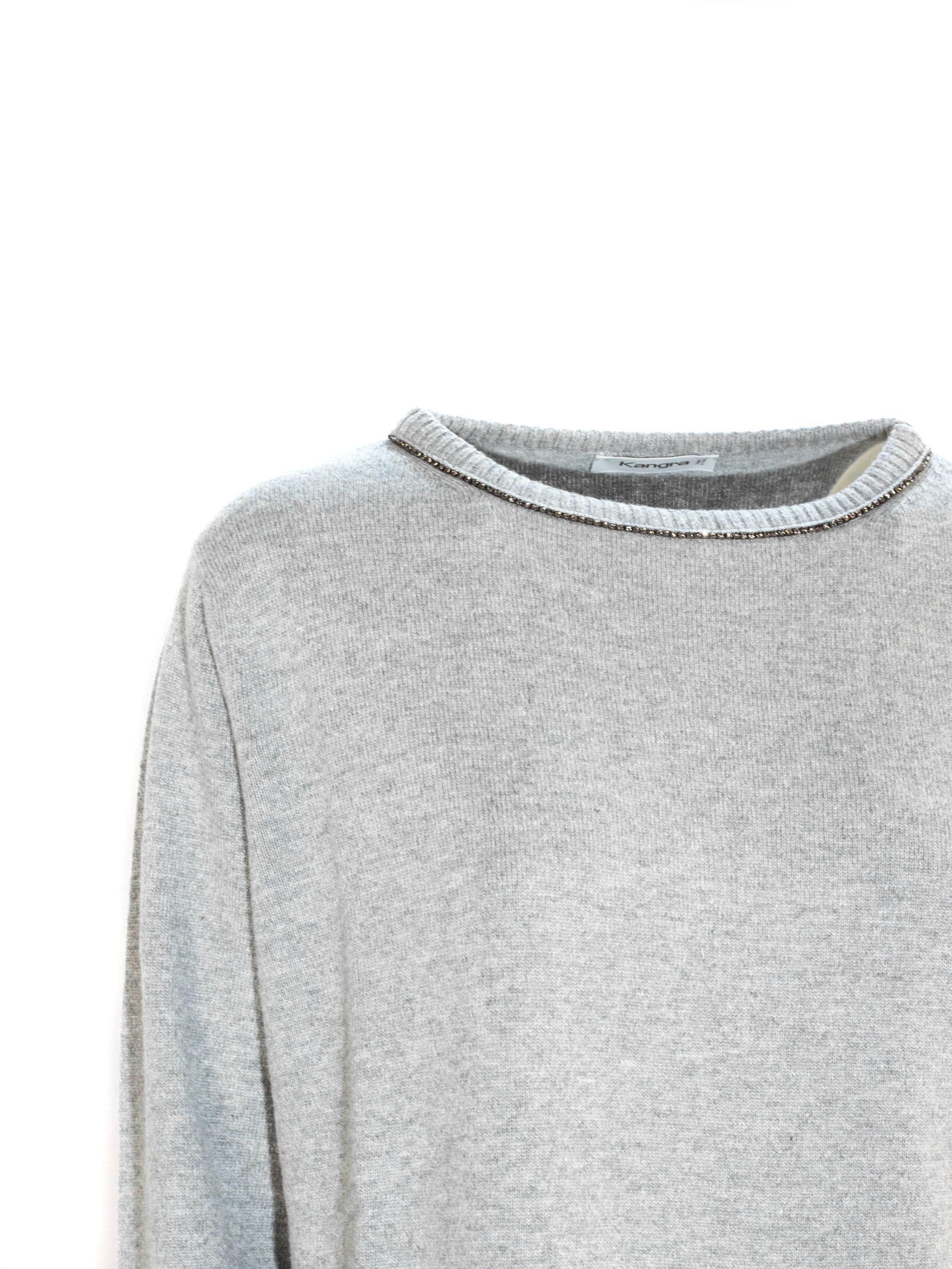 Maglia rasata finezza 12, con spacchi, caratterizzata da una linea essenziale. Lo scollo a barchetta è impreziosito da una raffinata passamaneria con castoni: dettaglio luminoso che dona al capo un tocco ricercato e femminile, ideale per valorizzare anche gli outfit più minimal