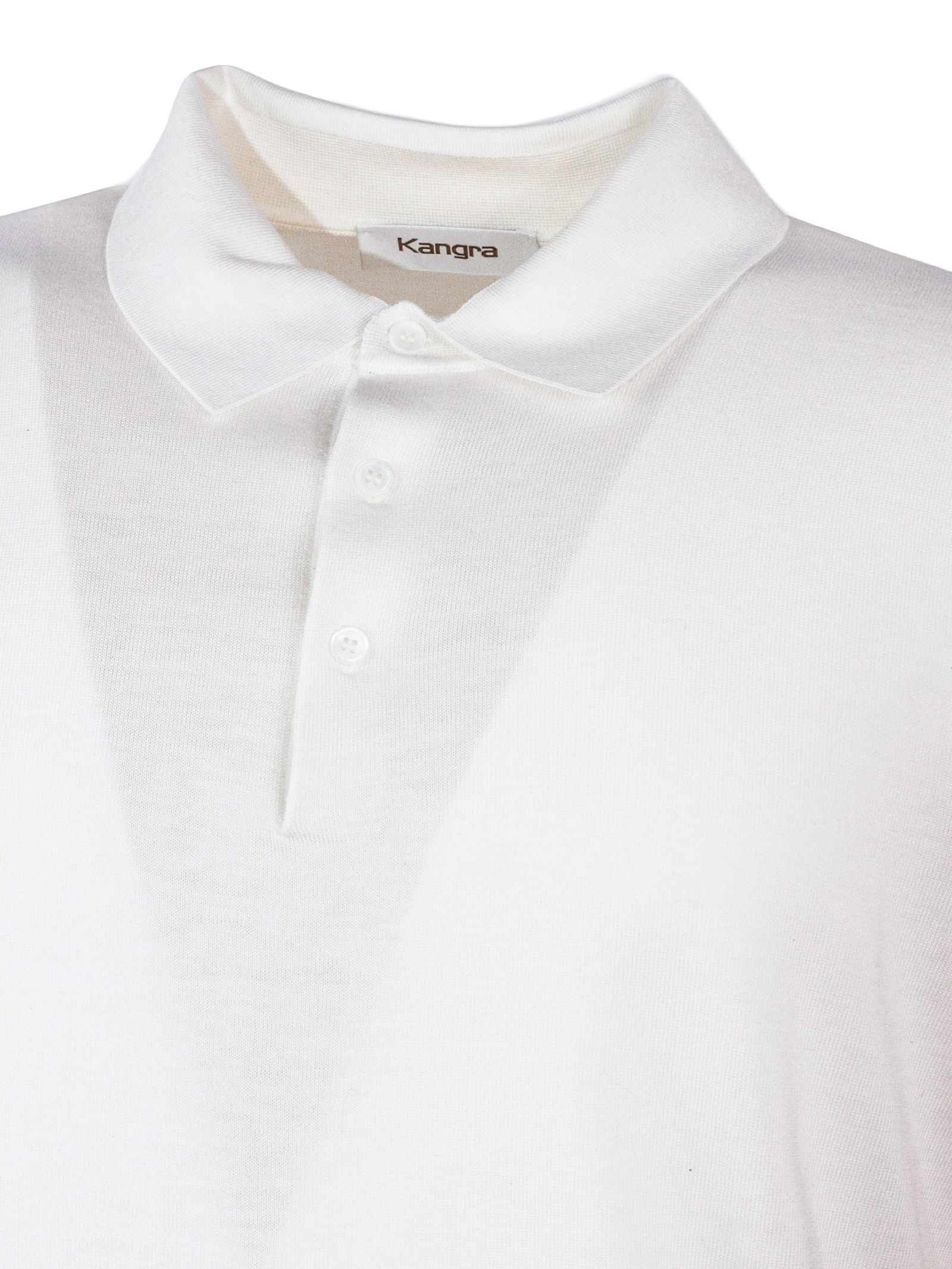 Polo in misto seta e cotone bianco neutro con maniche lunghe, colletto classico con chiusura bottoni, finiture a costine