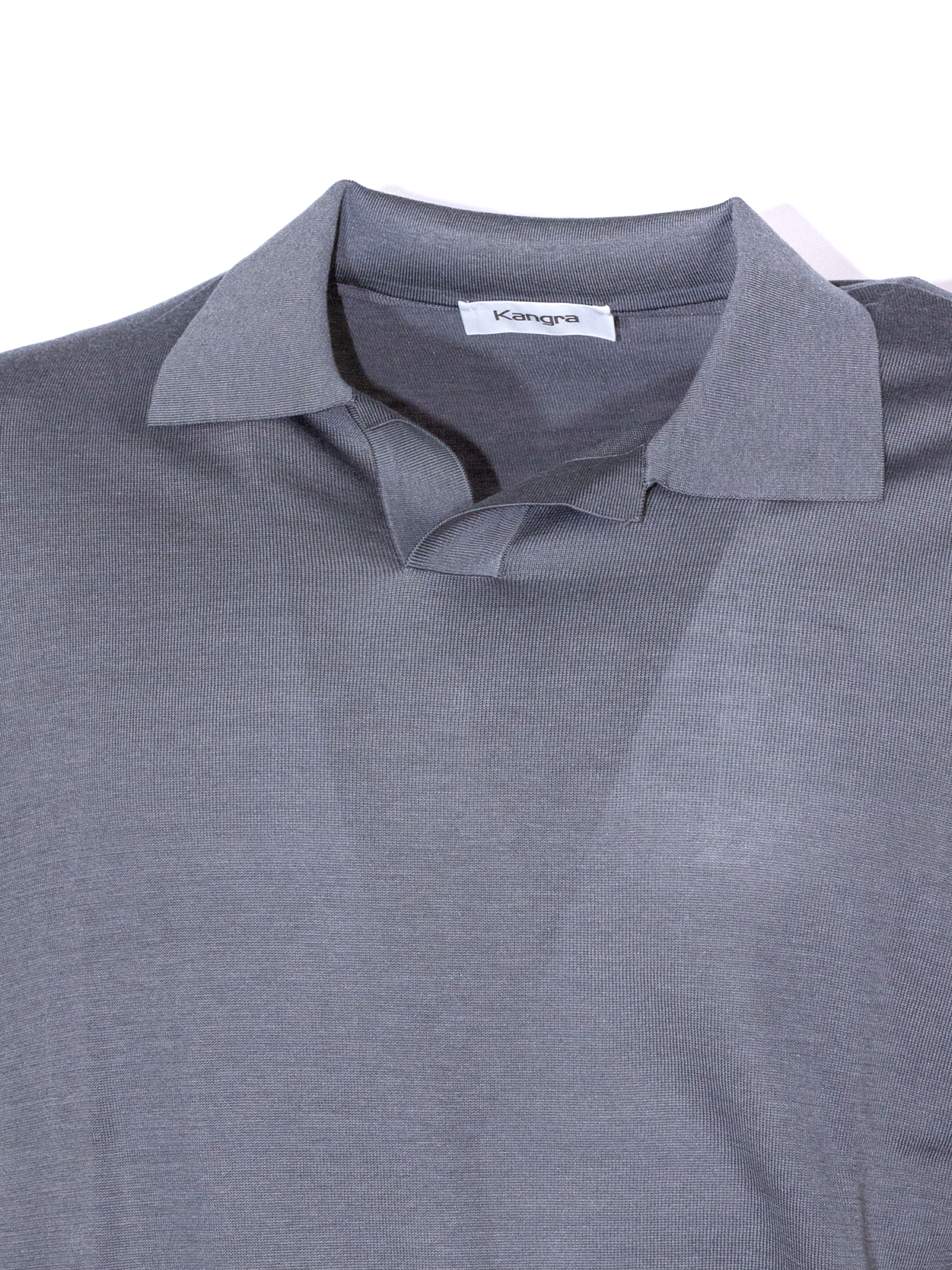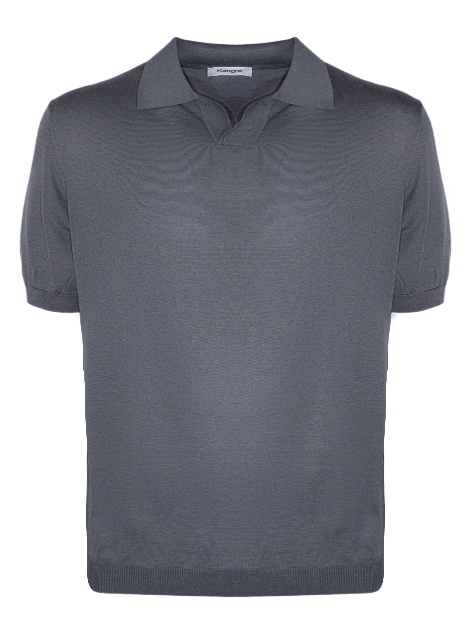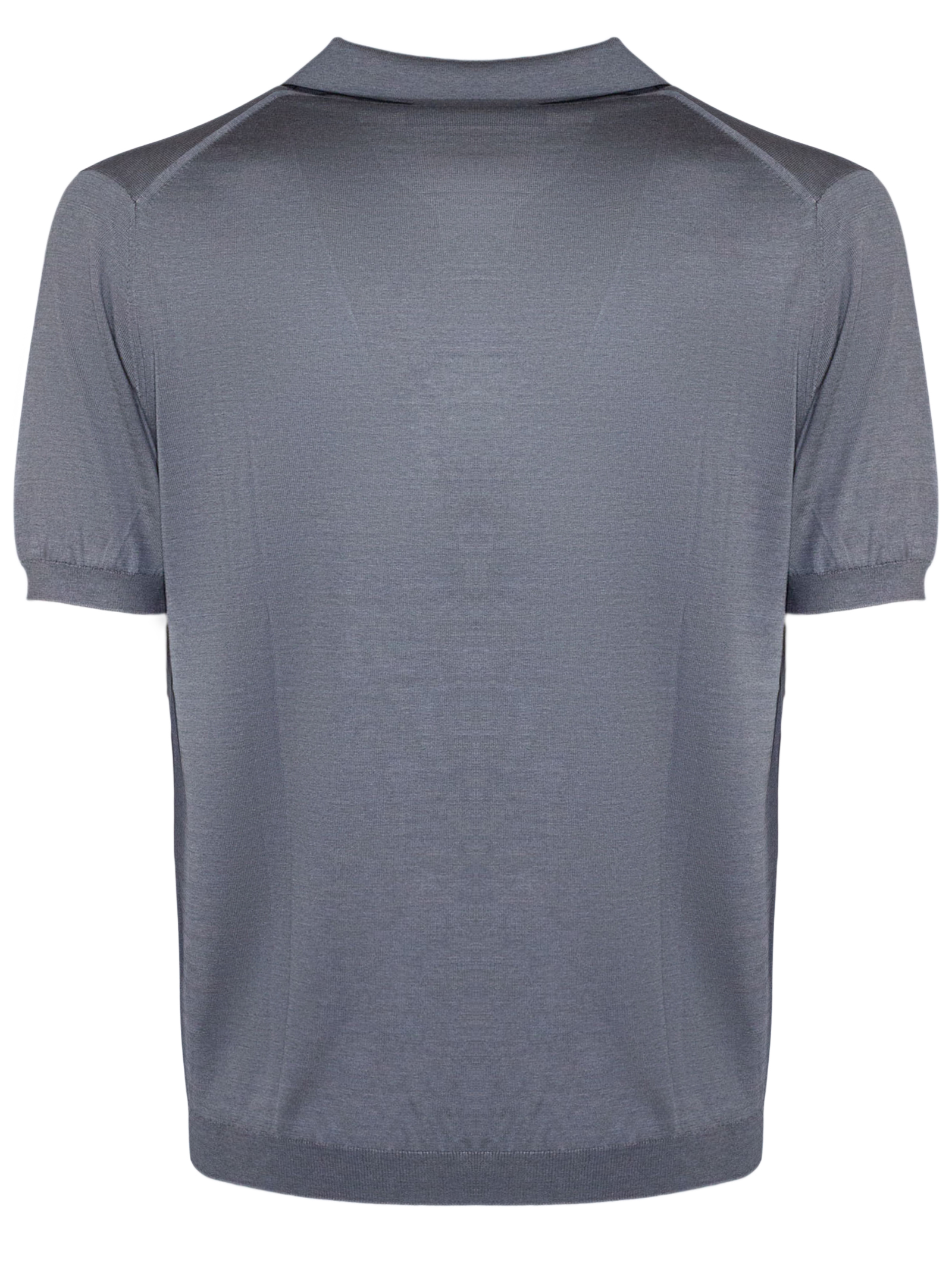 Polo in misto seta e cotone grigio con colletto senza bottoni, maniche corte, finiture a costine