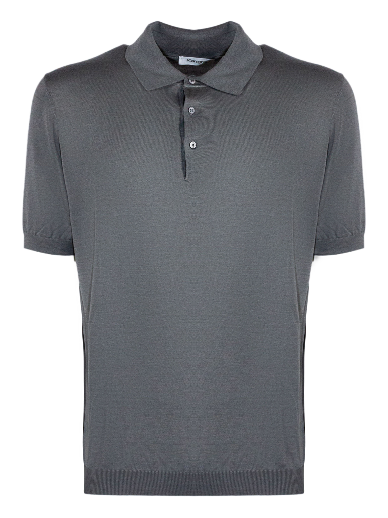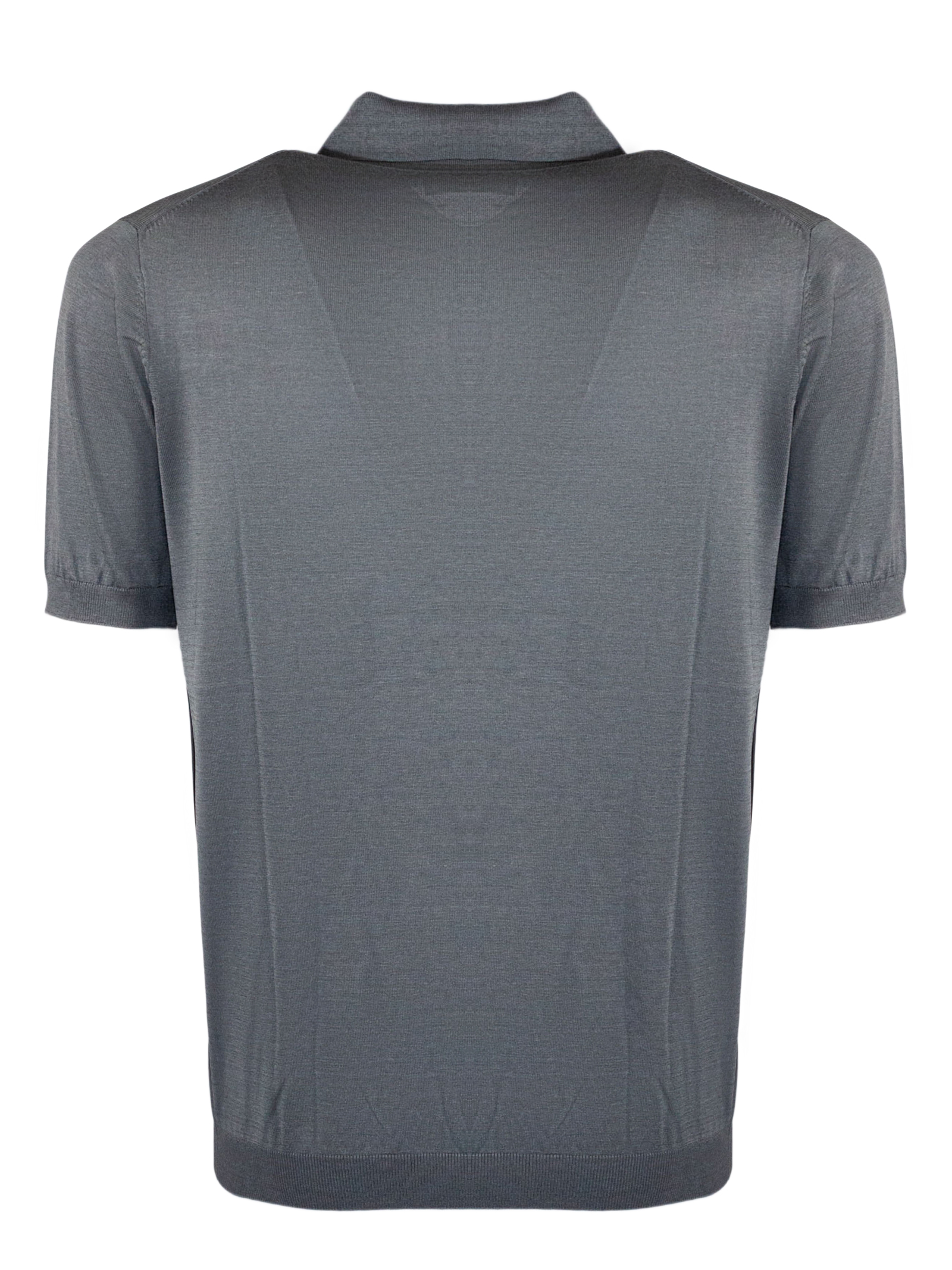 Polo in misto seta e cotone grigio scuro con maniche corte, colletto classico con chiusura bottoni, finiture a costine