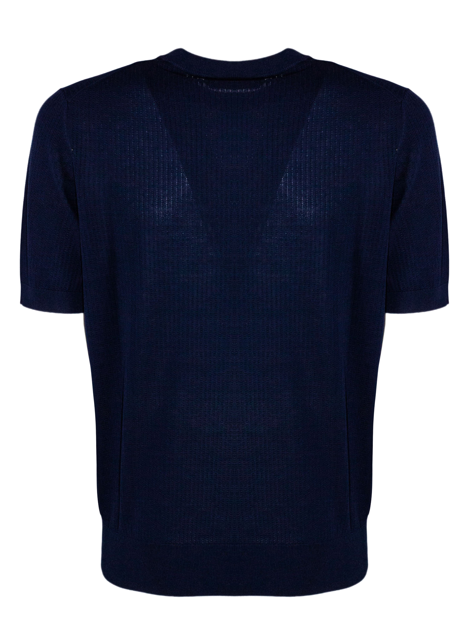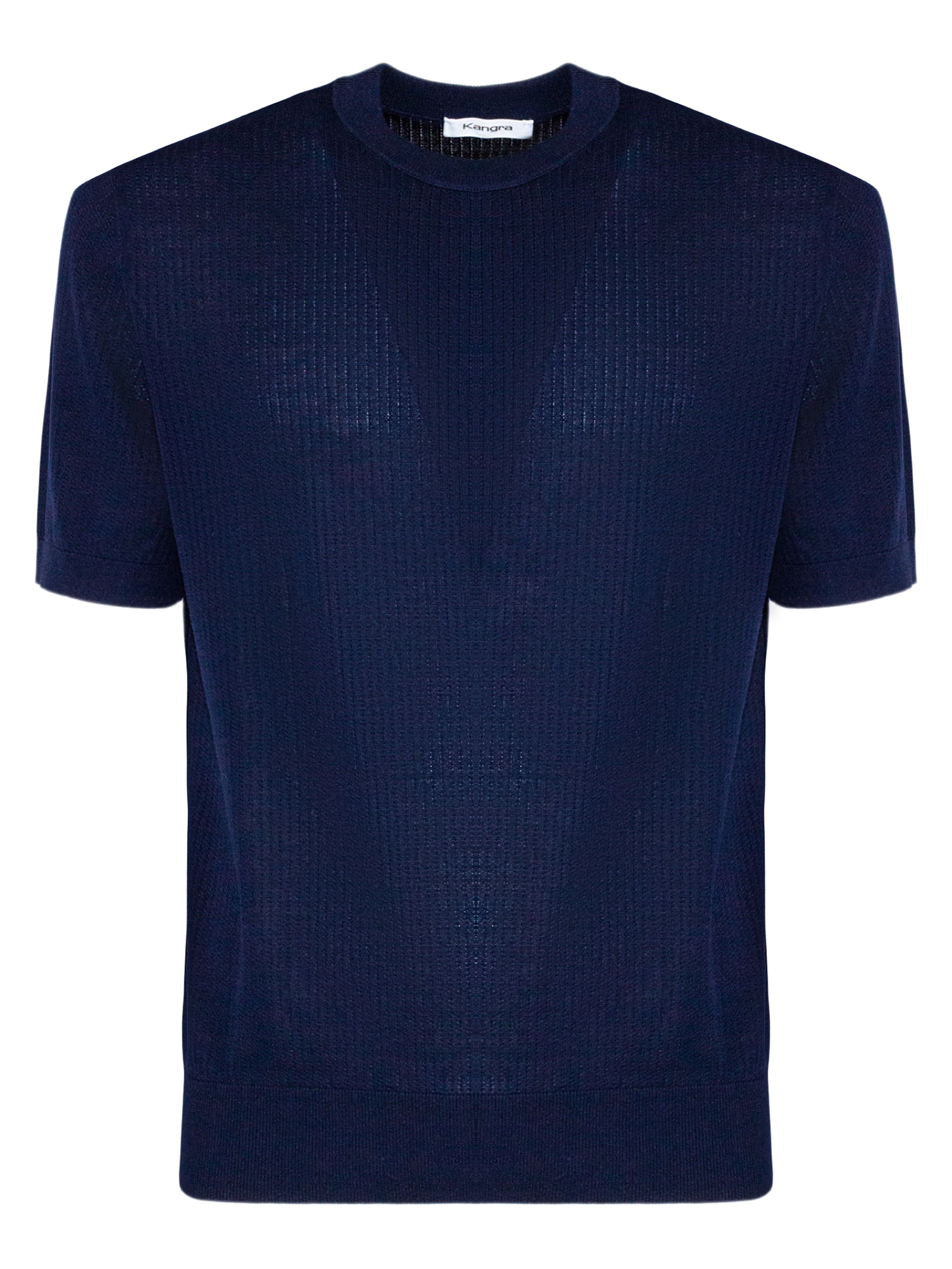 T-shirt in maglia di cotone blu con design a righe, girocollo, maniche corte, finiture a costine