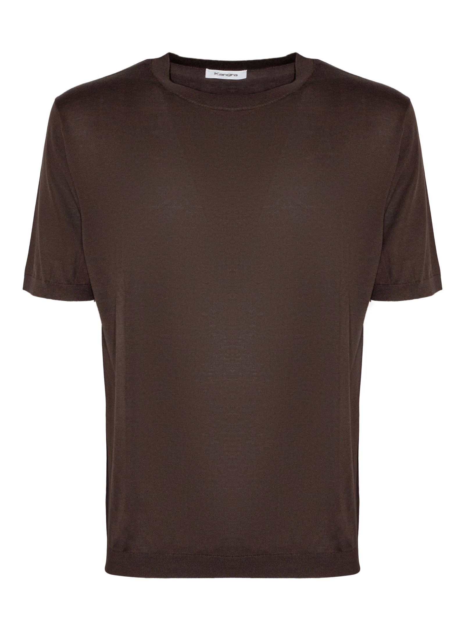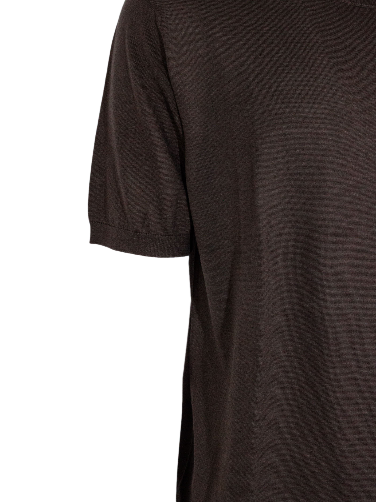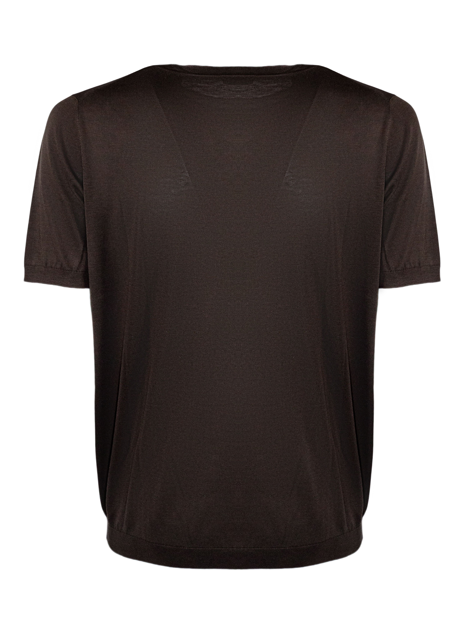 T-shirt in maglia misto seta e cotone marrone con girocollo, maniche corte, finiture a costine