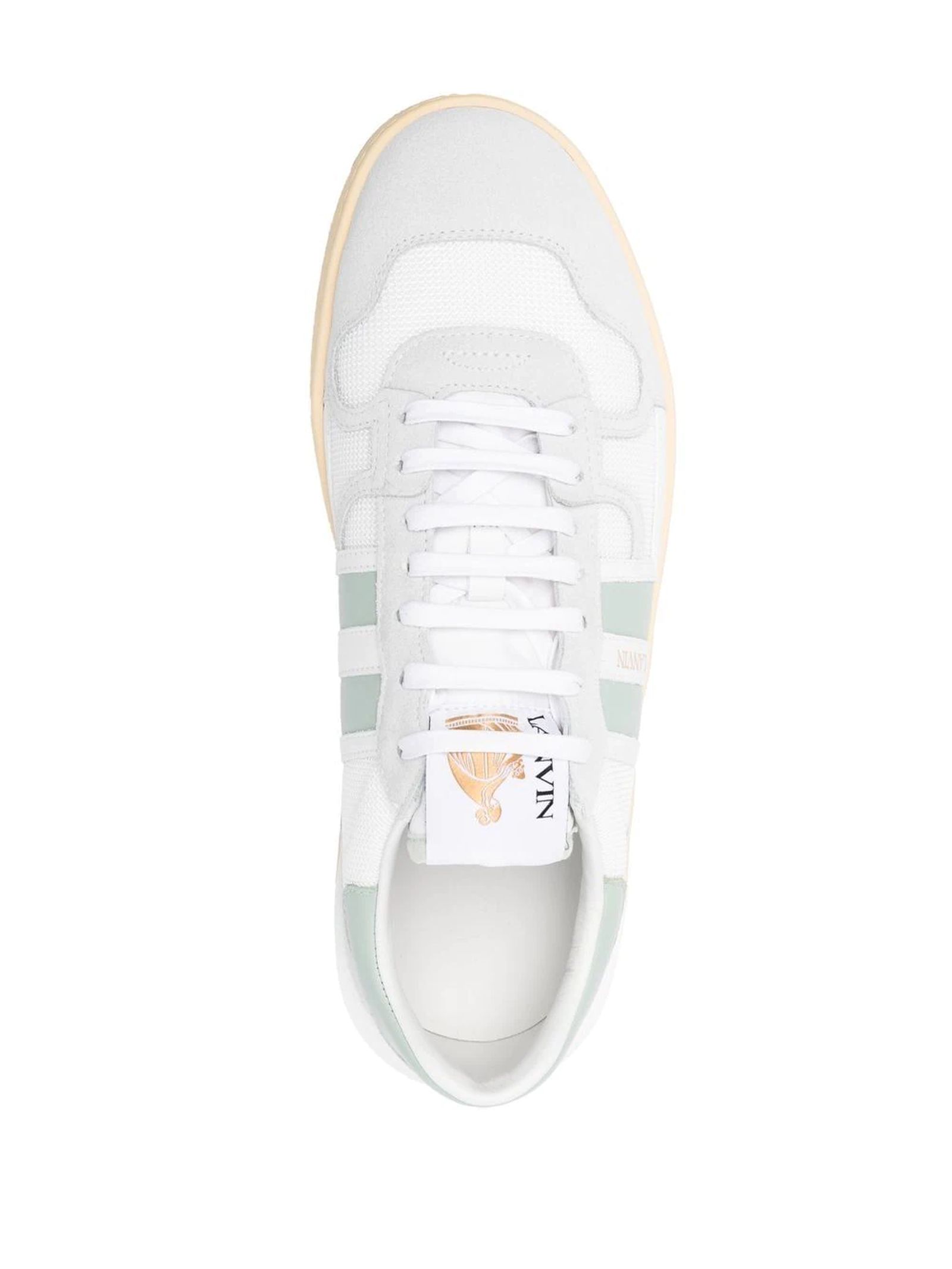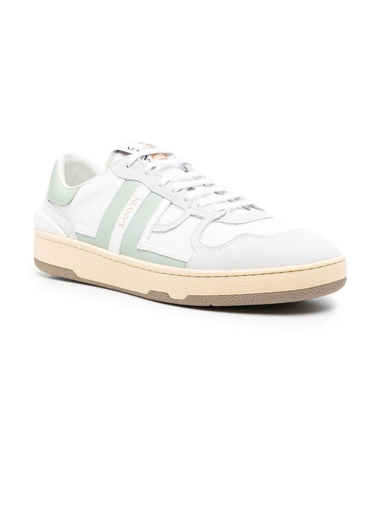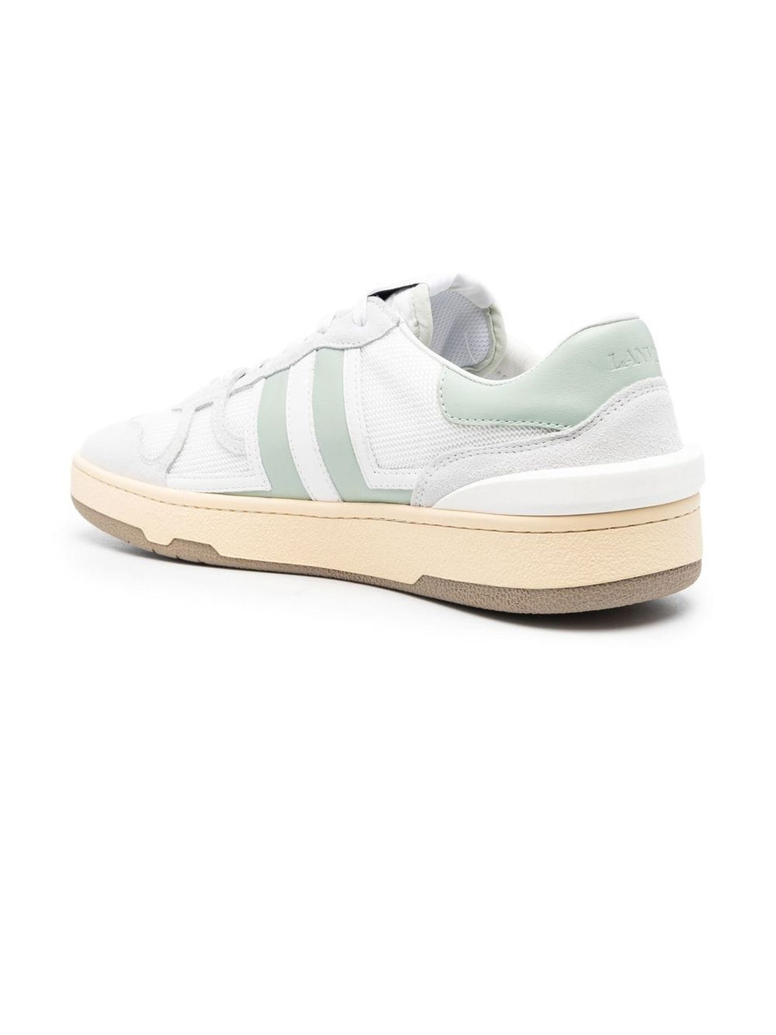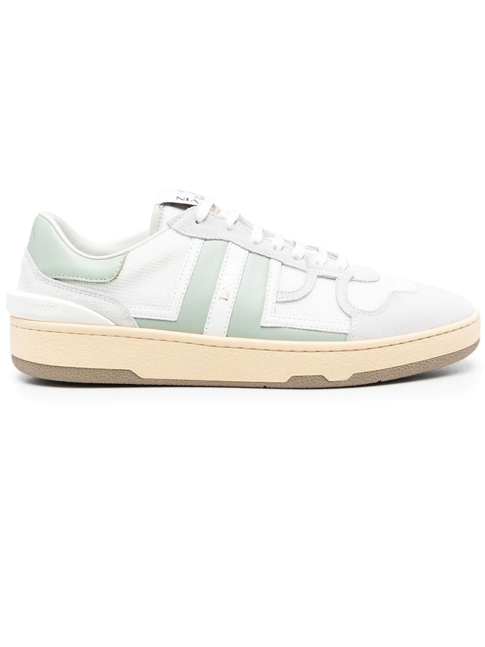 Sneakers Clay bianca, punta tonda, chiusura frontale con lacci, applicazione con logo sulla linguetta, rinforzo nel tallone a contrasto, pannelli in rete e suola piatta in gomma.