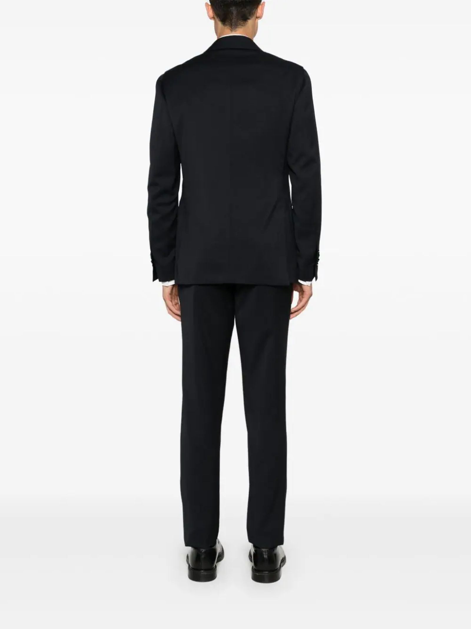 Completo due pezzi in lana vergine blu navy, tessuto in twill, dettagli con pince, dettaglio con spilla, revers classici, chiusura frontale con abbottonatura, maniche lunghe, orli con abbottonatura, tasca a filetto sul petto, tasca frontale con patta, doppio spacco posteriore, fodera parziale, orlo curvo, piega stirata, vita media, chiusura a bottoni frontale nascosta, passanti, due tasche laterali oblique, due tasche a filetto posteriori con bottone, gamba affusolata