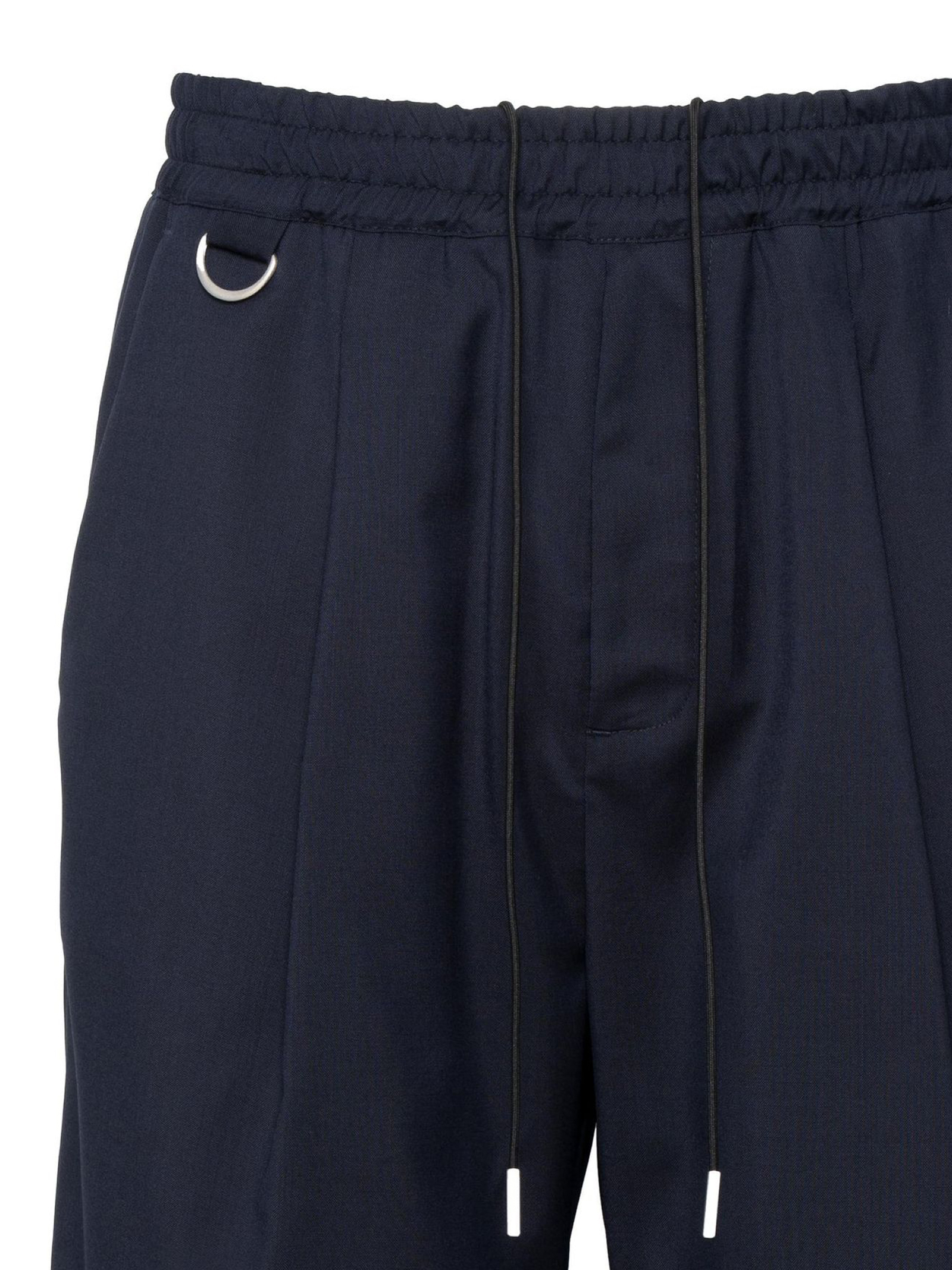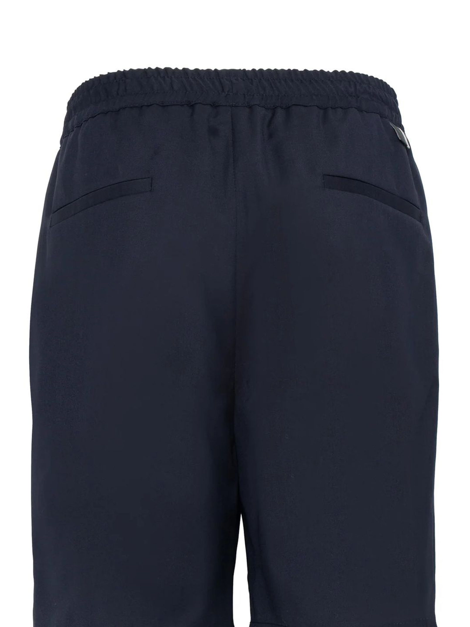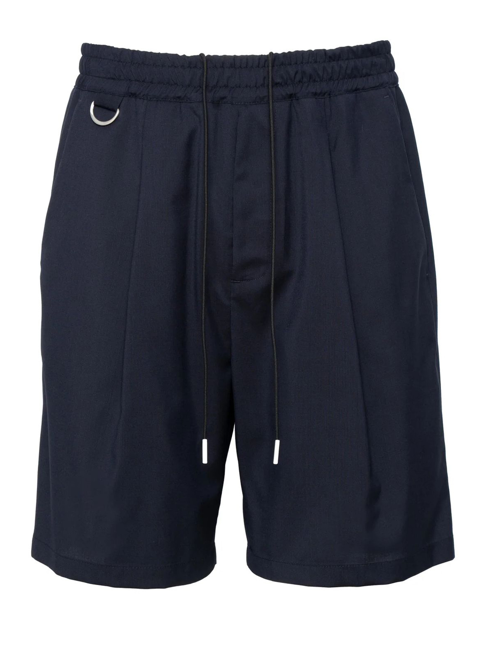 Bermuda blu navy in lana vergine con banda elasticizzata in vita e pince singola, Tasche laterali, tasche posteriori a filetto, Vestibilità regolare