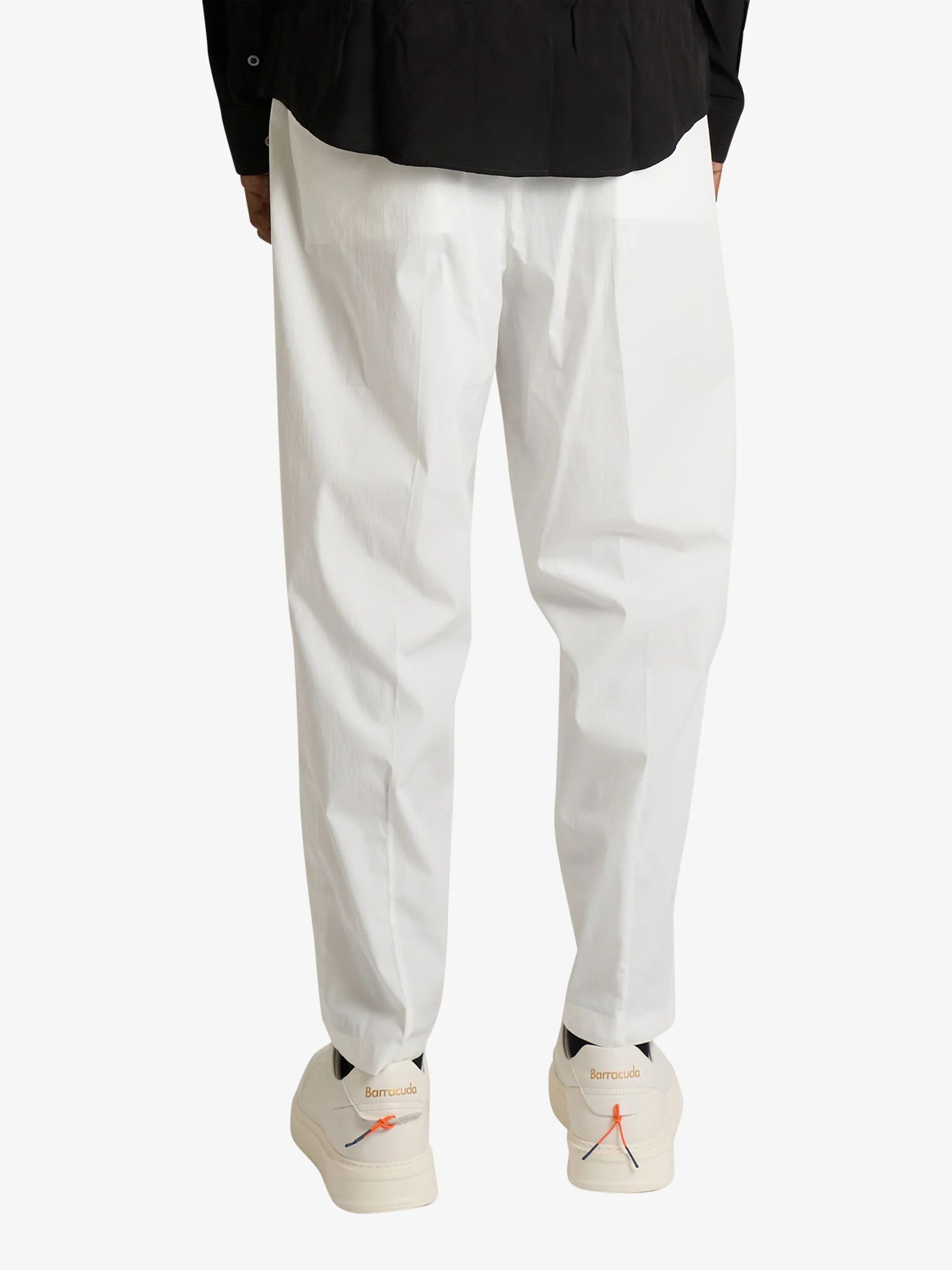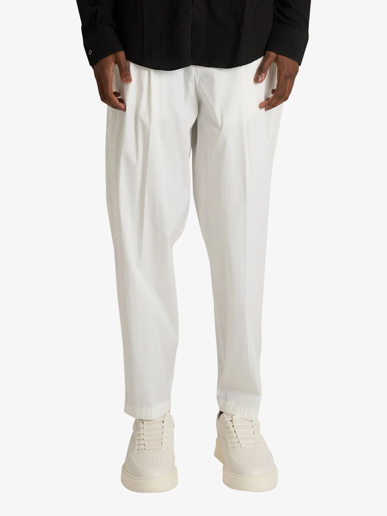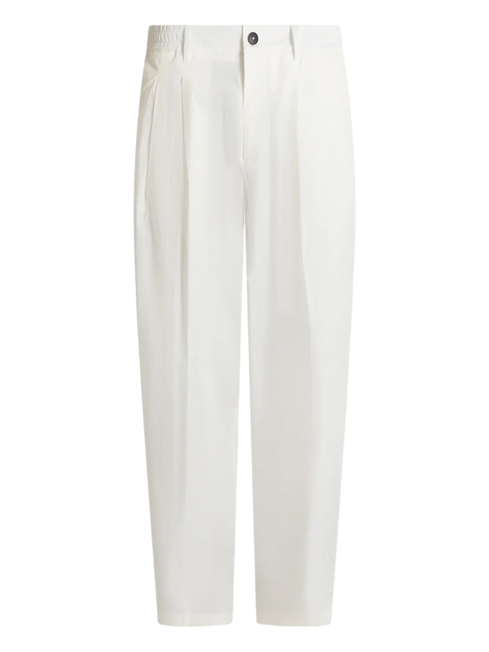 Pantalone in cotone bianco con vita elastizzata e chiusura bottone, chiusura fronale nascosta, piega frontale, regular fit