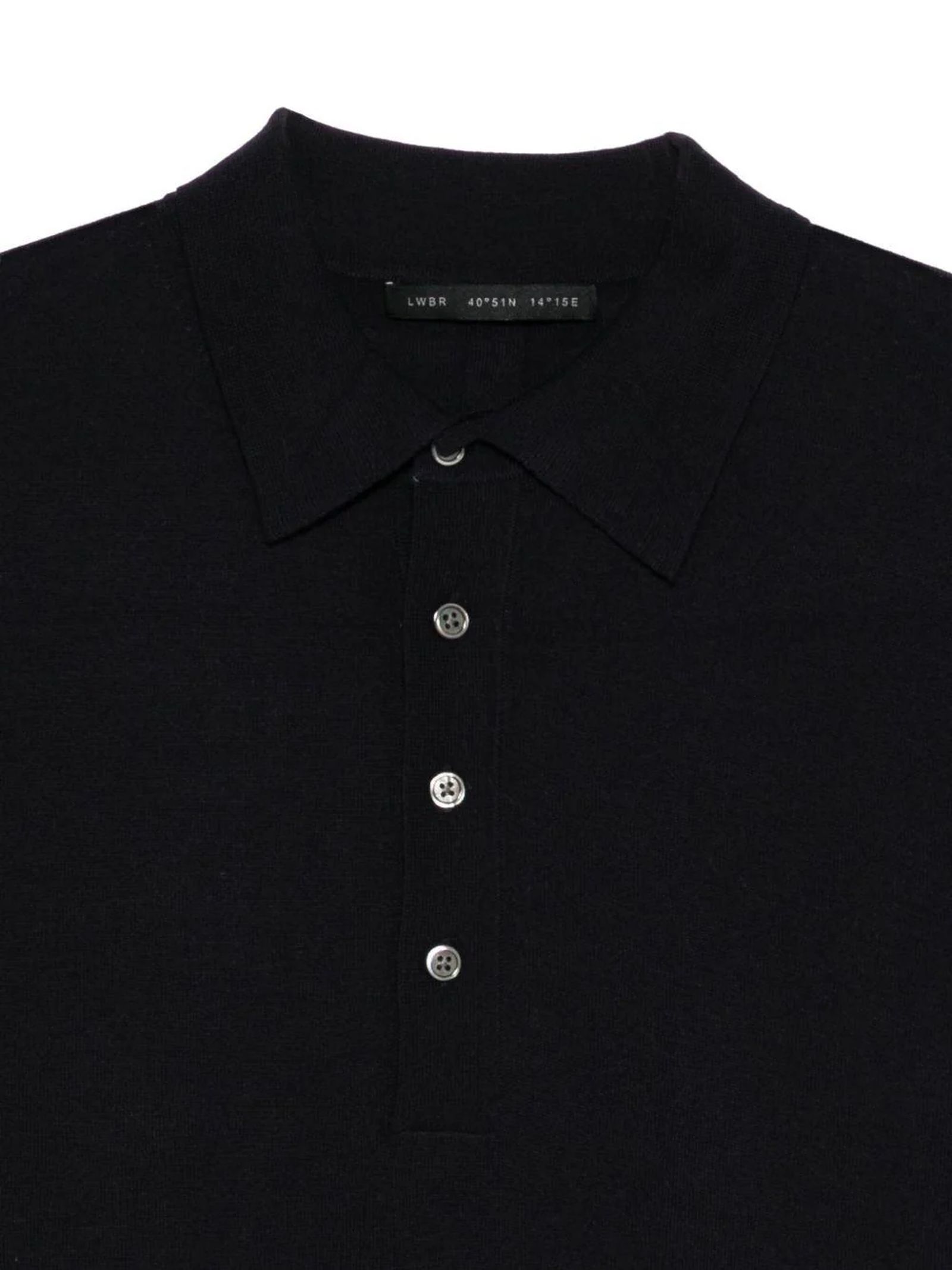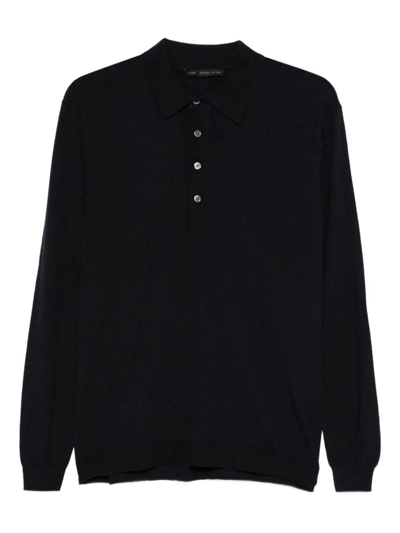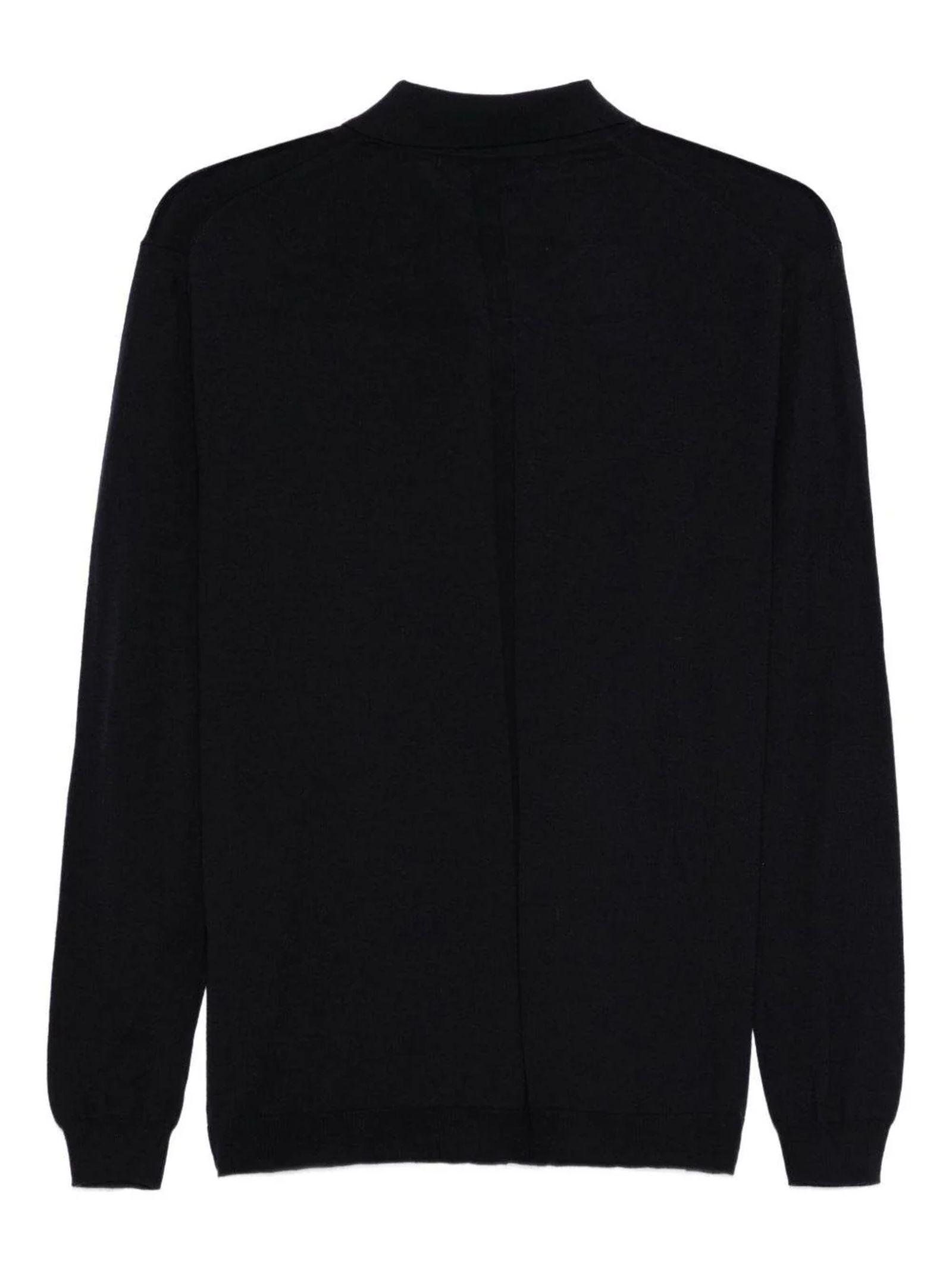 Polo in lana merino blu con chiusura frontale a quattro bottoni, colletto polo a costine, maniche lunghe, spalle morbide, dettaglio banda centrale lungo il retro, polsini e fondo a costine, maglia rasata, vestibilità regolare