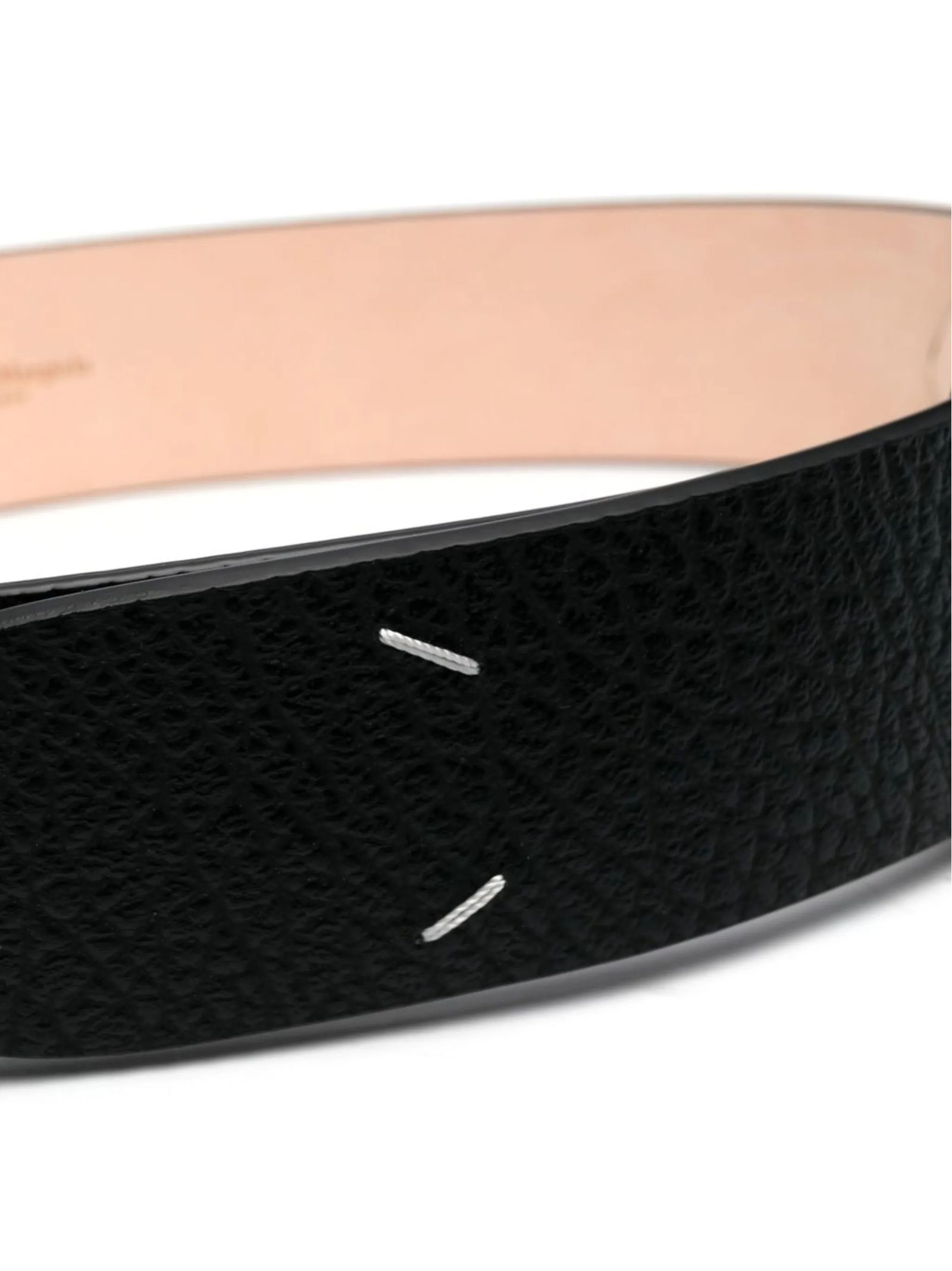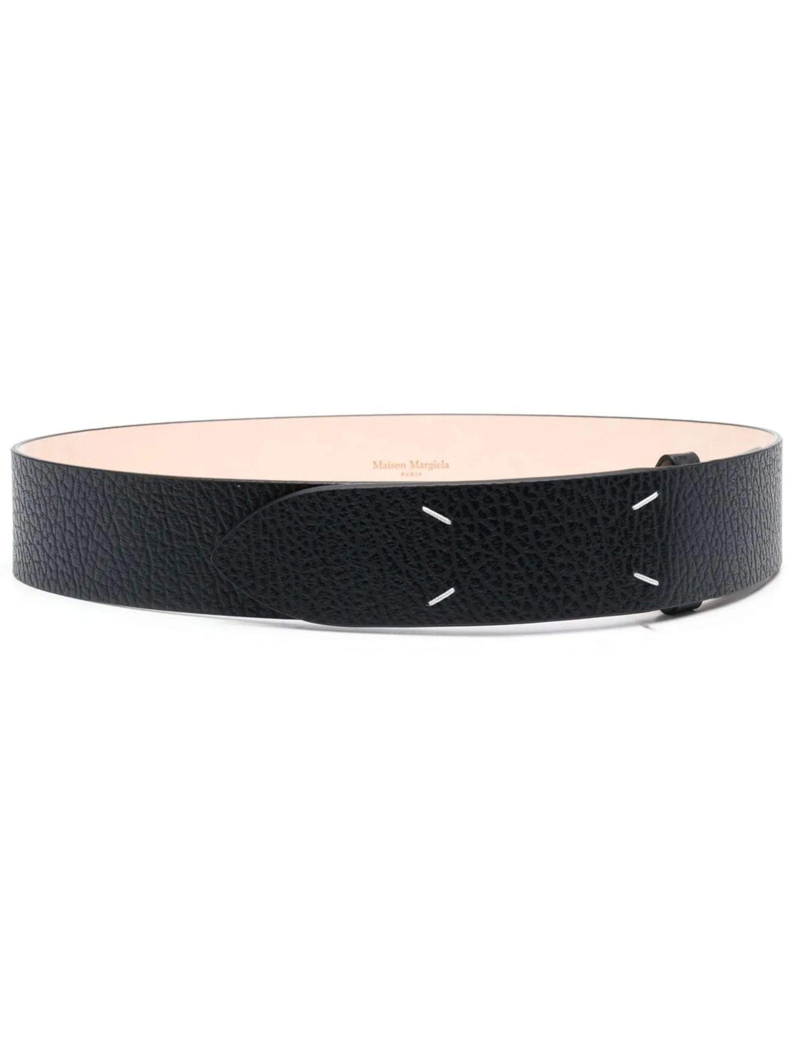 Cintura in pelle di vitello nero con 4 punti di cucitura, trama martellata, caratteristico logo con quattro punti di cucitura, passanti e design regolabile, larghezza 5 cm